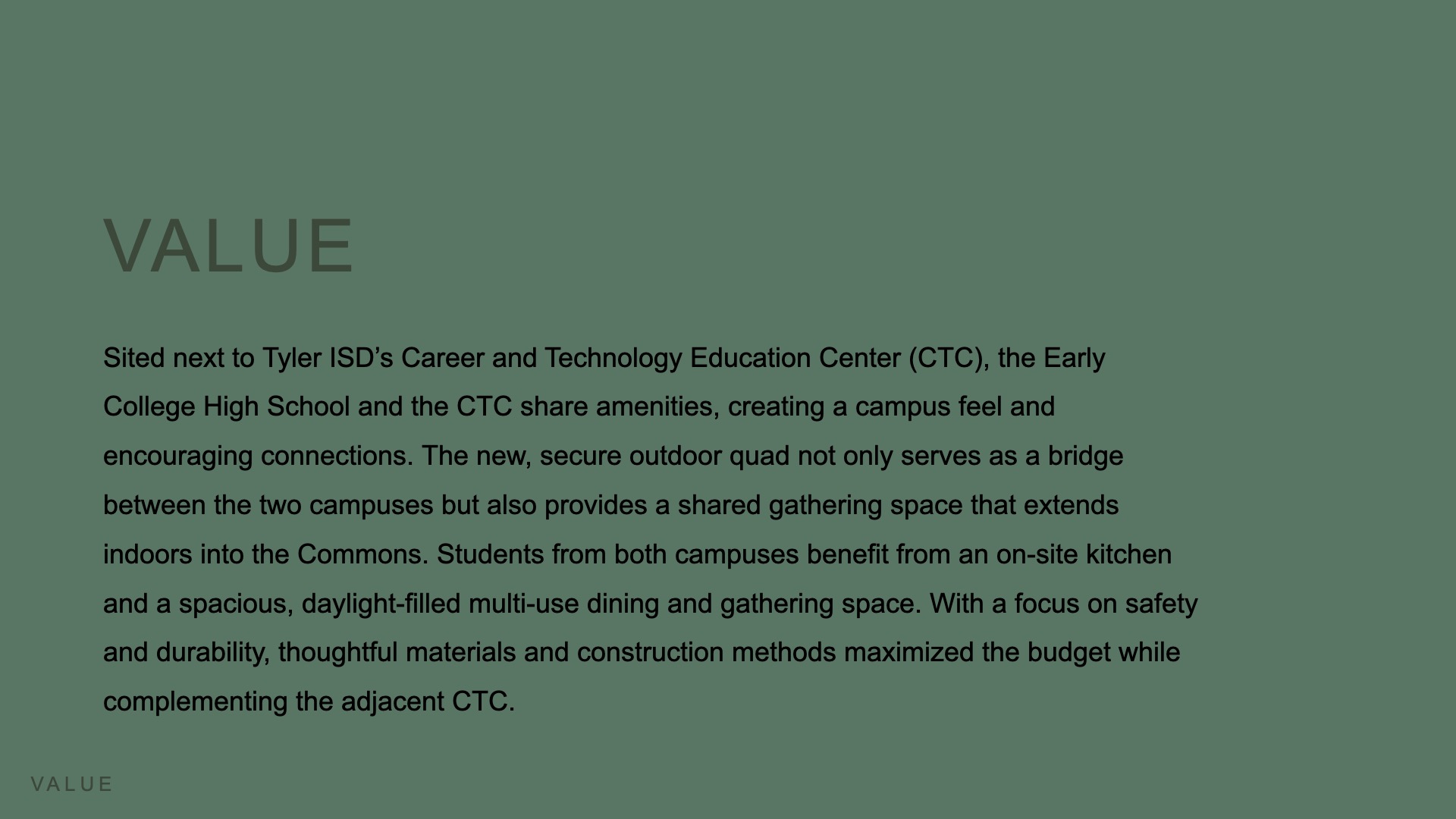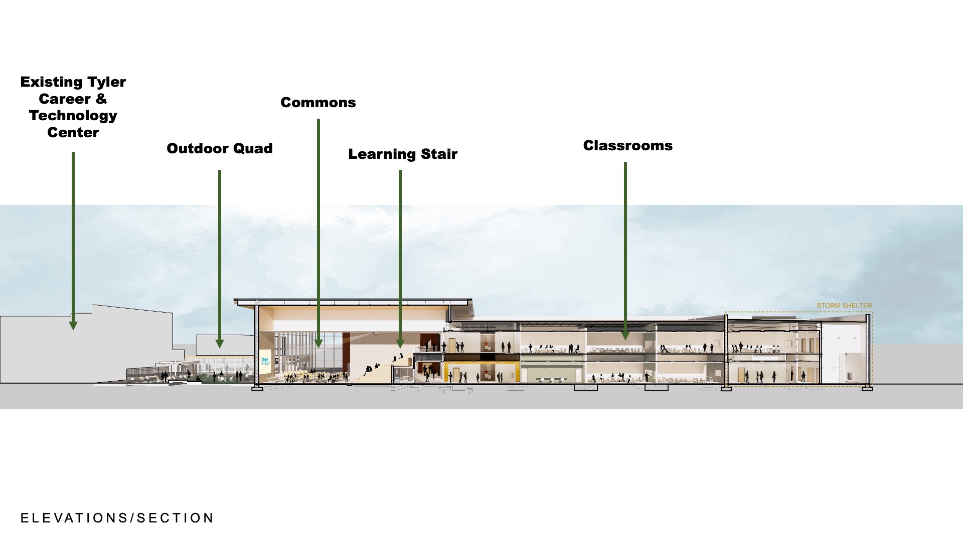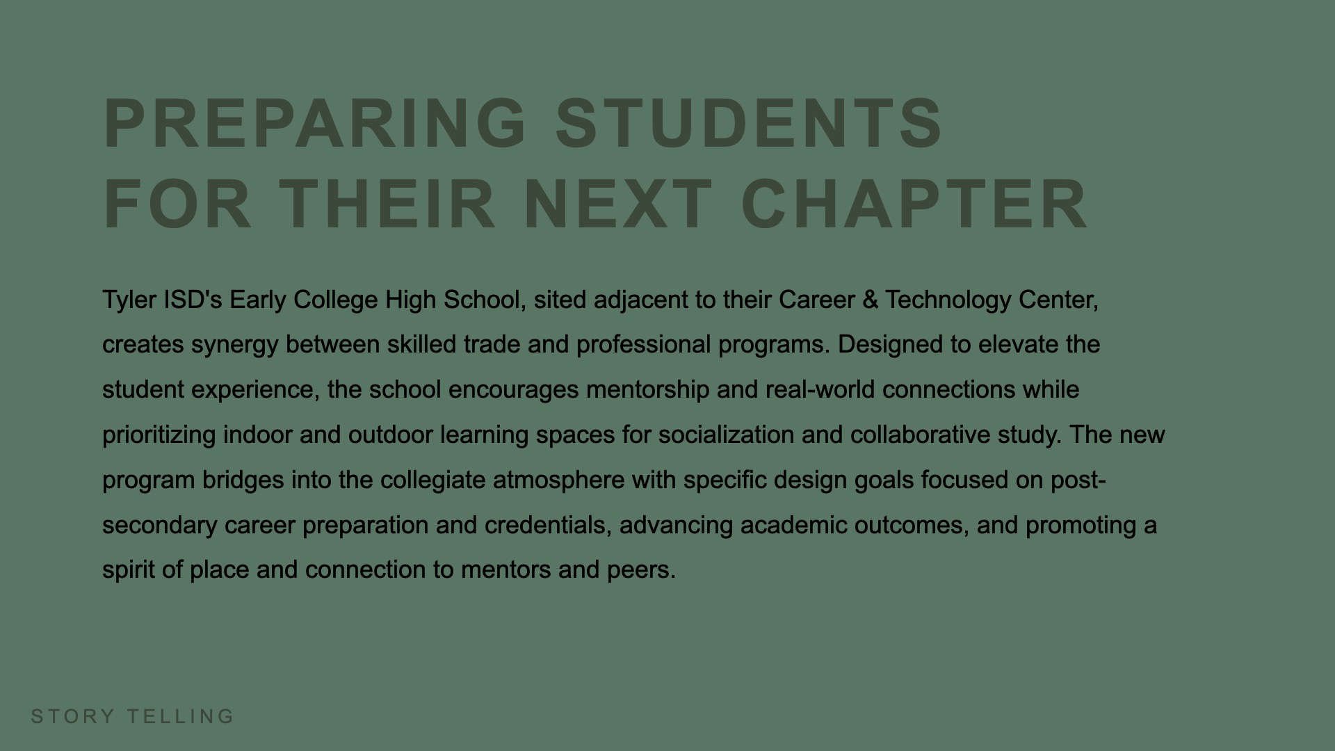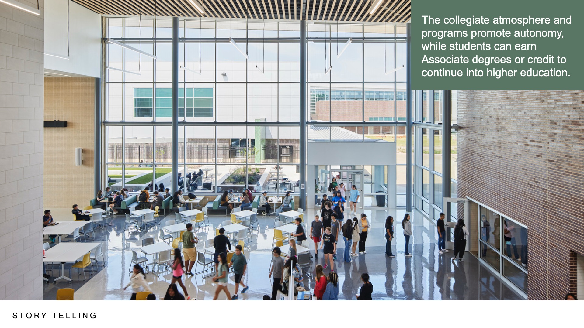 Driven by a vision to create a future-focused educational environment, the Early College High School (ECHS) embodies a collegiate atmosphere and a strong sense of place. This vision, developed in collaboration with the community, aimed to elevate the educational experience for its students. Recently ranked the #1 high school in East Texas, ECHS was planned to emulate a collegiate environment and prepare students for the next chapter. The design expands upon the certification programs offered by the adjacent Tyler Career and Technology Center (CTC), providing access to higher education to give students the opportunity to accelerate their learning goals, promoting socialization, and building connections.