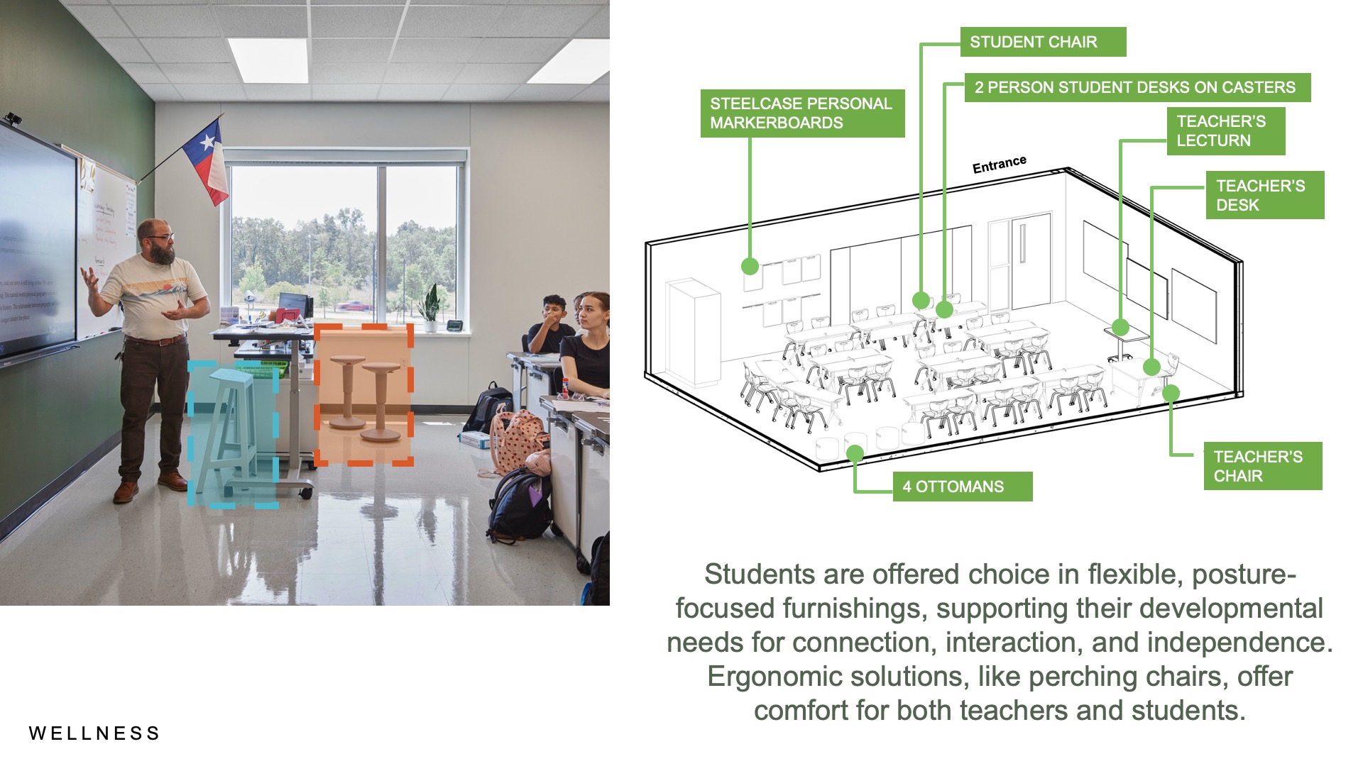 Aesthetic and functional connections to the surrounding natural environment integrate the restorative benefits of nature, balancing high academic demands. The outdoor quad serves as a place to restore, collaborate, connect, as well as offer moments of respite for students and faculty. Daylight, views, patterns, soft green tones, and natural materials provide a soothing atmosphere. While maximizing daylight in most educational spaces, the design team also leveraged a soft green paint in classrooms due to its calming and soothing effects, linked to stress and anxiety reduction. Students are offered choice in flexible, posture-focused furnishings, supporting their developmental needs for connection, interaction, and independence. Ergonomic solutions, like perching chairs, offer comfort for both teachers and students.