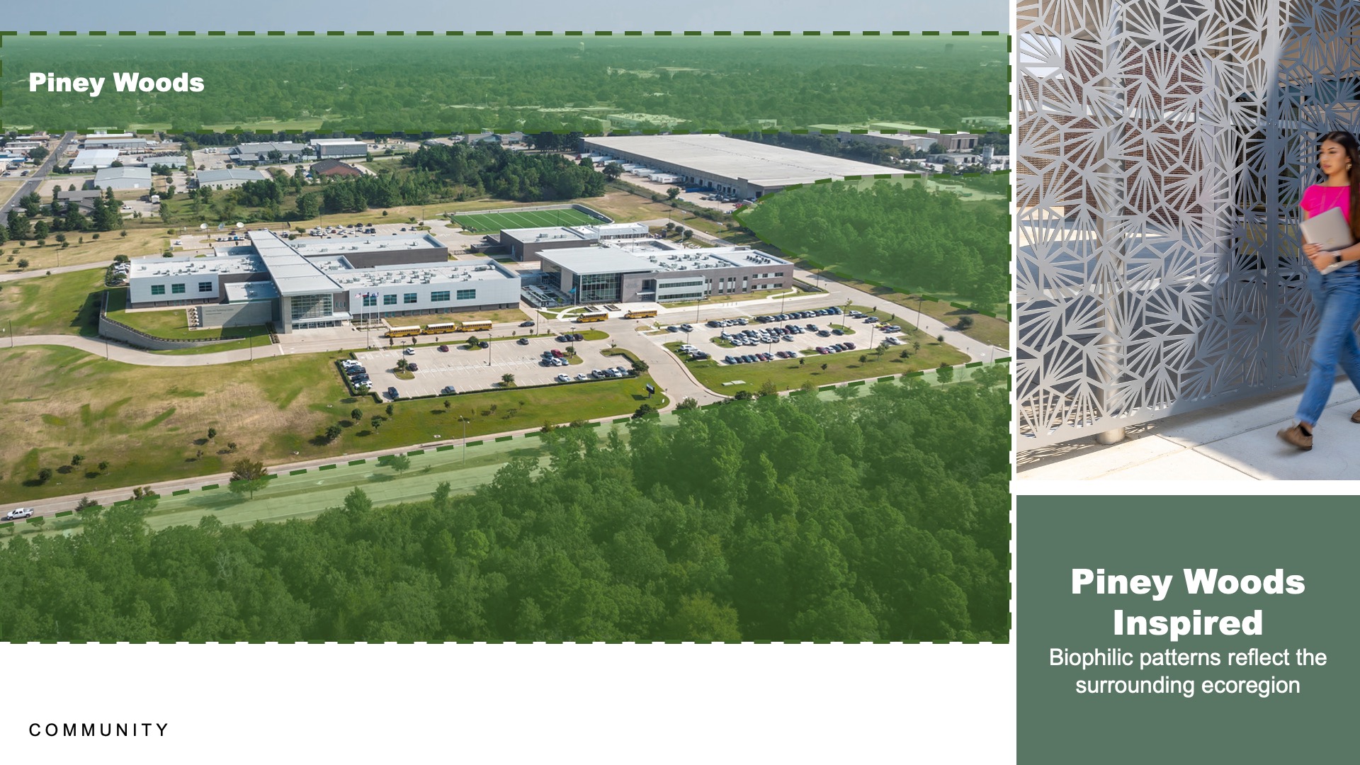 The new Early College High School (ECHS) complements the existing Tyler Career and Technical Center (CTC) on the same site, creating a cohesive collegiate-feeling campus. Celebrating Tyler ISD’s strong culture of learning and community pride, the ECHS facilitates community gatherings in the multi-use commons, including a large learning stair and direct connection to the outdoor learning space for large community events. The elevated, local ecoregion-inspired design and integrated graphics take inspiration from the surrounding Piney Woods. Through partnerships with local colleges, the ECHS emphasizes and provides pathways to regional universities, inspiring a culture of growth and encouraging students to work toward advanced education and career opportunities in the region.