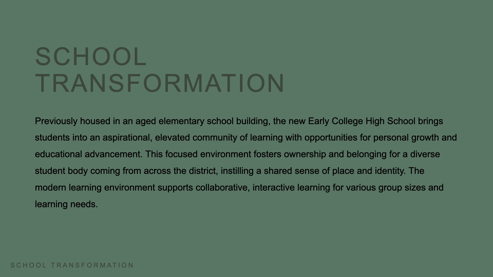 Previously housed in an aged elementary school building, the new Early College High School brings students into an aspirational, elevated community of learning with opportunities for personal growth and educational advancement. This focused environment fosters ownership and belonging for a diverse student body coming from across the district, instilling a shared sense of place and identity. The modern learning environment supports collaborative, interactive learning for various group sizes and learning needs.