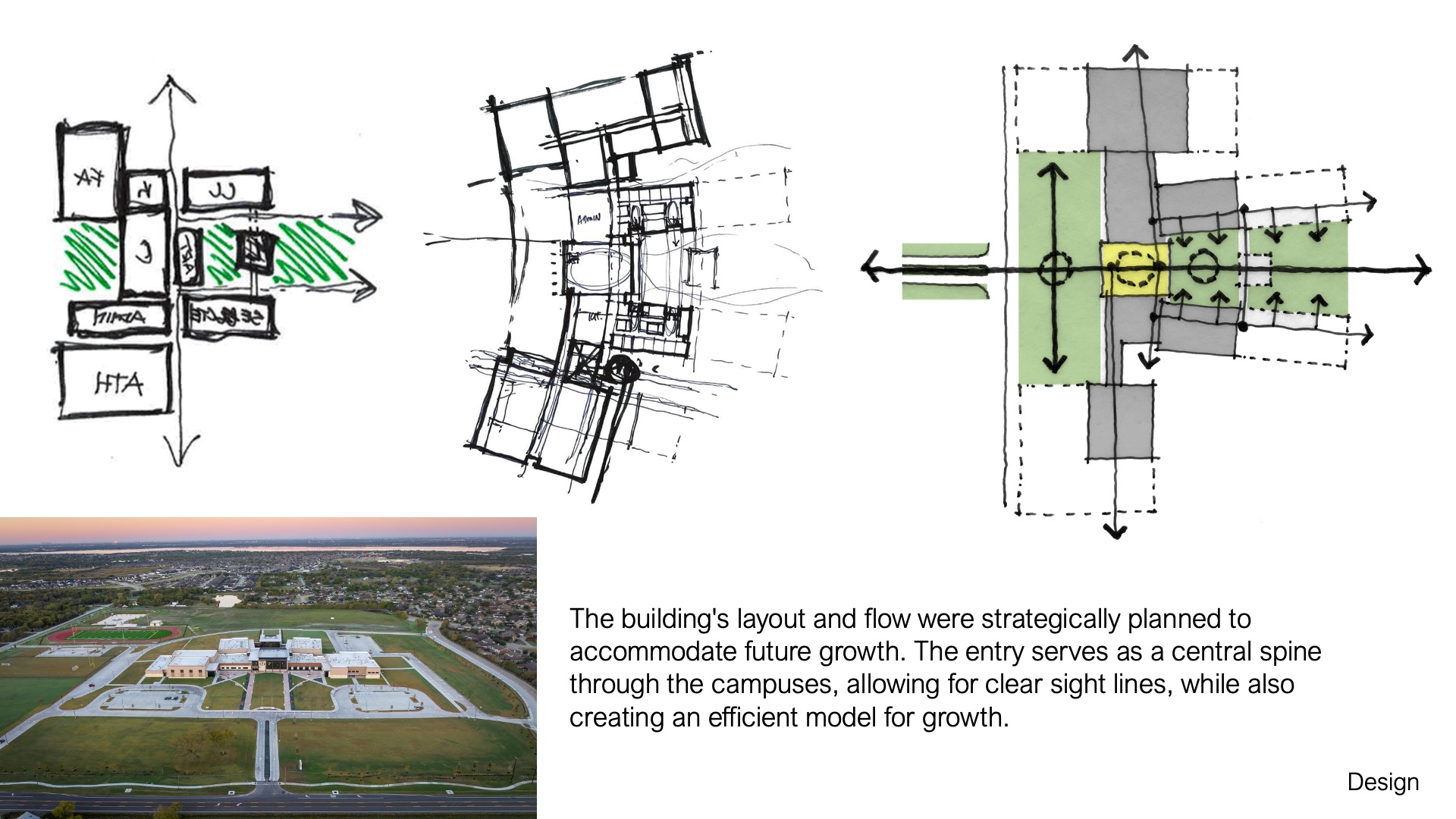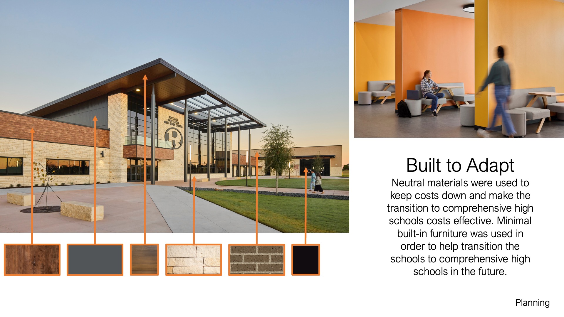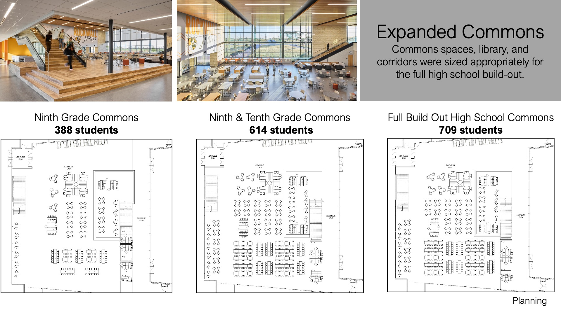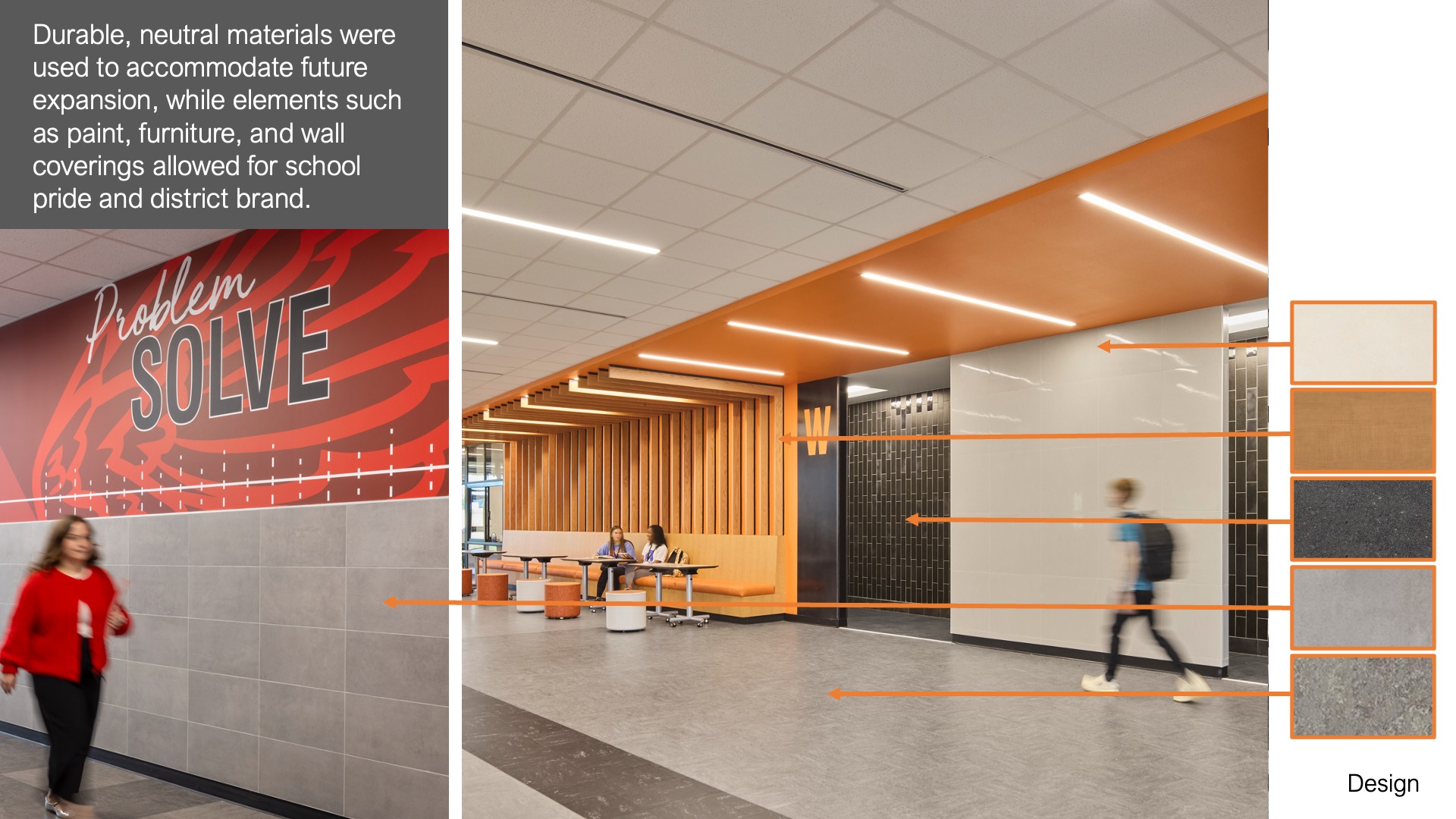 Master planned for a future tenth grade addition and full comprehensive high schools demonstrates the long-term vision for the district’s growth. The design emphasizes flexibility with minimal built-in furniture to adapt to future needs, and the strategic sizing of core elements, such as the commons, library, and corridors, meet the future demands of the high schools, thus reducing construction costs. Construction typologies in shared spaces and changeable graphics throughout create efficiencies for future phases.