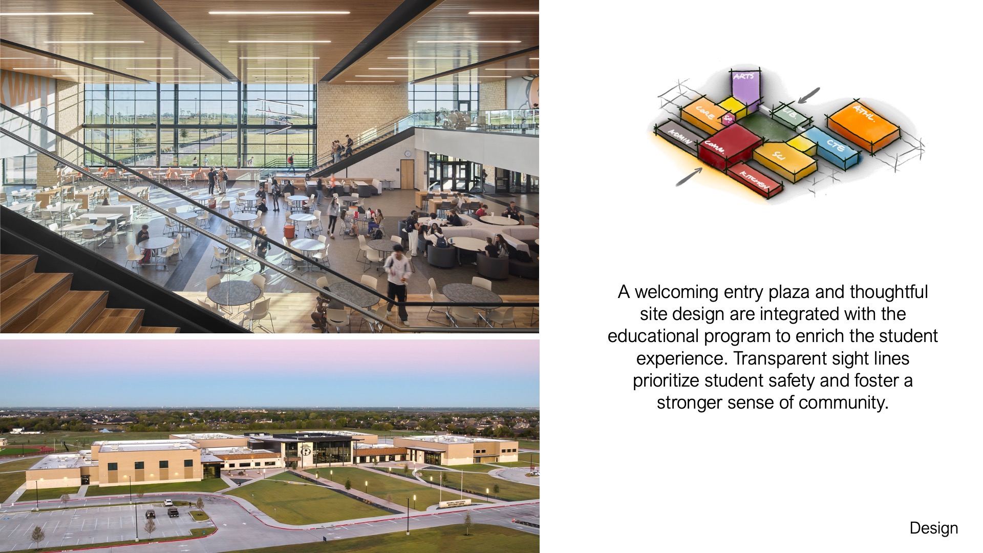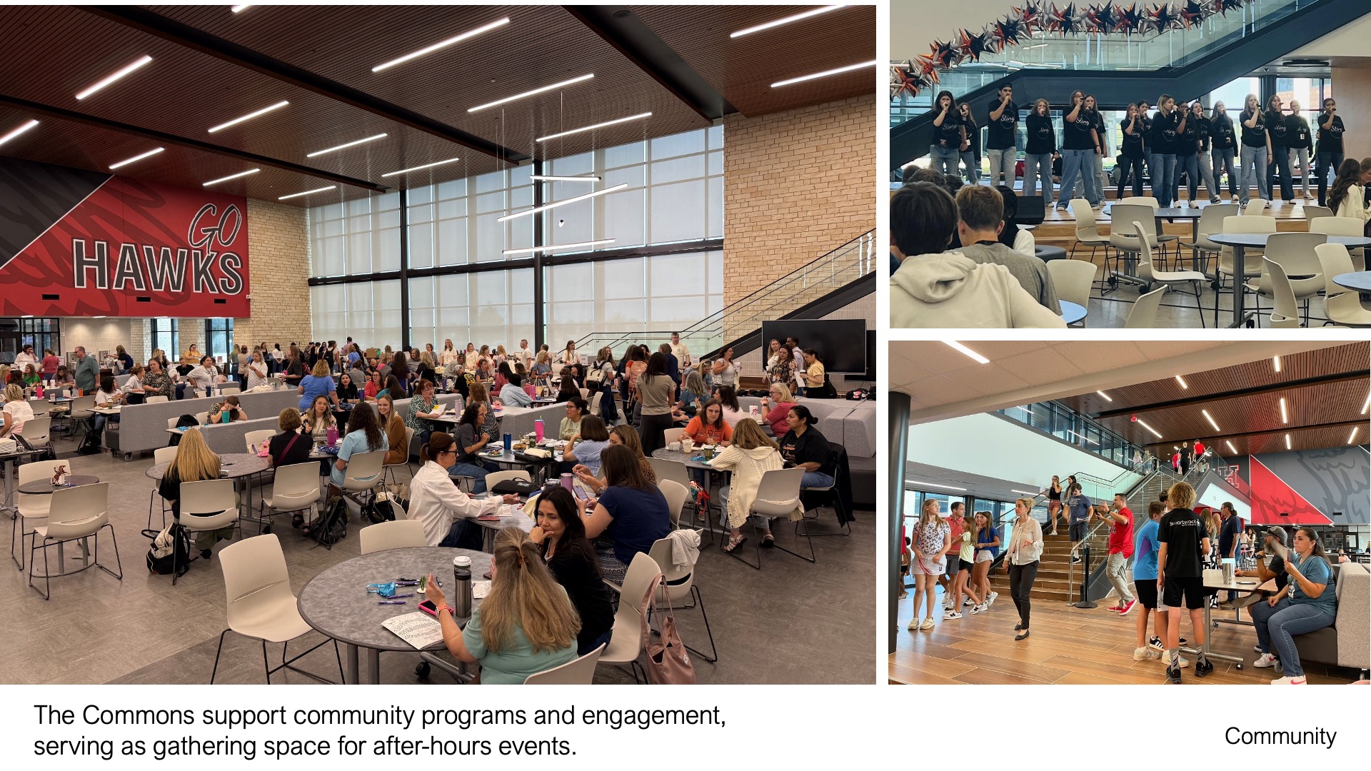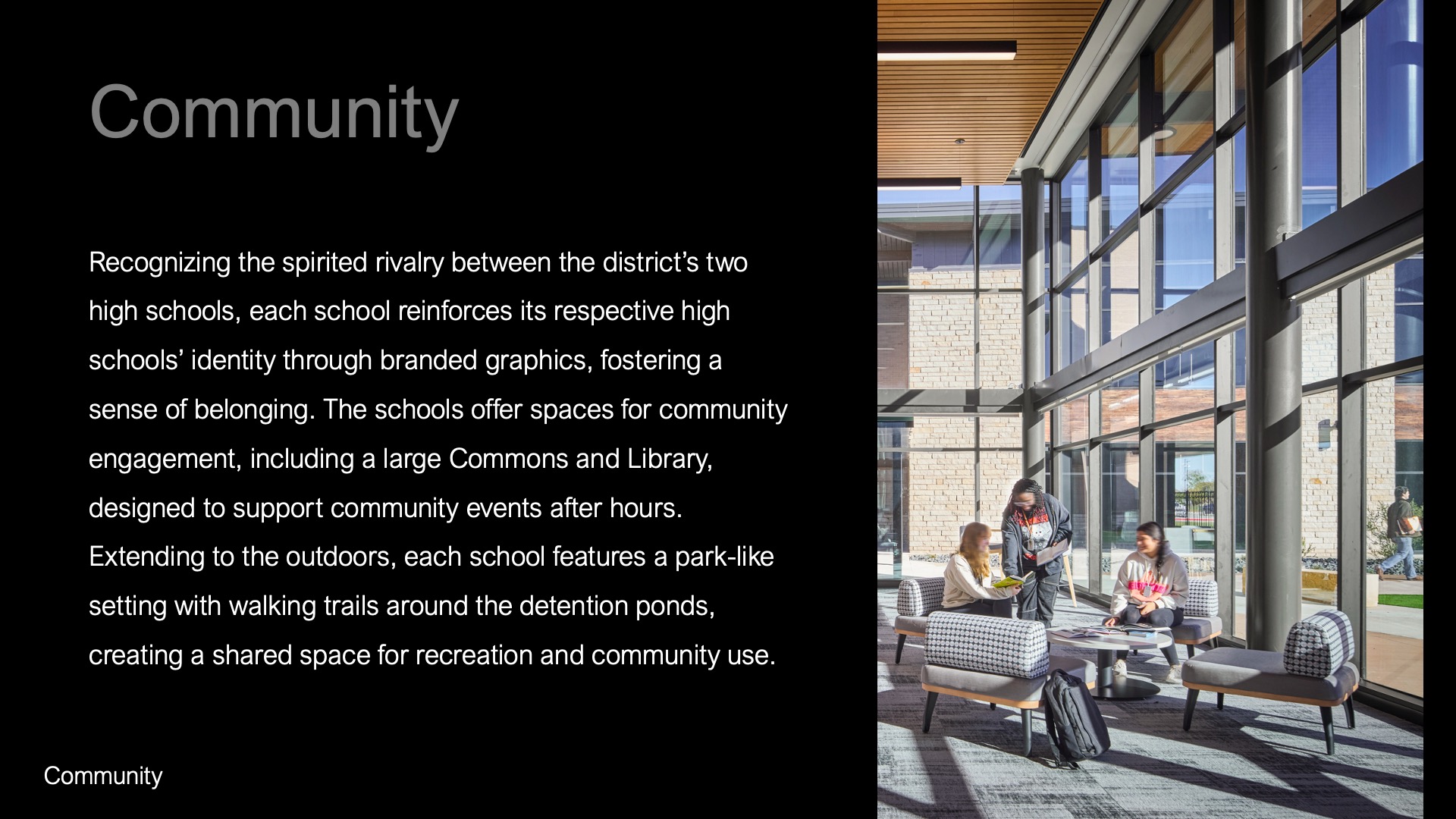 Recognizing the spirited rivalry between the district’s two high schools, each school reinforces its respective high schools’ identity through branded graphics, fostering a sense of belonging. The schools offer spaces for community engagement, including a large Commons and Library, designed to support community events after hours. Extending to the outdoors, each school features a park-like setting with walking trails around the detention ponds, creating a shared space for recreation and community use.