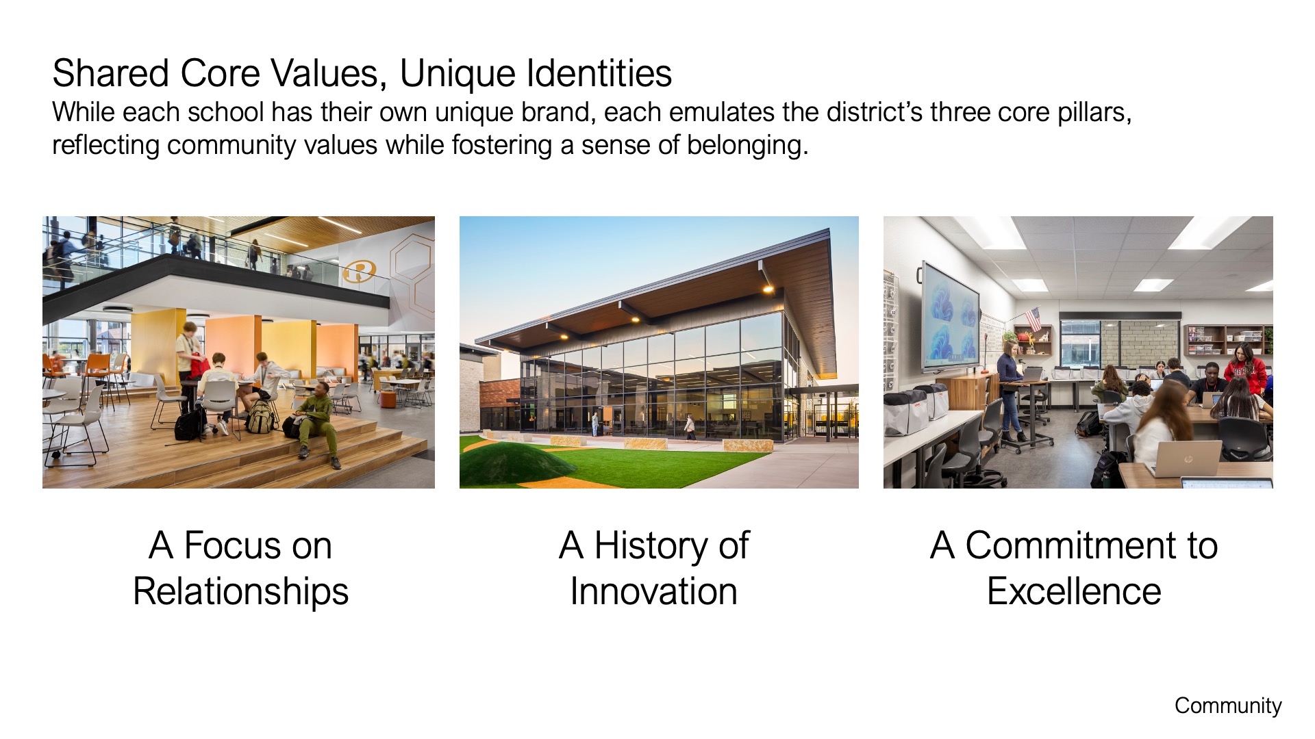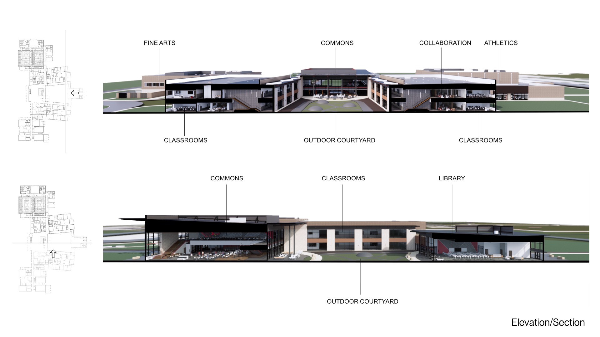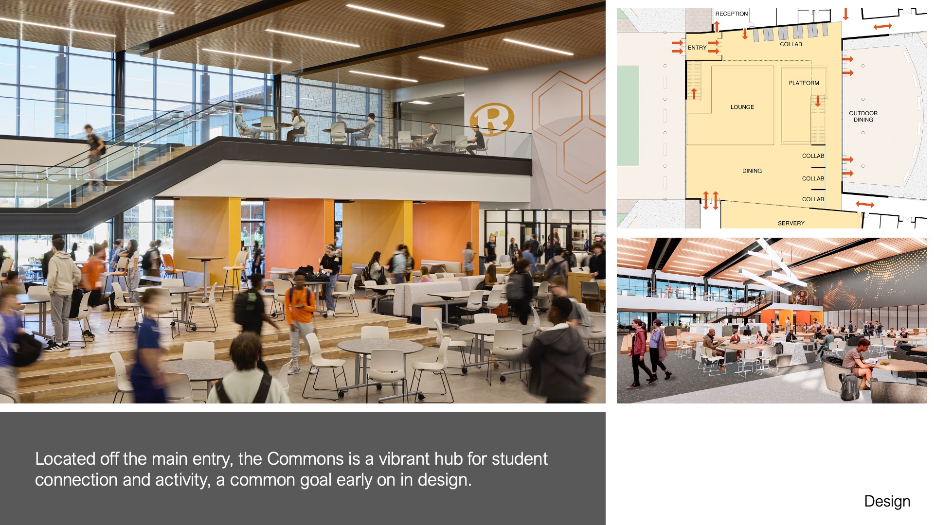 Recognizing the spirited rivalry between the district’s two high schools, each school reinforces its respective high schools’ identity through branded graphics, fostering a sense of belonging. The schools offer spaces for community engagement, including a large Commons and Library, designed to support community events after hours. Extending to the outdoors, each school features a park-like setting with walking trails around the detention ponds, creating a shared space for recreation and community use.