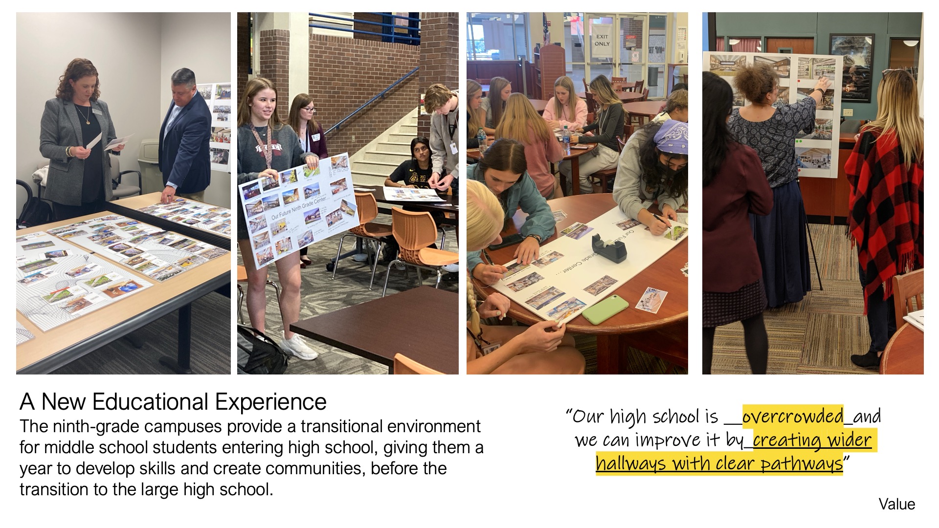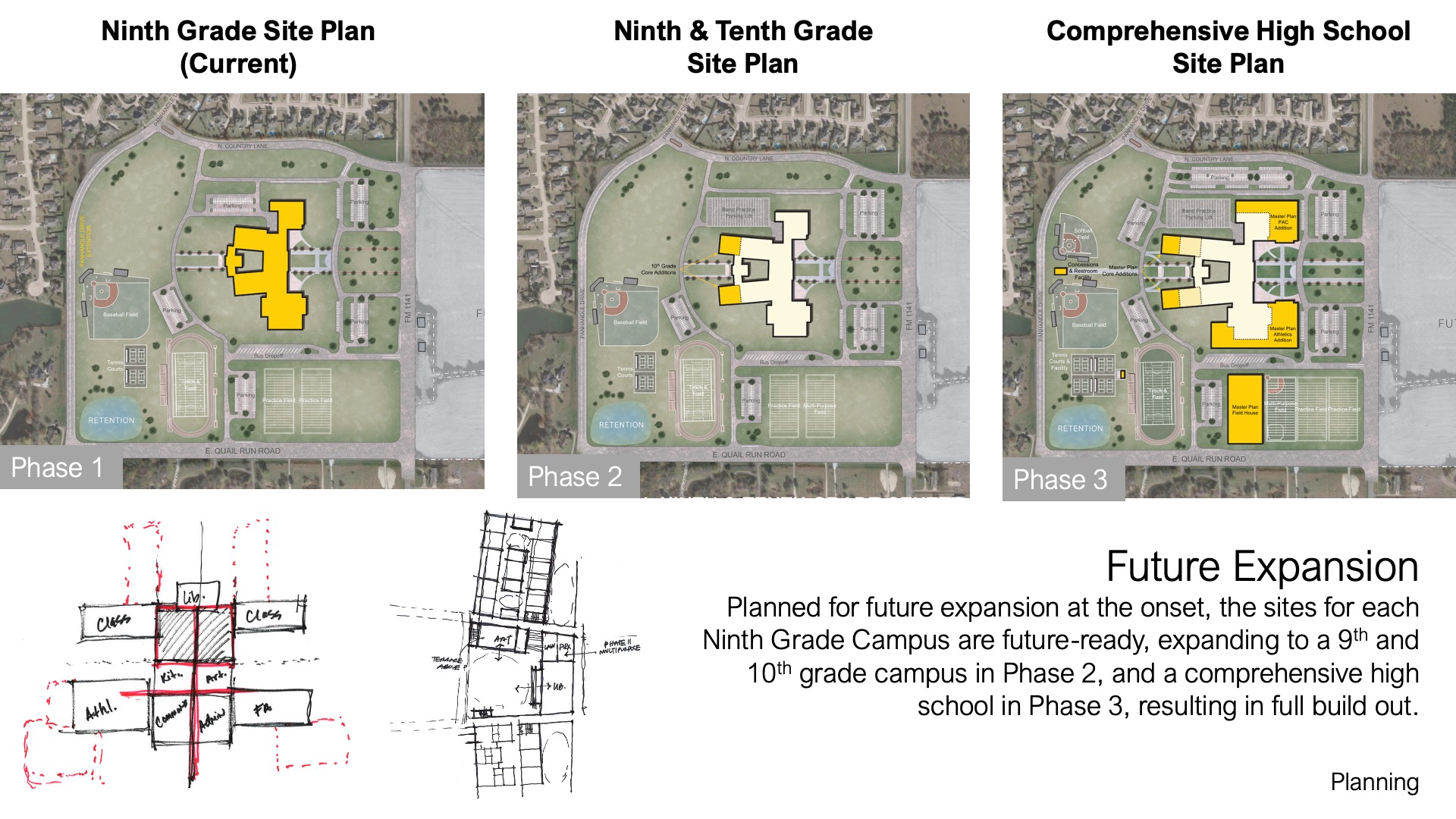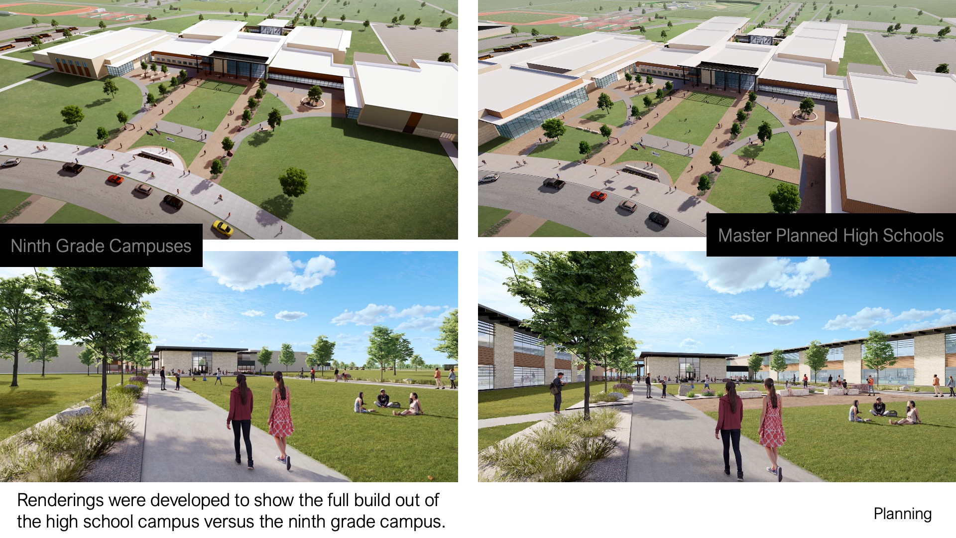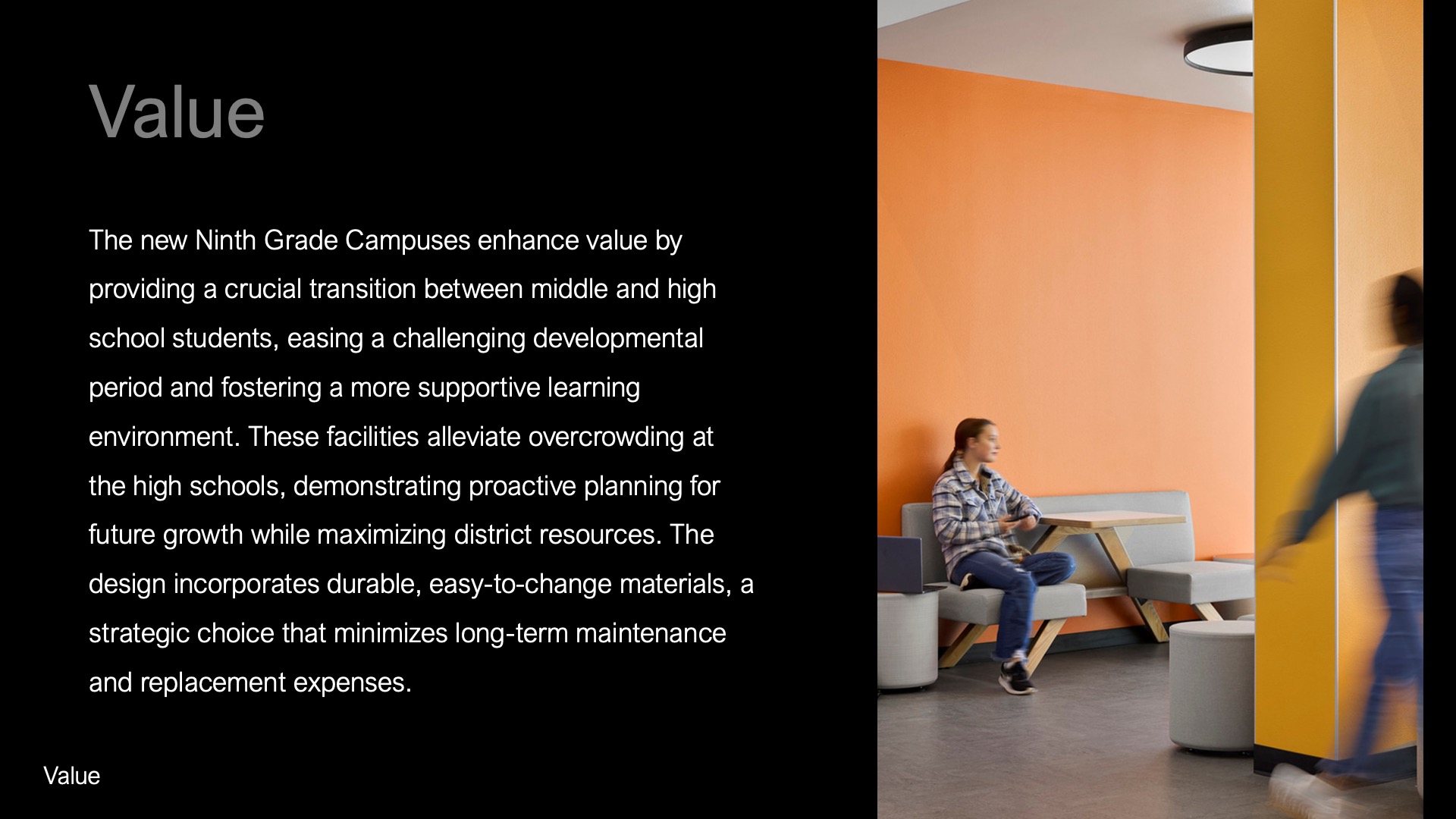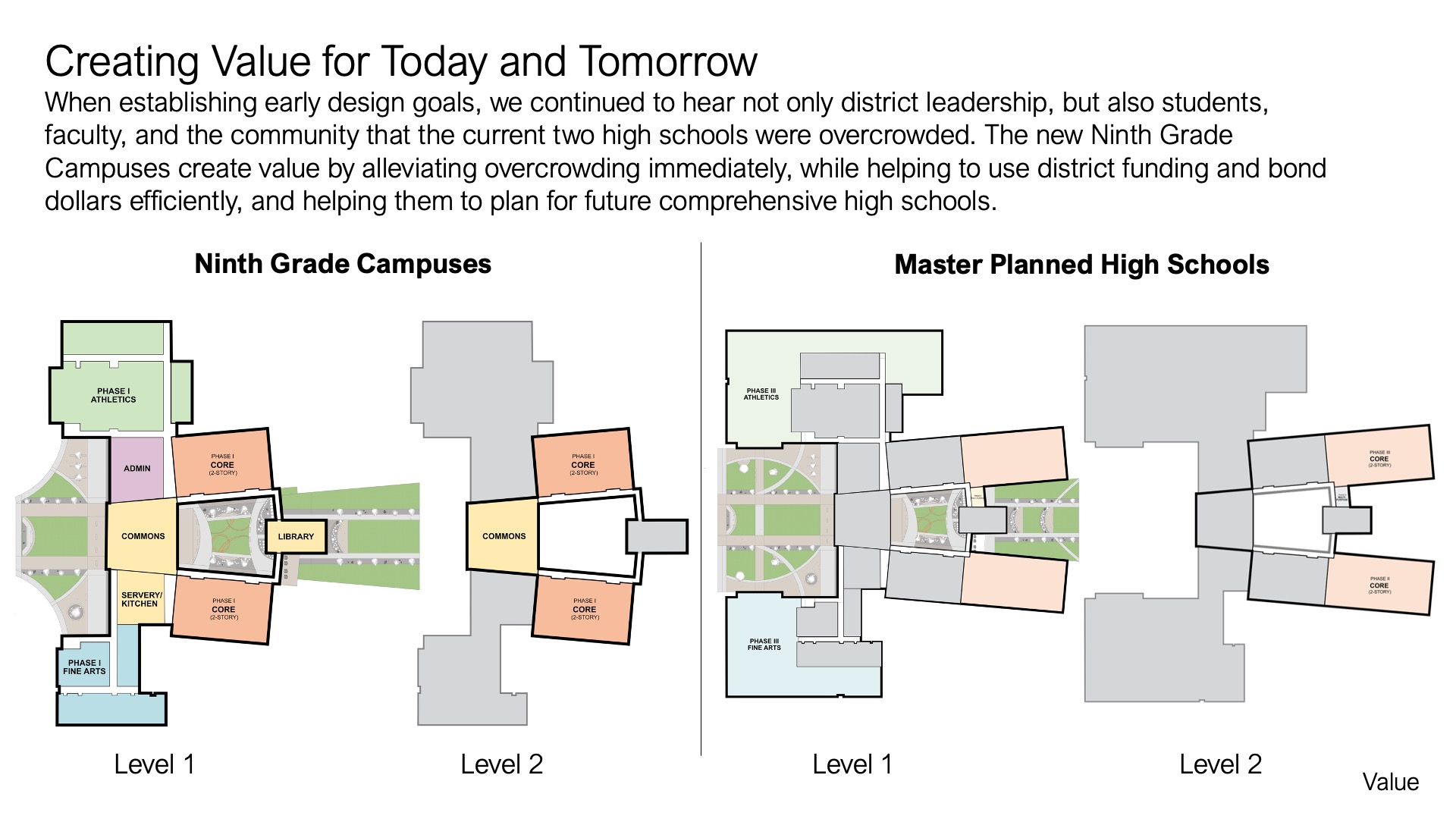 The new Ninth Grade Campuses enhance value by providing a crucial transition between middle and high school students, easing a challenging developmental period and fostering a more supportive learning environment. These facilities alleviate overcrowding at the high schools, demonstrating proactive planning for future growth while maximizing district resources. The design incorporates durable, easy-to-change materials, a strategic choice that minimizes long-term maintenance and replacement expenses.