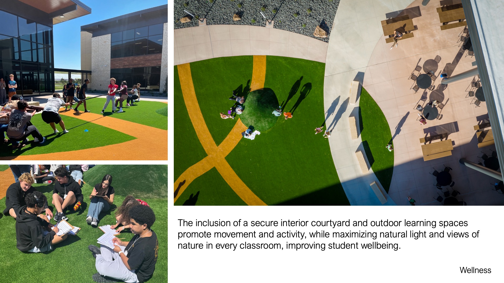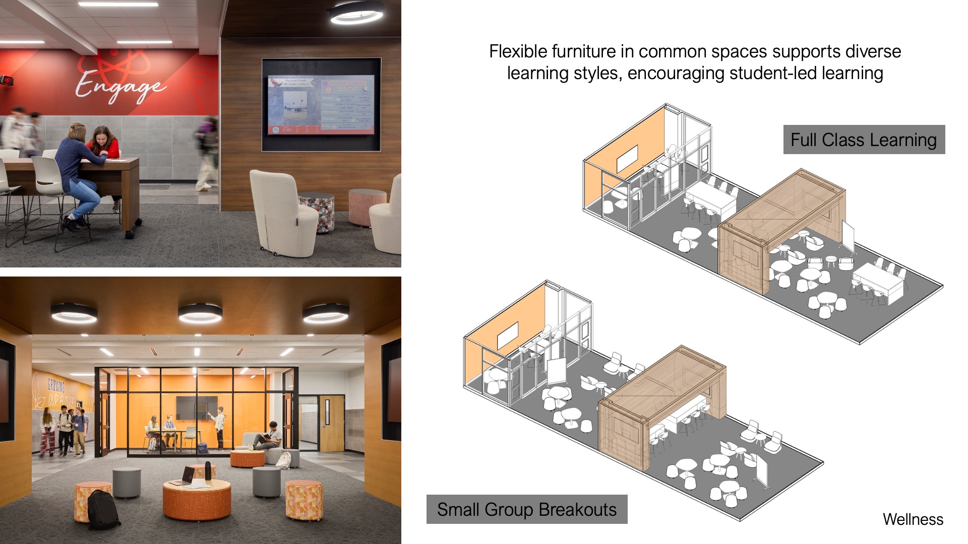 The inclusion of a secure interior courtyard and outdoor learning spaces promote movement and activity, while maximizing natural light and views of nature in every classroom, improving student wellbeing. Flexible furniture in common spaces supports diverse learning styles, encouraging student-led learning. The design aligns with adolescents’ developmental need for autonomy, competence, and connection, easing the transition to high school by providing a supportive, inspiring environment.