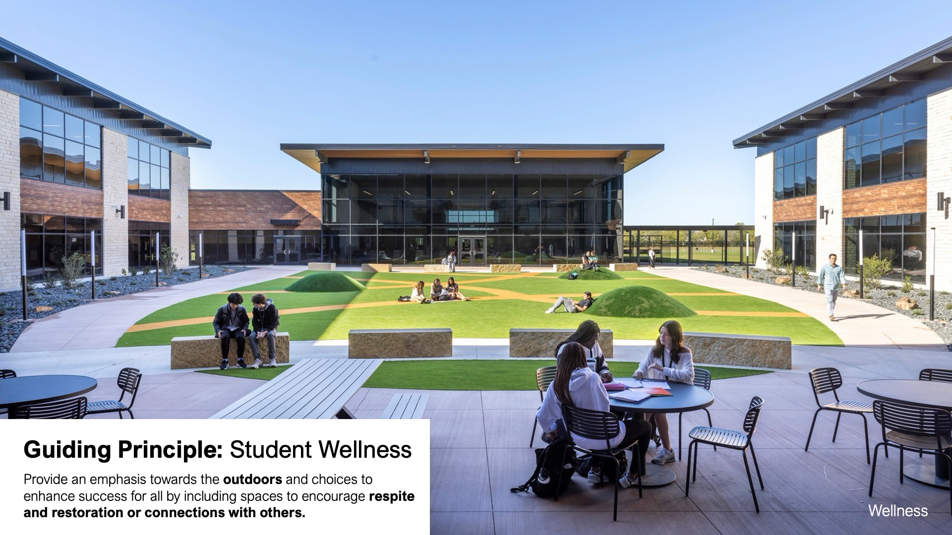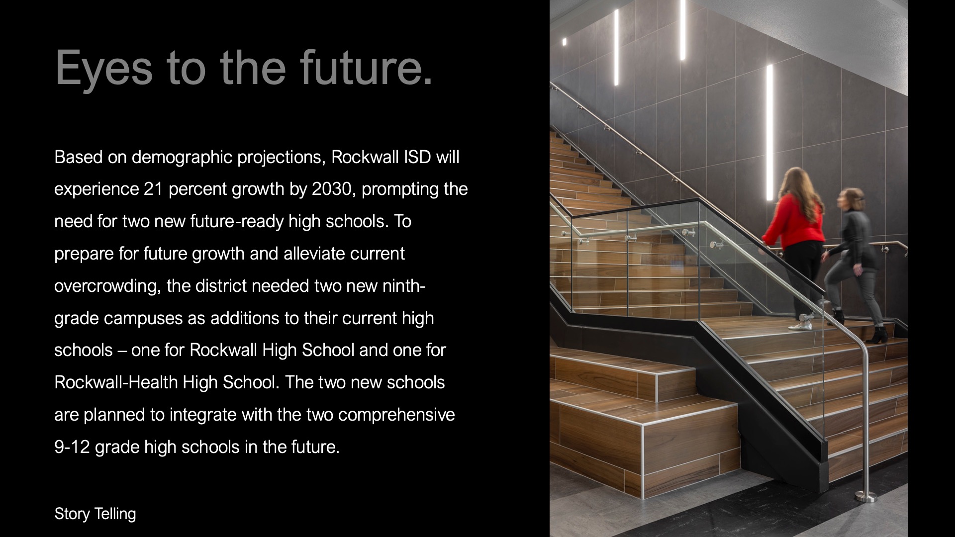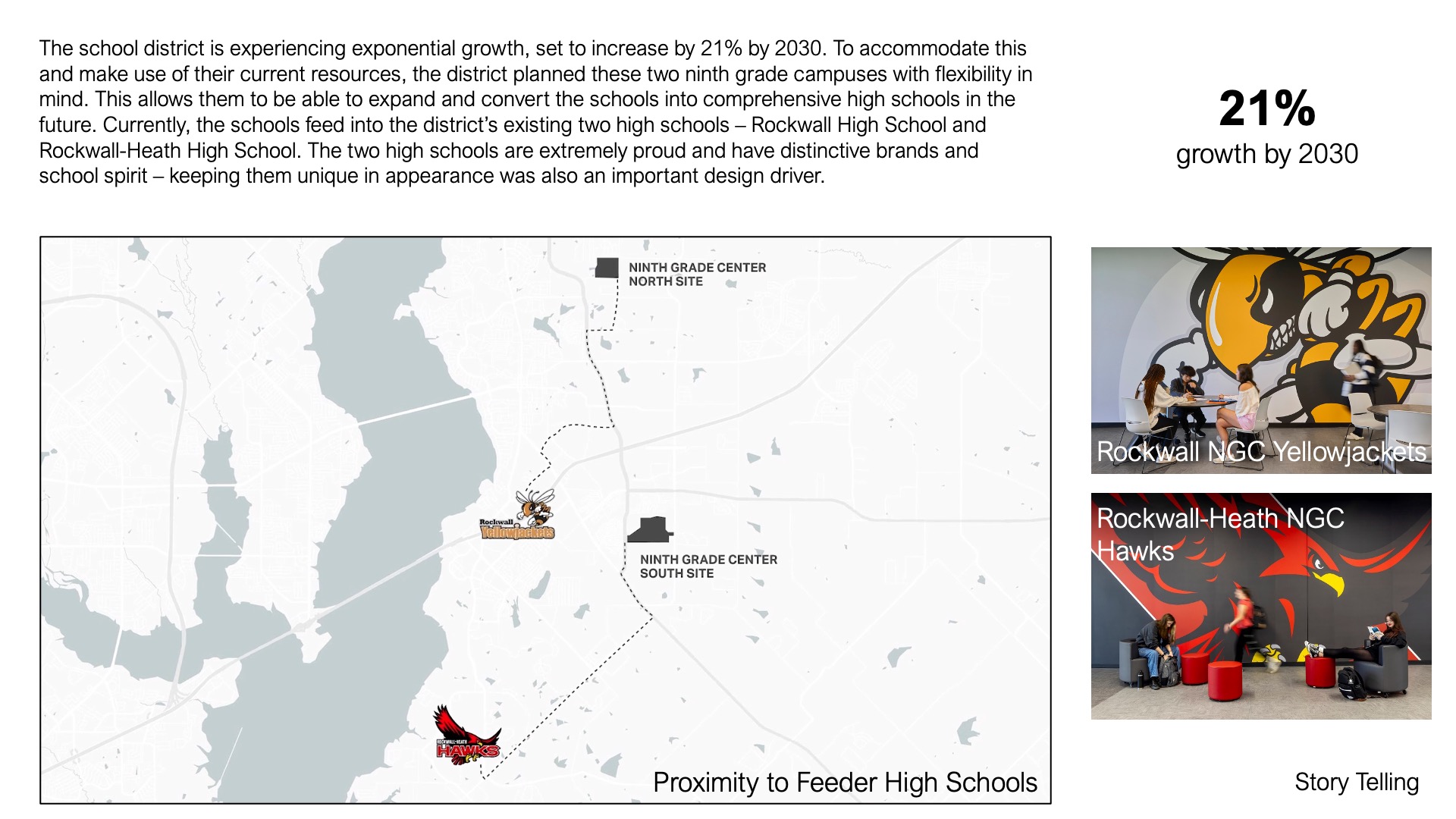 Based on demographic projections, Rockwall ISD will experience 21 percent growth by 2030, prompting the need for two new future-ready high schools. To prepare for future growth and alleviate current overcrowding, the district needed two new ninth-grade campuses as additions to their current high schools – one for Rockwall High School and one for Rockwall-Health High School. The two new schools are planned to integrate with the two comprehensive 9-12 grade high schools in the future. The ninth-grade campuses were designed to prepare students for high school, focusing on student wellness, creating a spirit of place, enhancing the educational experience through accessible and flexible spaces, and building connections to encourage socialization. While each campus was designed with durable, neutral materials, each school the two schools reflects the high school’s distinctive brand, creating a pride of place and community.