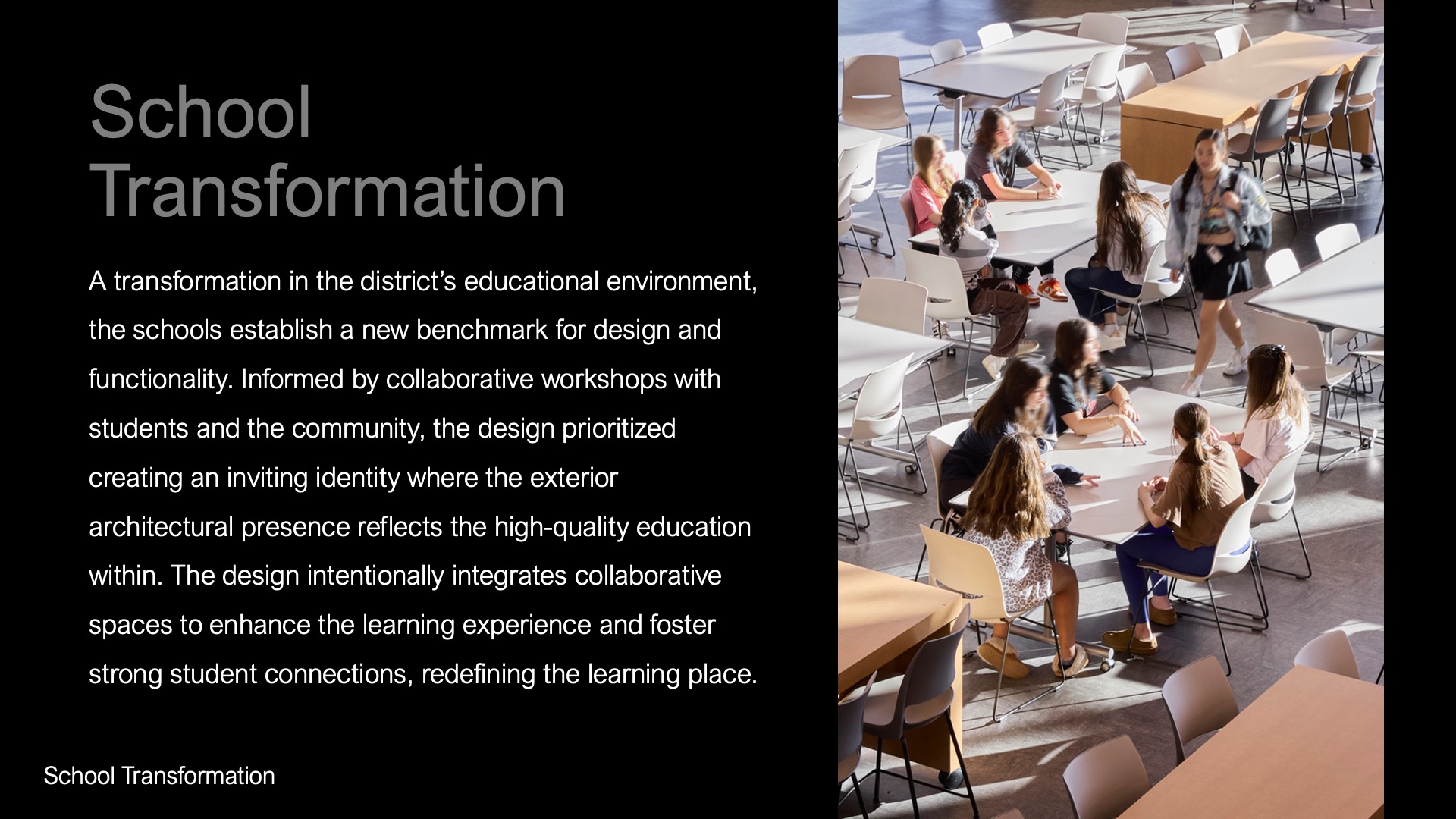 A transformation in the district’s educational environment, the schools establish a new benchmark for design and functionality. Informed by collaborative workshops with students and the community, the design prioritized creating an inviting identity where the exterior architectural presence reflects the high-quality education within. The design intentionally integrates collaborative spaces to enhance the learning experience and foster strong student connections, redefining the learning place.