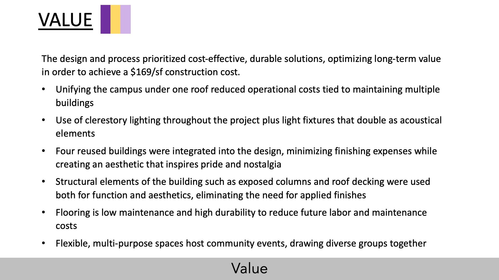 Many cost obstacles were overcome throughout this project including building material price increases due to COVID impacts and supply chain issues that influenced prices, yet the shocking $169 per square-foot cost was achieved through the relentless dedication of District staff and firm team members.”