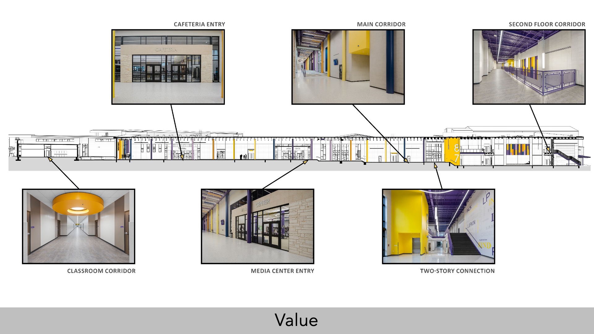 The four reused buildings were integrated into the design, their brick exteriors harmonized with modern, low-maintenance materials like high-performance glazing and durable flooring, reducing life cycle costs and preserving district funds. The exposed building structure, incorporated as a design feature, minimized finishing expenses while creating an aesthetic that inspires pride and nostalgia in the community.