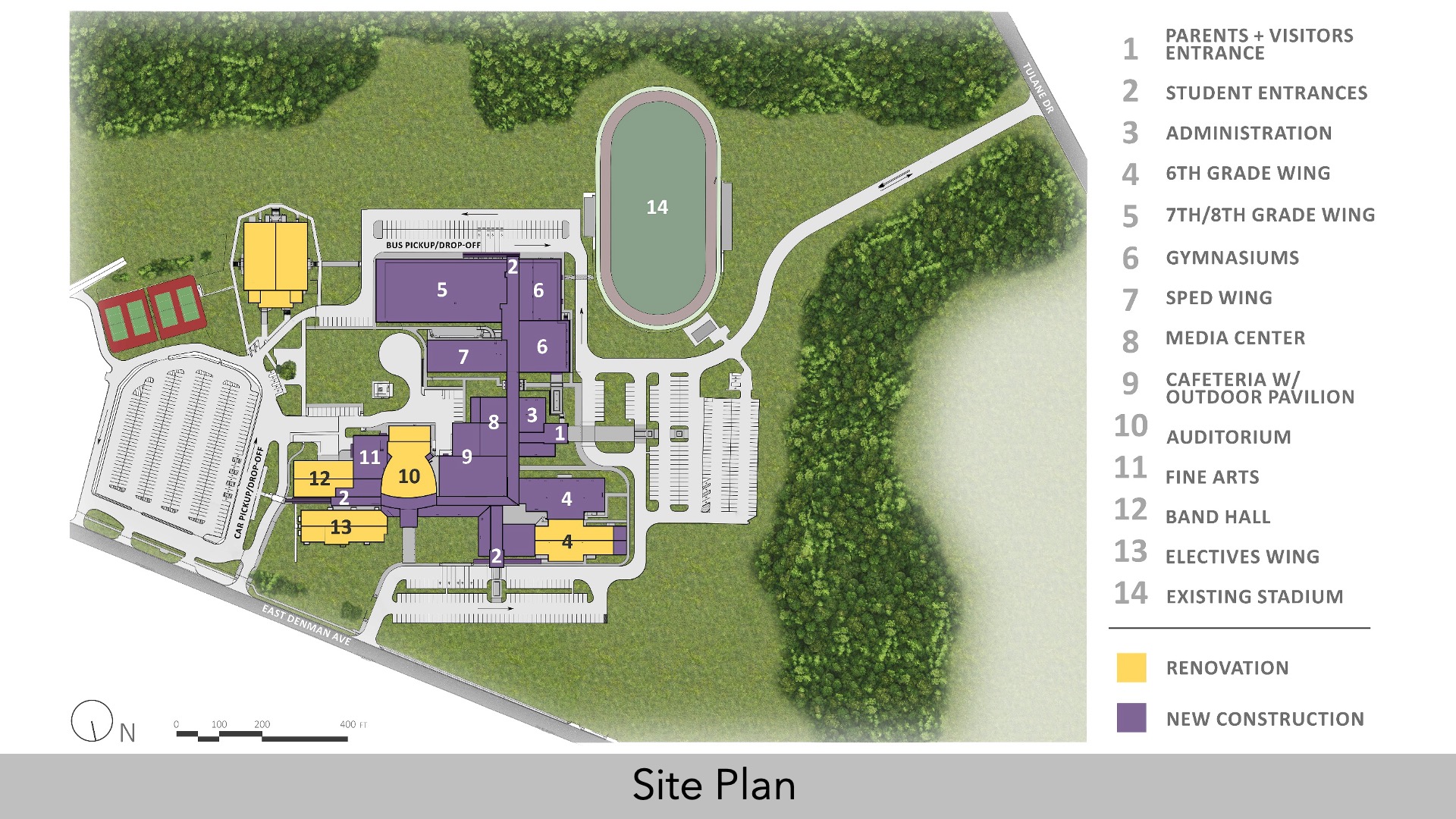 Spacious corridors throughout the design ensure smooth transitions, with state-of-the-art security systems resolving past vulnerabilities. The multi-level site provides additional room for students while connecting spaces seamlessly and securely. All types of student needs were considered in the design. A large Special Education Center is centrally located with a designated outdoor entrance for optimal accessibility. In a separate area, a dedicated 6th-grade academy creates a nurturing environment for younger learners, easing their transition into middle school. Flexible classrooms adapt to diverse teaching styles and spaces were created to give teachers multiple options to communicate curriculum such as outdoor classrooms, college style lecture hall rooms and discovery lab spaces. The modernized media center empowers students with resources for technology and research and gives comfortable spaces for collaboration.