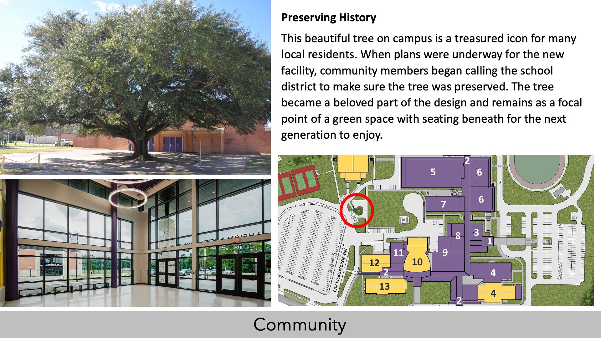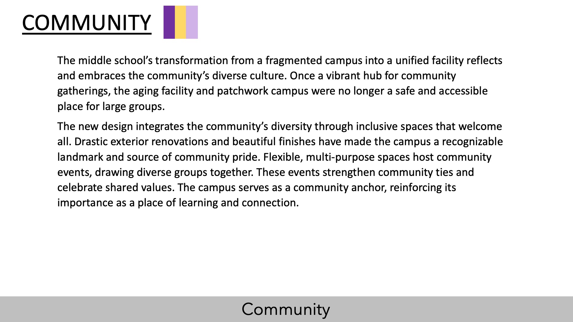 The new design integrates the community’s diversity through inclusive spaces that welcome all. Drastic exterior renovations and beautiful finishes have made the campus a recognizable landmark and source of community pride. Flexible, multi-purpose spaces host community events, drawing diverse groups together. These events, absent in the old campus due to space limitations, strengthen community ties and celebrate shared values. By hosting town halls, performances and sporting events, the campus serves as a community anchor, reinforcing its importance as a place of learning and connection. This project has revitalized a vibrant hub that is now accessible to everyone and fosters belonging while celebrating local school pride.”