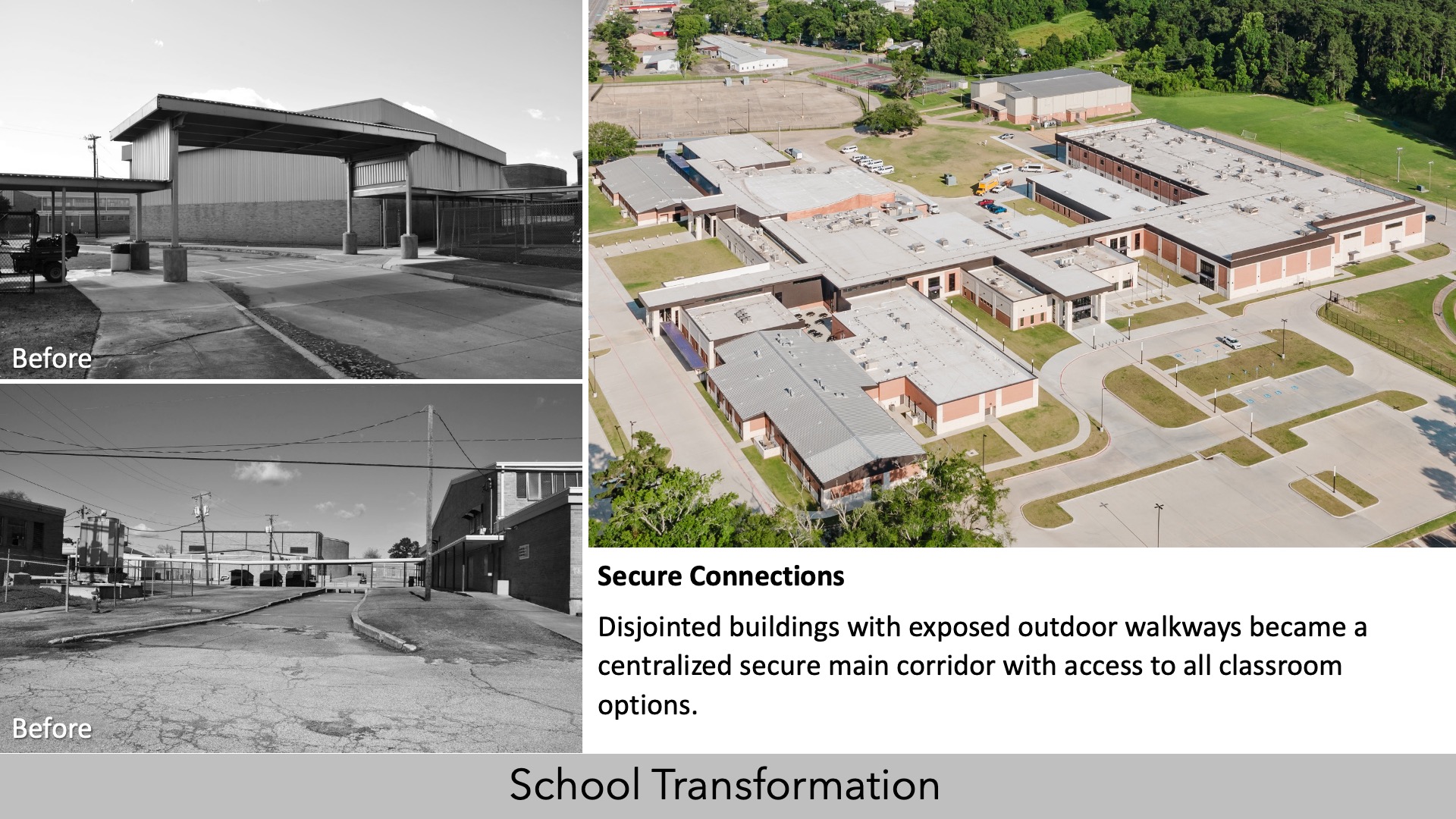 “This project transformed an aging middle school campus rife with security issues and disoriented buildings to a safe and inspiring connected environment where students can thrive academically and socially. The existing campus was a 1950s patchwork of 16 buildings and eight portables that caused innumerable security vulnerabilities. Students and staff were forced to navigate long, exposed walkways with leaking canopies in order to move about the fragmented campus. Transitions between the scattered buildings also took students a long time and decreased engagement in the classroom.