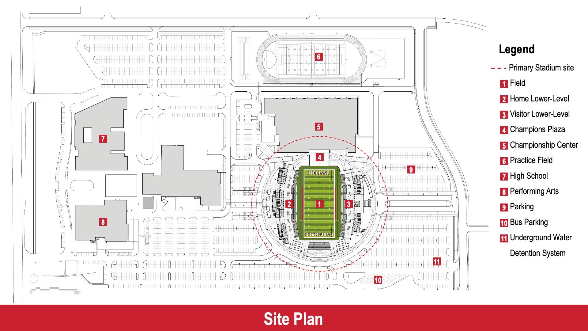 Visitor Facilities: The visitor side includes all necessary amenities, including restrooms, concessions, first aid, and customer service areas, with an elevated concourse for an enhanced viewing experience. A separate building behind the scoreboard houses visitor locker rooms, officials’ facilities, and additional support spaces.”
