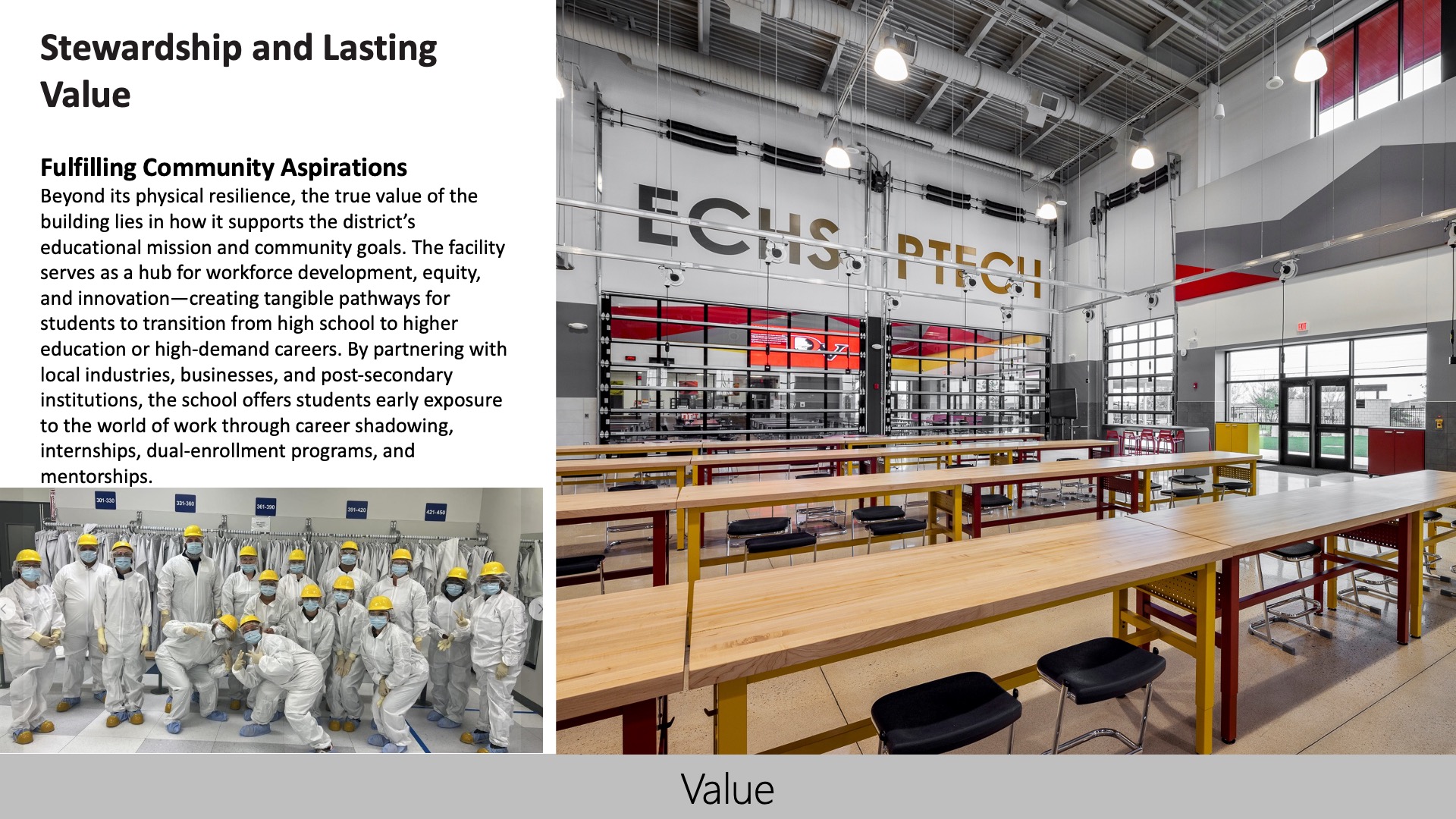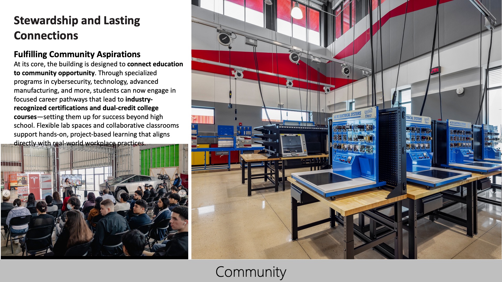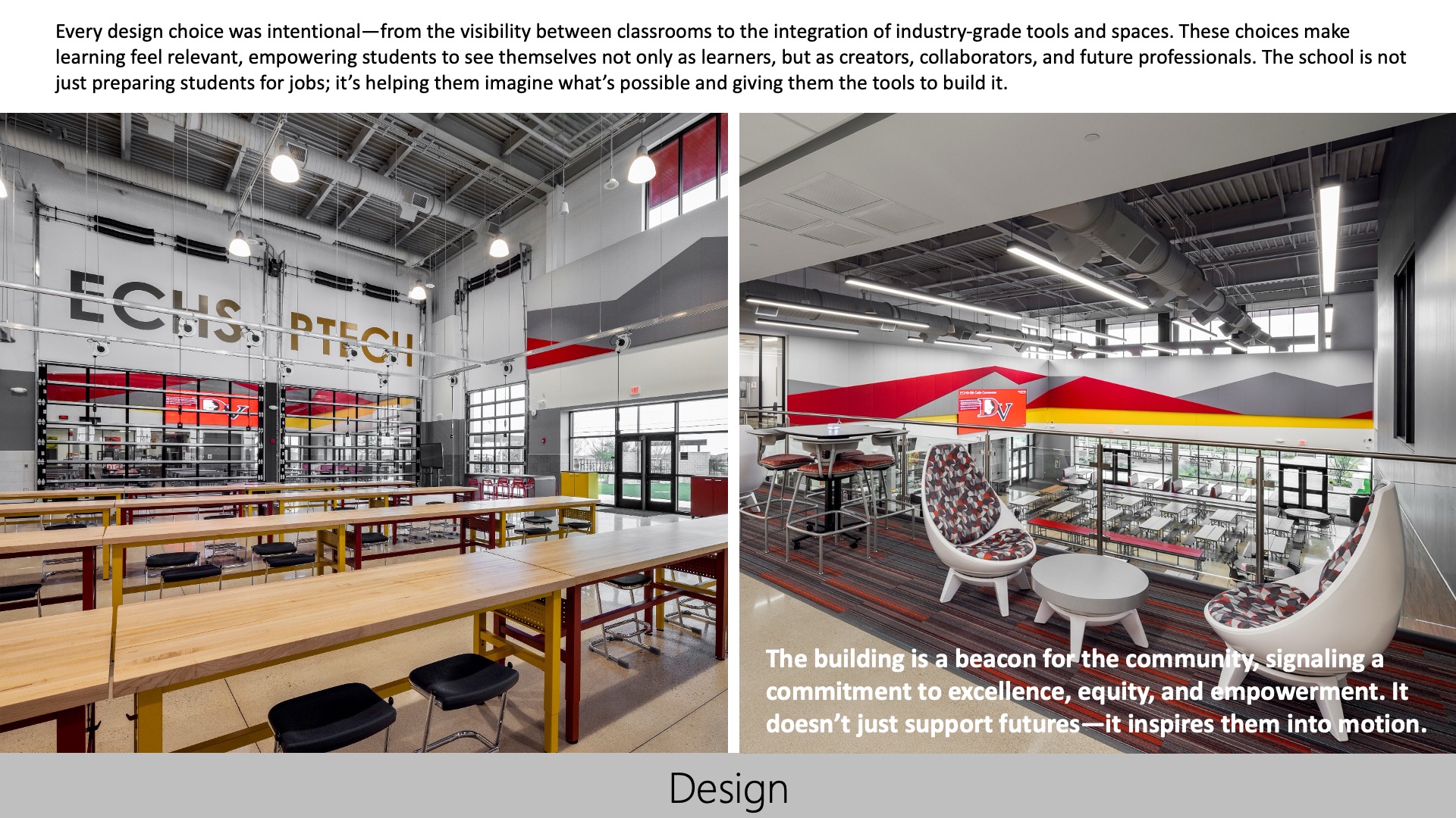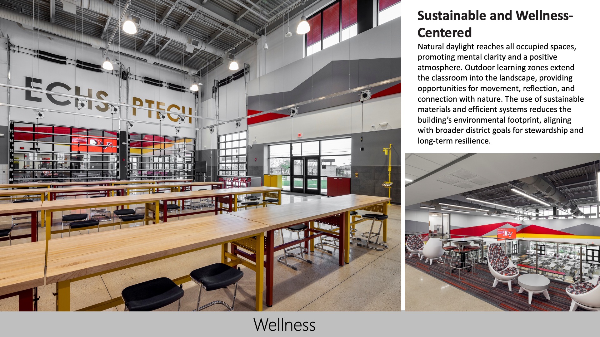 The high school fosters a strong connection to its community through welcoming design, shared spaces, and partnerships with local industries. Its open, flexible environments support collaboration, while outdoor areas host community and partner events. The building reflects local values and offers real-world learning, inspiring pride and a sense of belonging among students, staff, and the broader community it serves.