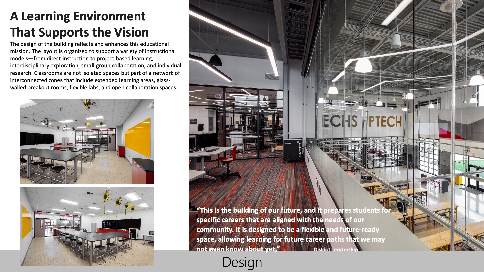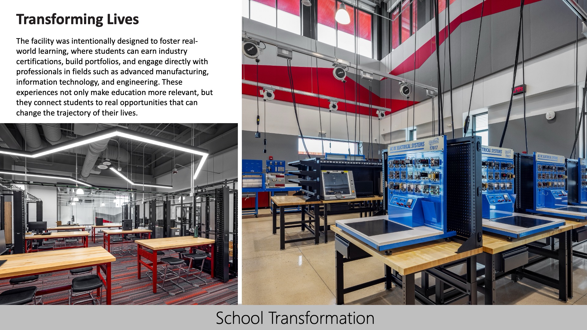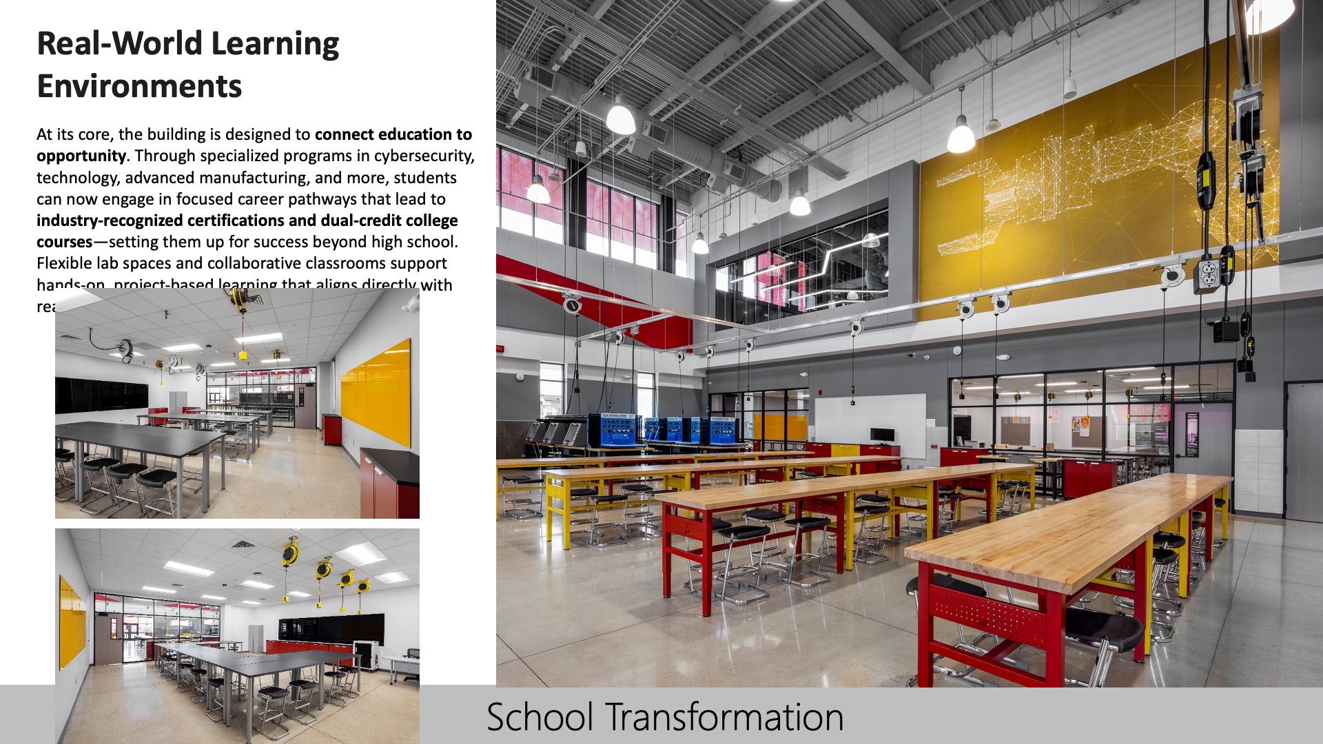 The facility is organized to support flow, collaboration, and flexibility. Scaled to create an inviting, student-centered environment, the building’s layout fosters connection between classrooms, labs, and open learning zones. Adaptable spaces and operable walls support a range of teaching styles and instructional approaches. The design was directly shaped by the educational vision—creating a flexible, real-world learning environment that enhances student engagement, discovery, and long-term success.