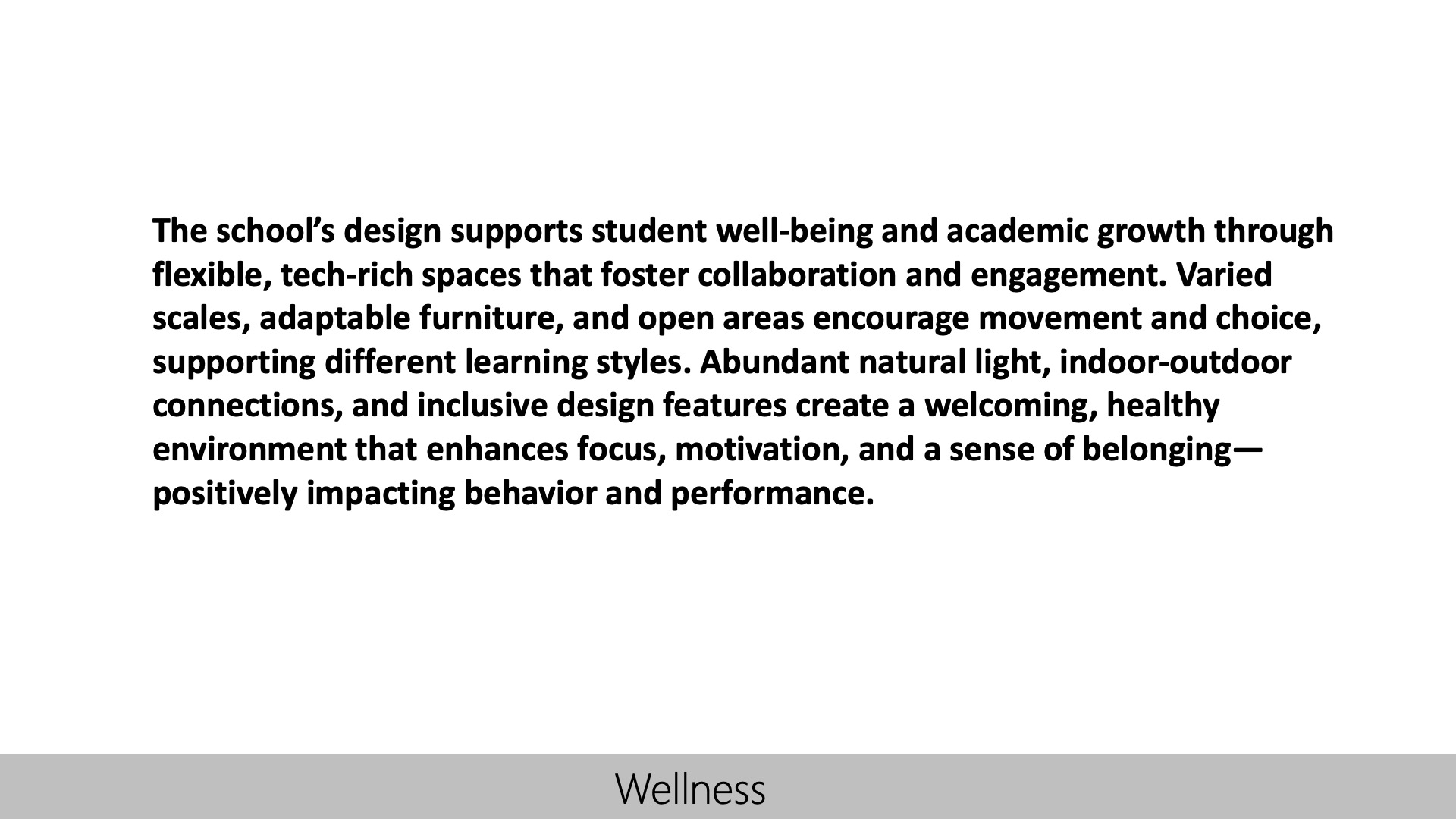 The school’s design supports student well-being and academic growth through flexible, tech-rich spaces that foster collaboration and engagement. Varied scales, adaptable furniture, and open areas encourage movement and choice, supporting different learning styles. Abundant natural light, indoor-outdoor connections, and inclusive design features create a welcoming, healthy environment that enhances focus, motivation, and a sense of belonging—positively impacting behavior and performance.
