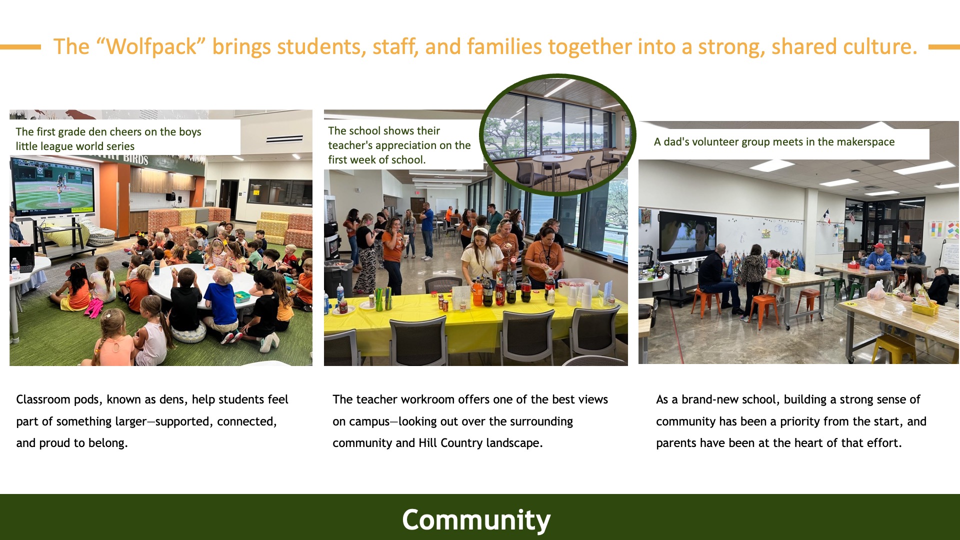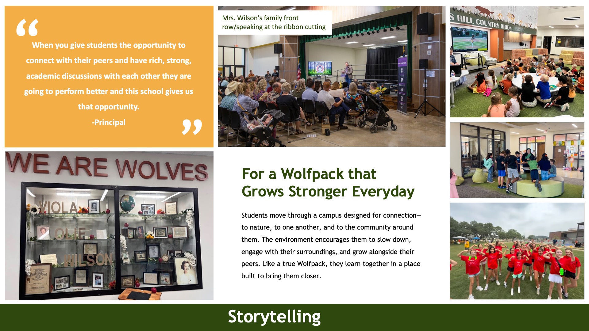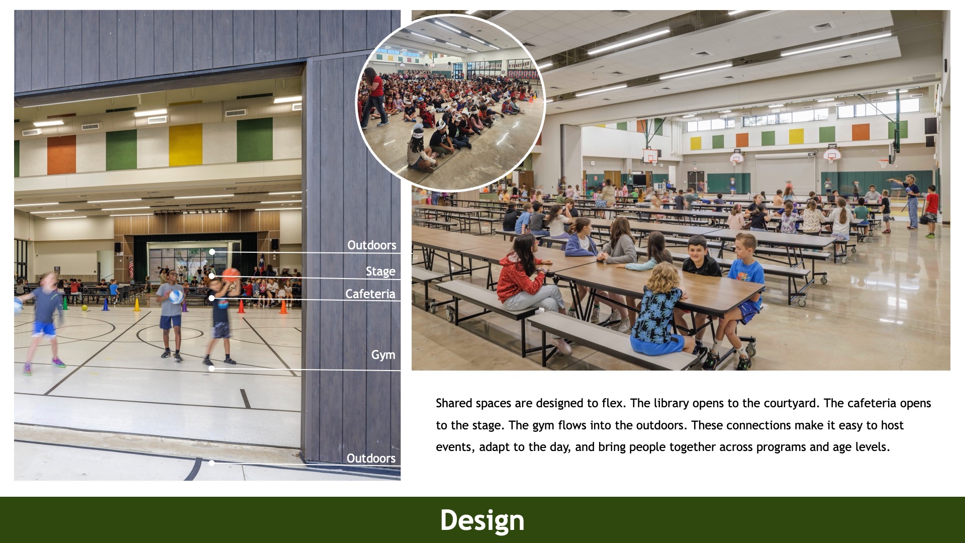 Classrooms are organized into “”wolf dens”” that strengthen student connection. Graphics featuring native wildlife & references to a beloved educator reinforce community ties. Flexible spaces support both school events & broader community use.”