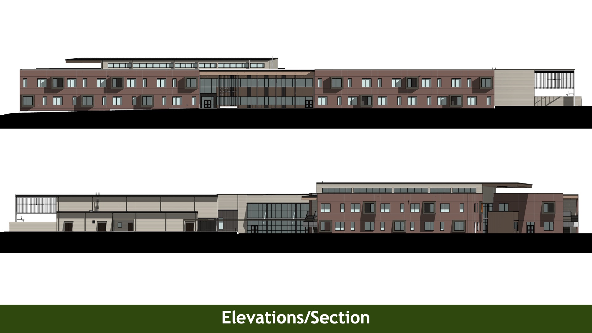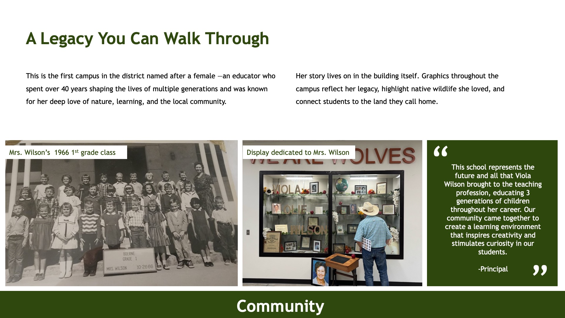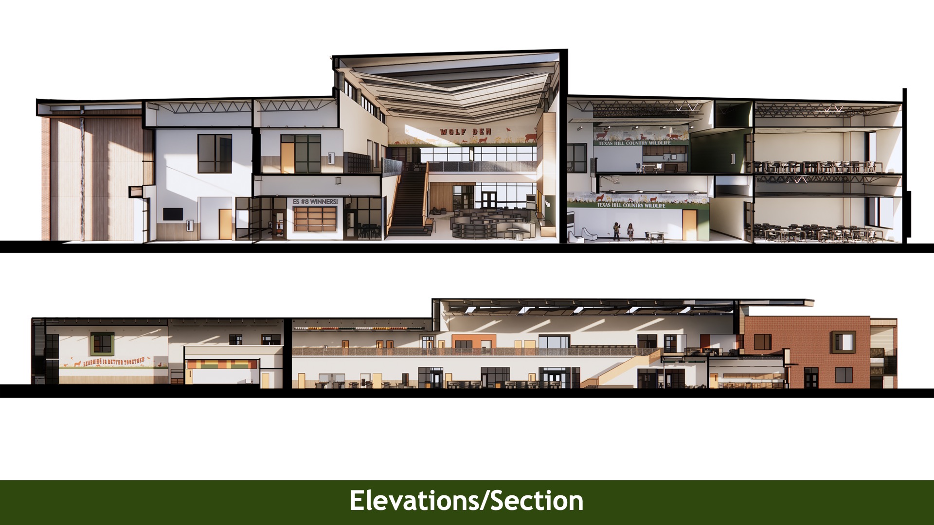 Classrooms are organized into “”wolf dens”” that strengthen student connection. Graphics featuring native wildlife & references to a beloved educator reinforce community ties. Flexible spaces support both school events & broader community use.”