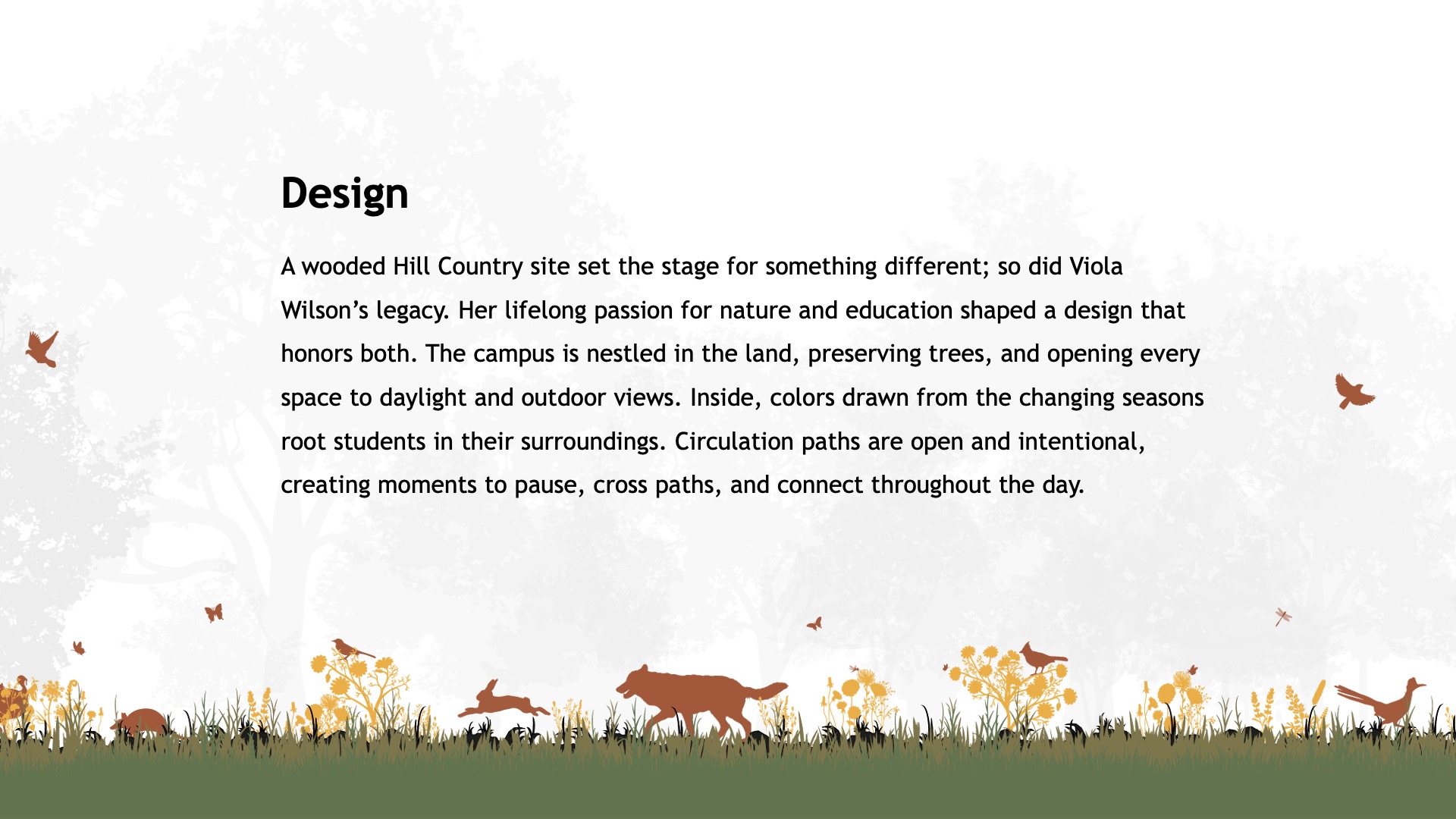 A wooded Hill Country site set the stage for something different—and so did Viola Wilson’s legacy. Her lifelong passion for nature and education shaped a design that honors both. The campus is nestled in the land, preserving trees, and opening every space to daylight and outdoor views. Inside, colors drawn from the changing seasons root students in their surroundings. Circulation paths are open and intentional, creating moments to pause, cross paths, and connect throughout the day.