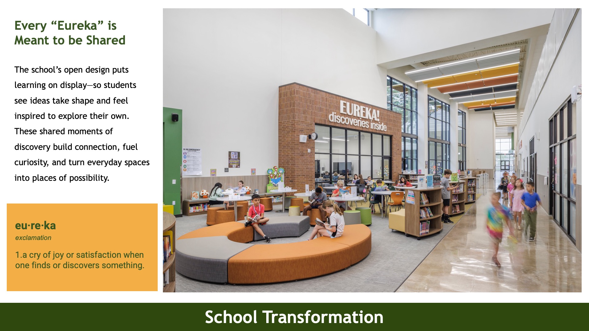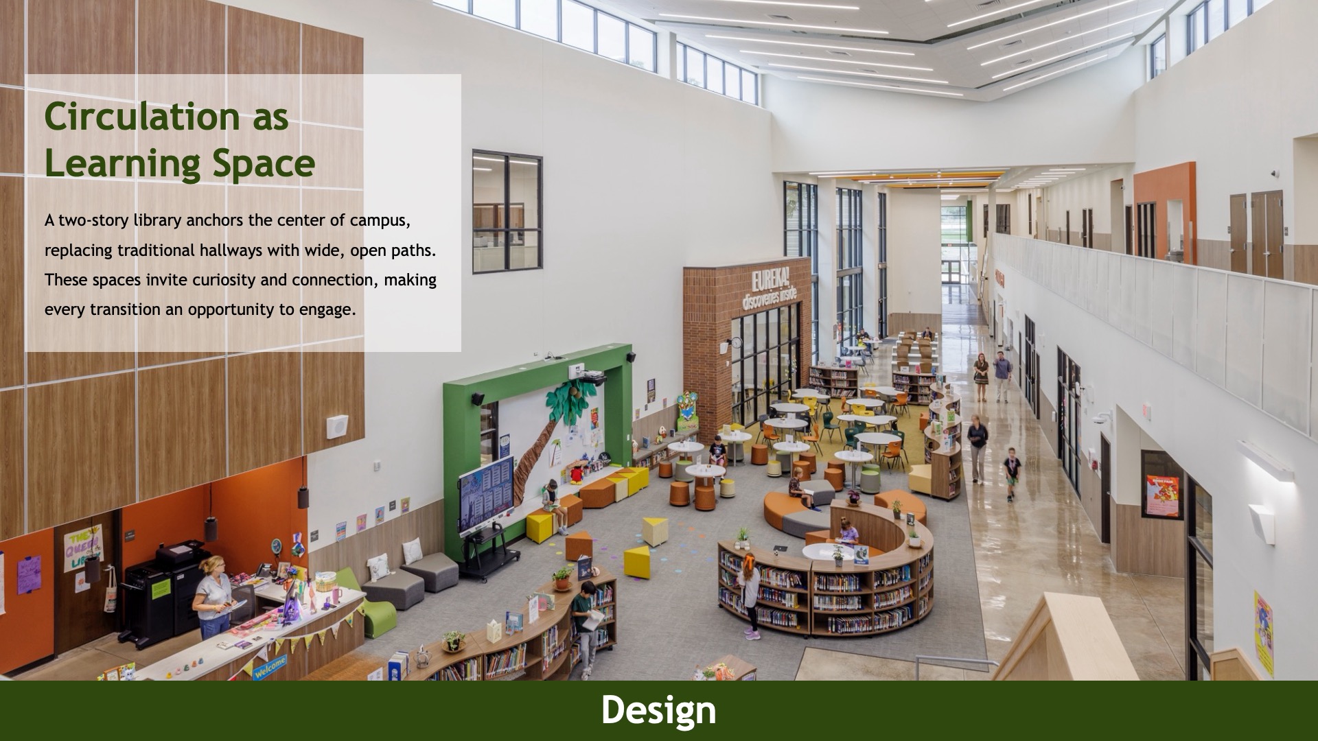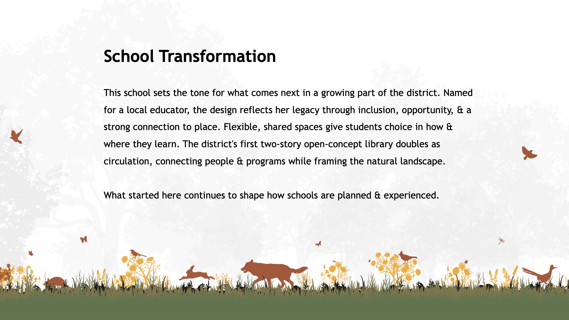 “This school sets the tone for what comes next in a growing part of the district. Named for a local educator, the design reflects her legacy through inclusion, opportunity, & a strong connection to place. Flexible, shared spaces give students choice in how & where they learn. The district’s first two-story open-concept library doubles as circulation, connecting people & programs while framing the natural landscape.