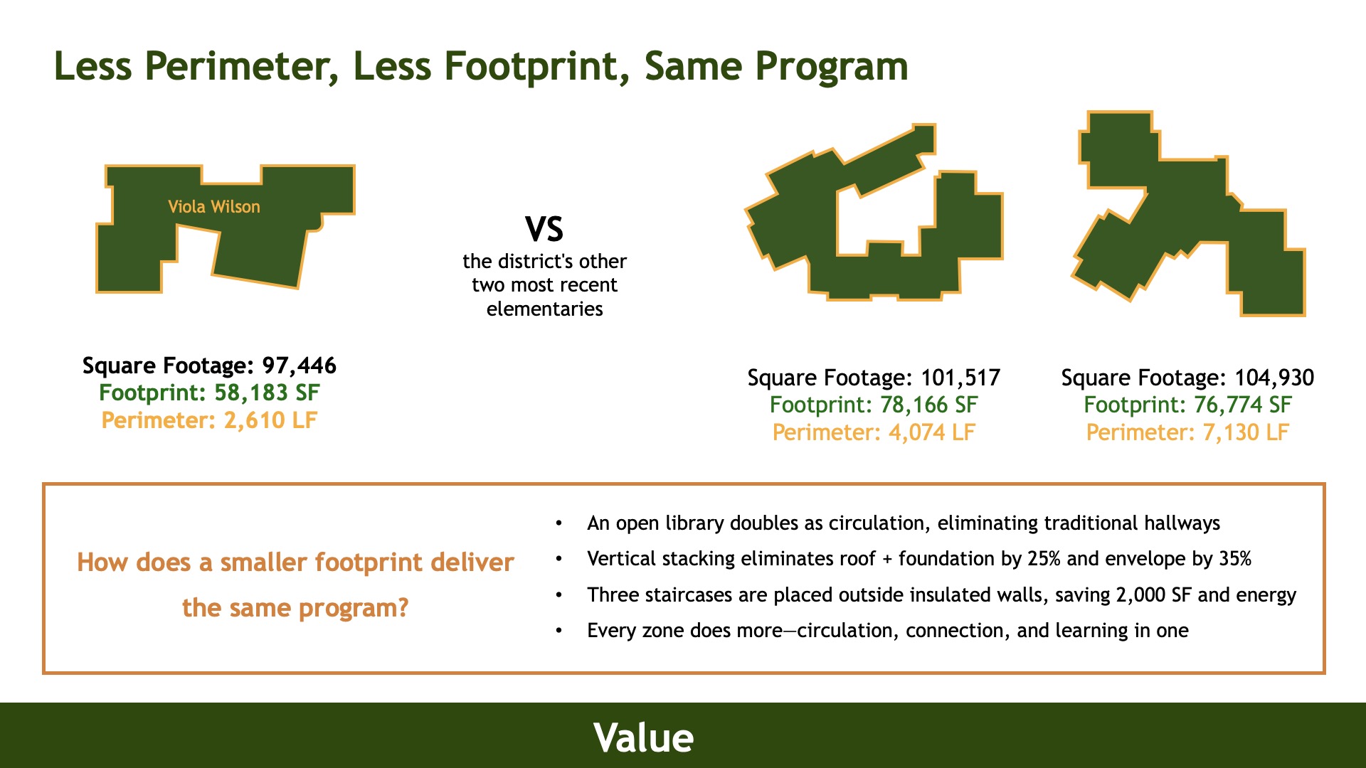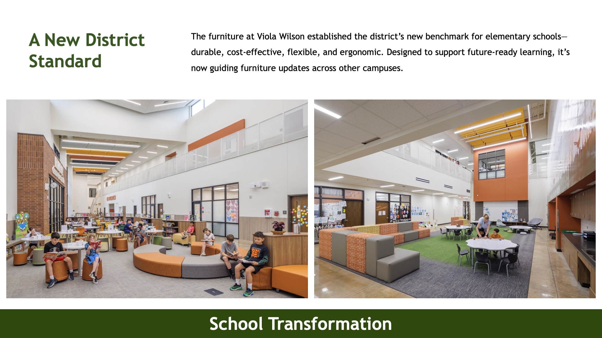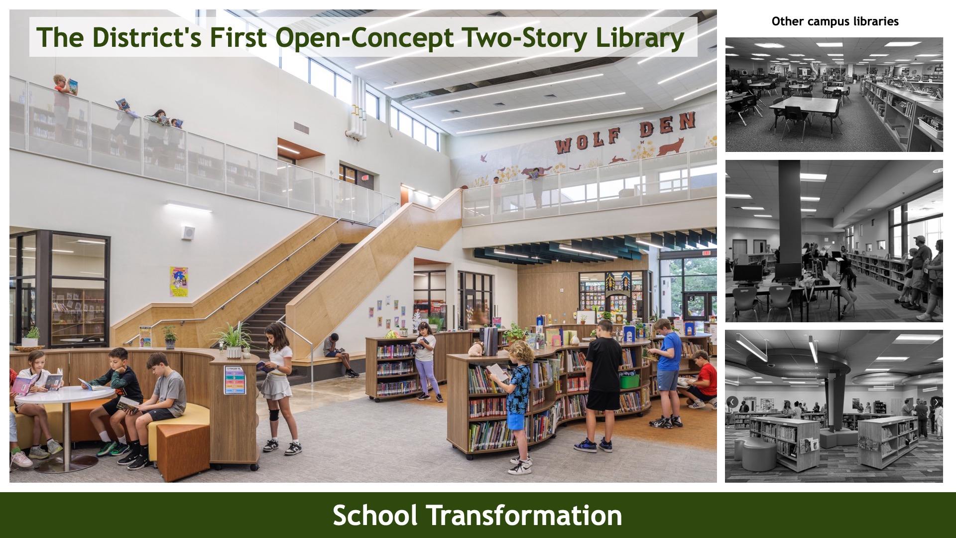 “This school sets the tone for what comes next in a growing part of the district. Named for a local educator, the design reflects her legacy through inclusion, opportunity, & a strong connection to place. Flexible, shared spaces give students choice in how & where they learn. The district’s first two-story open-concept library doubles as circulation, connecting people & programs while framing the natural landscape.