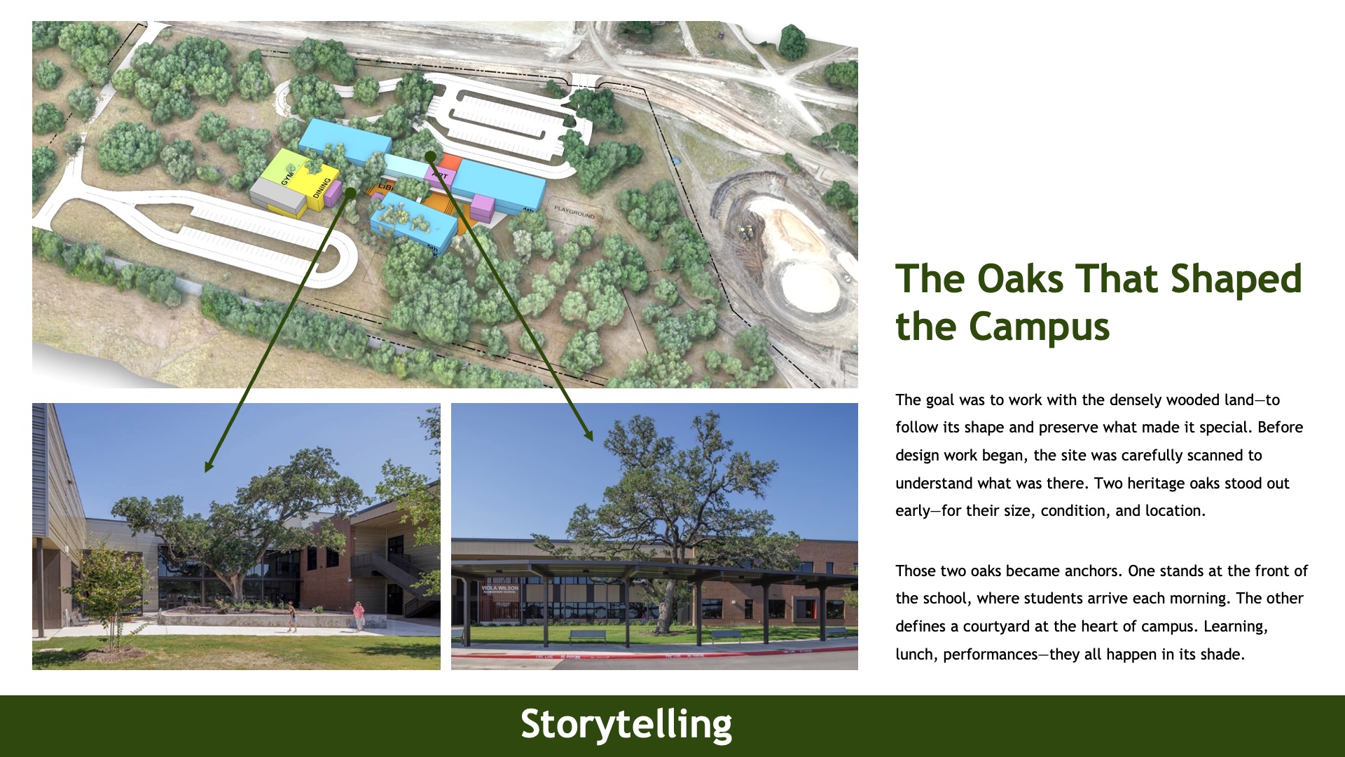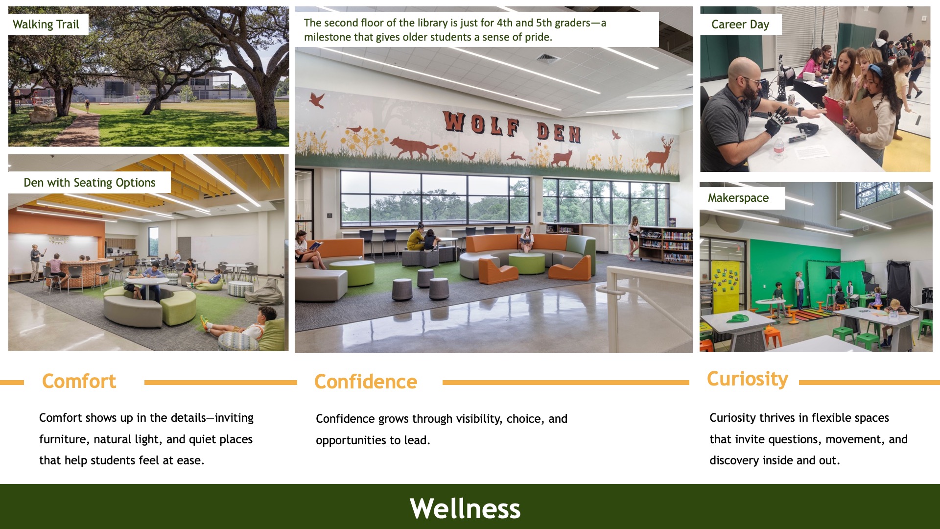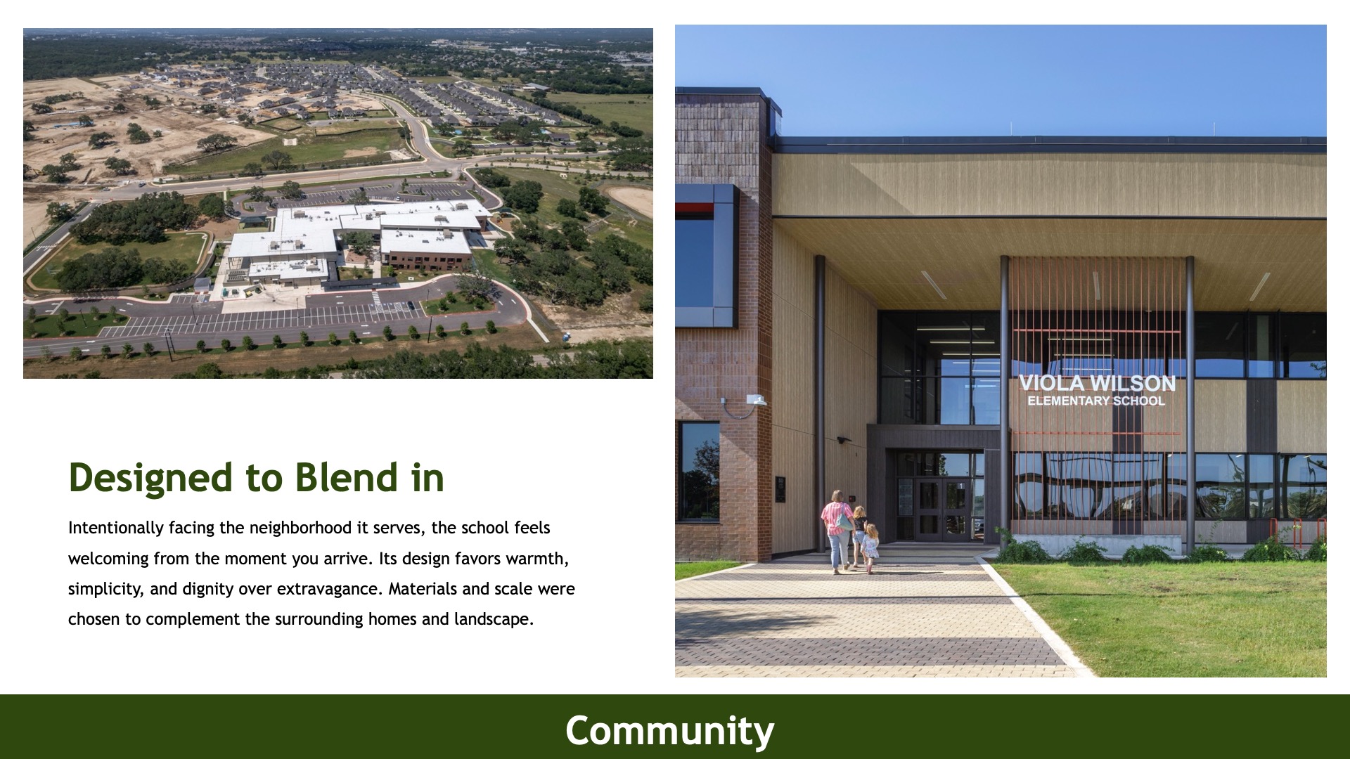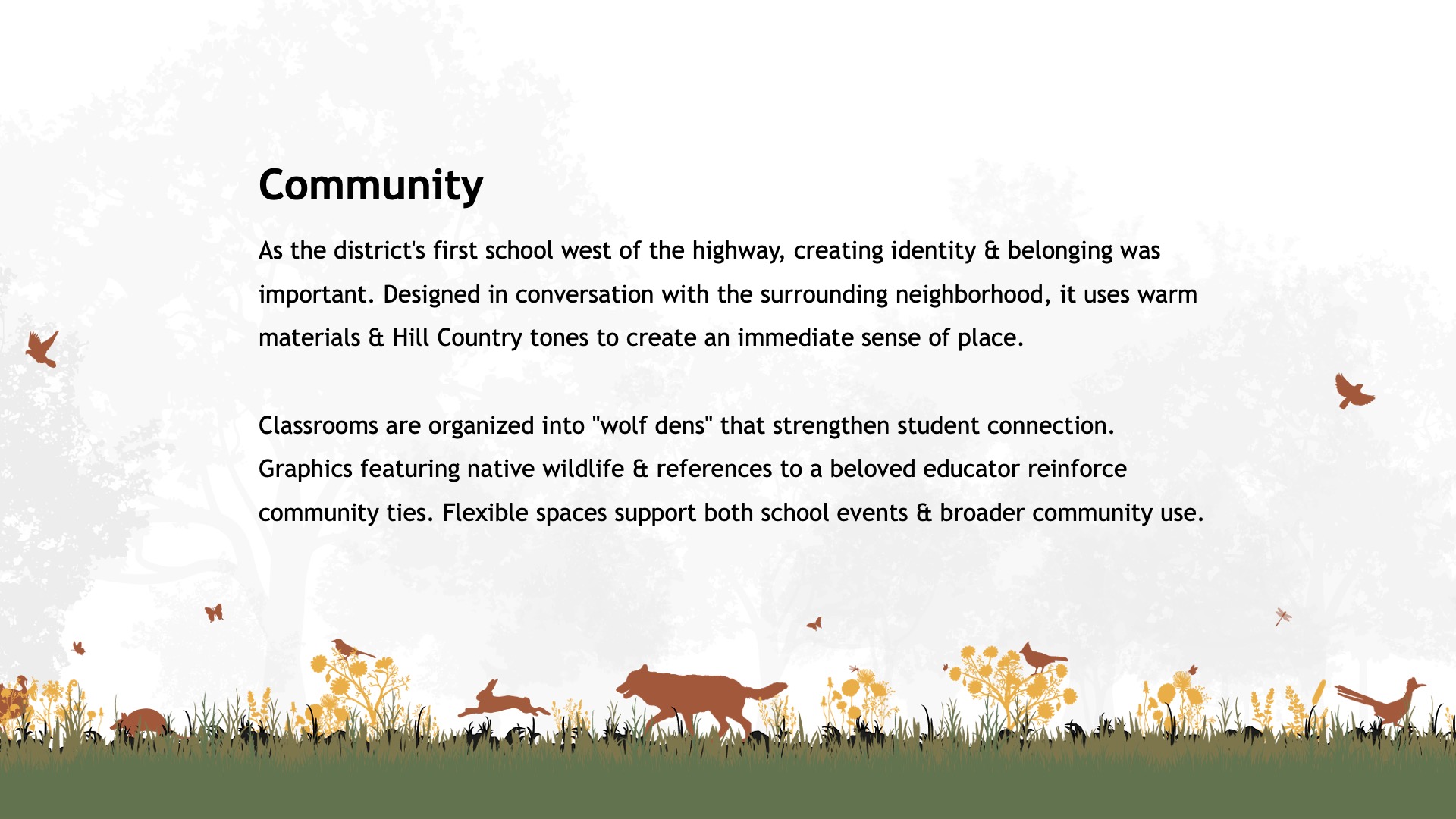 “As the district’s first school west of the highway, creating identity & belonging was important. Designed in conversation with the surrounding neighborhood, it uses warm materials & Hill Country tones to create an immediate sense of place.