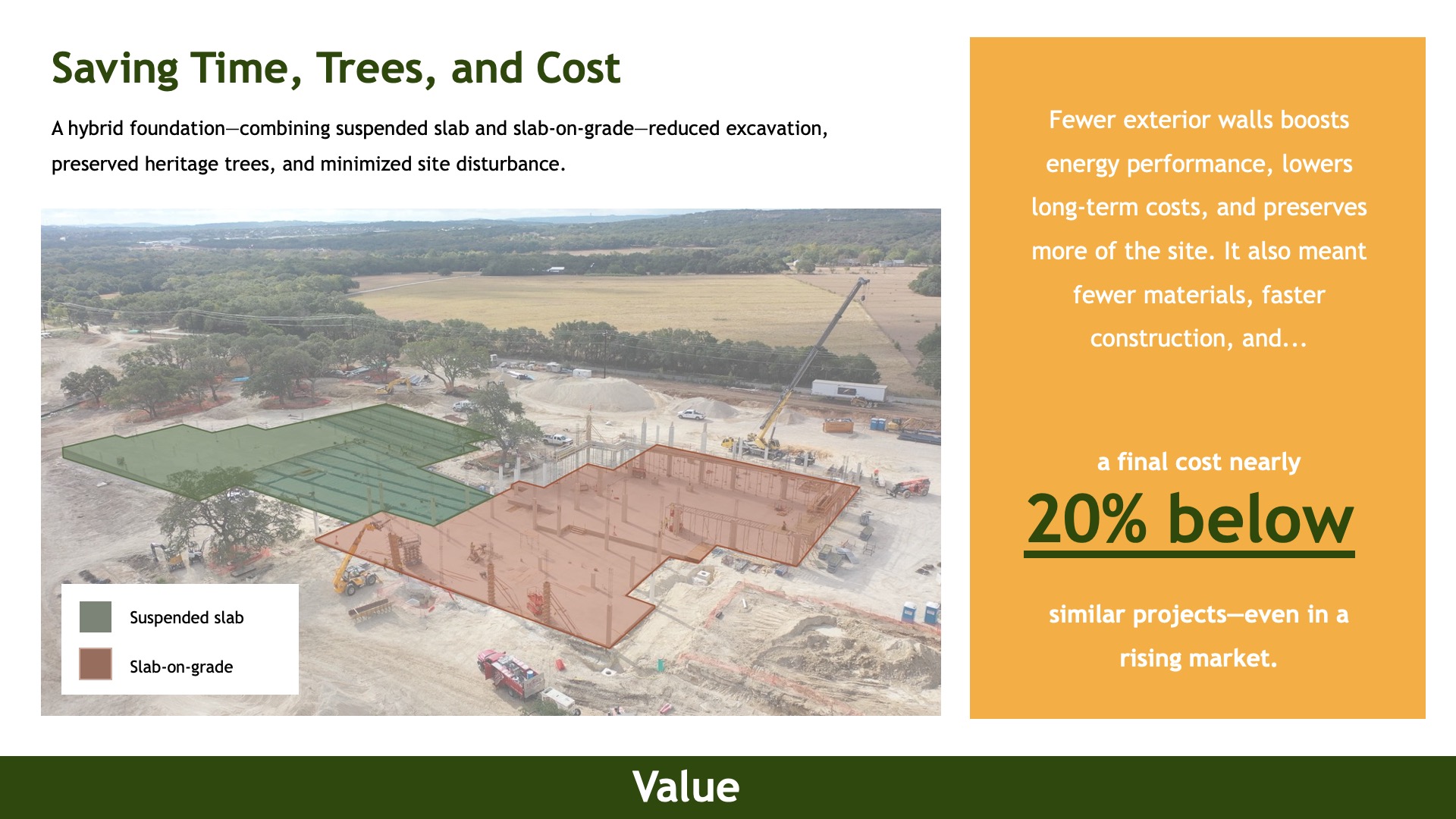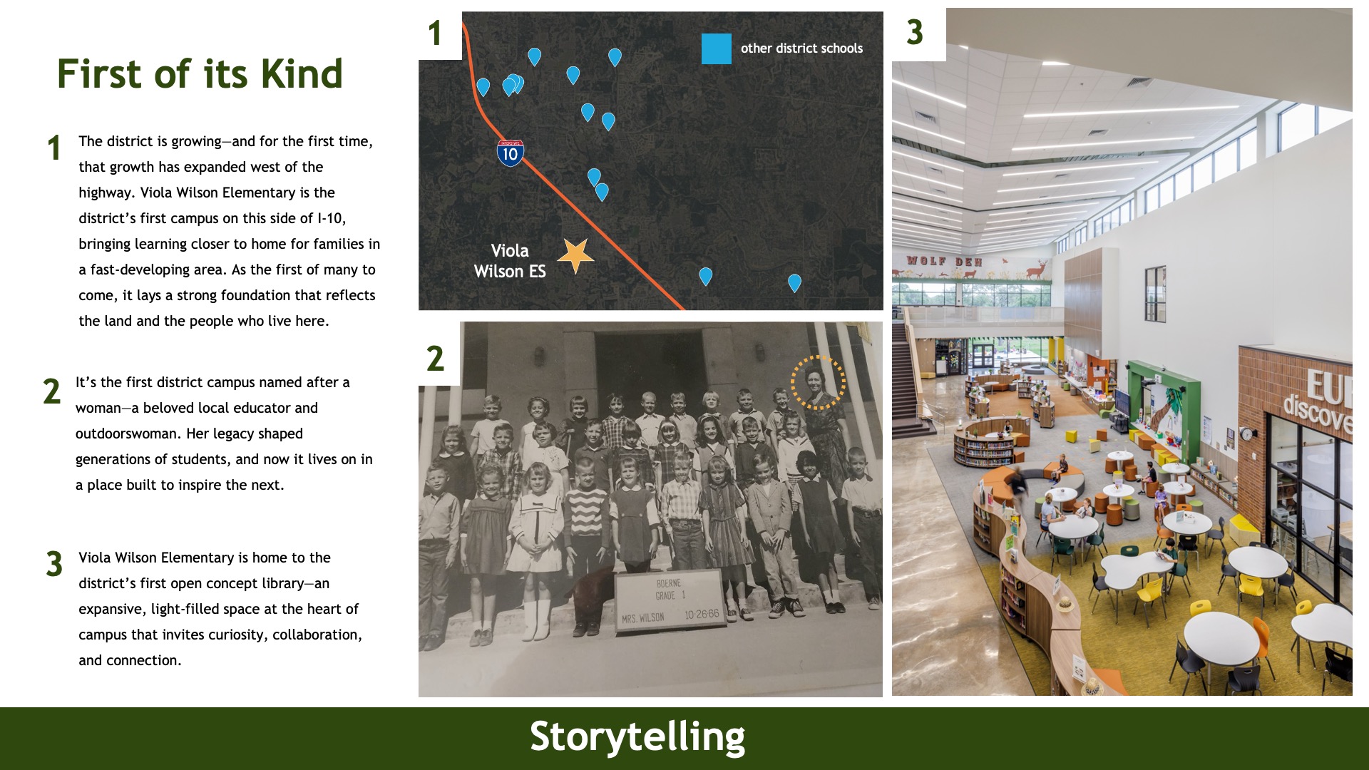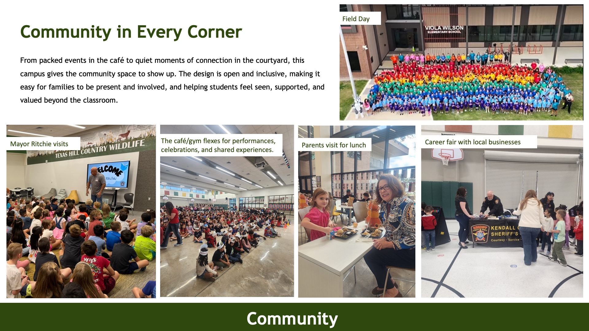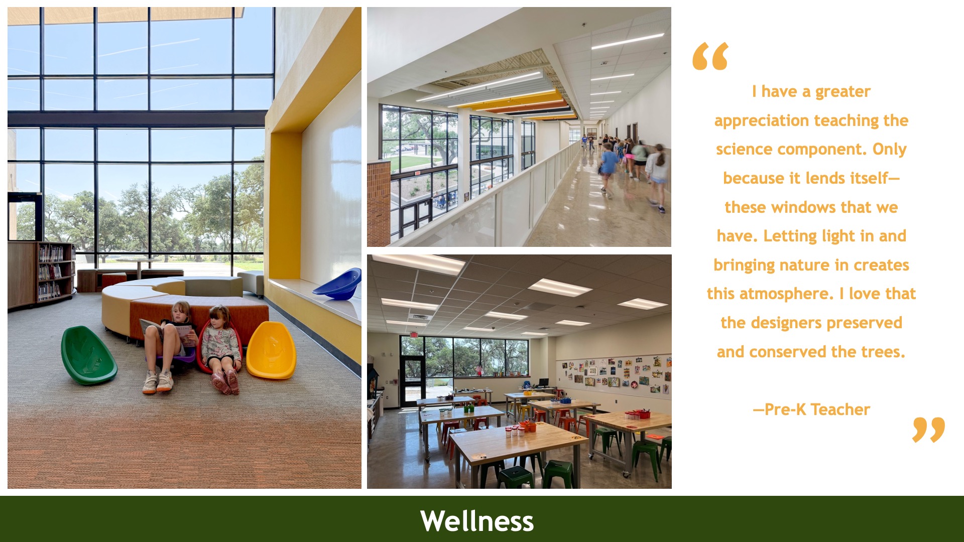 “As the district’s first school west of the highway, creating identity & belonging was important. Designed in conversation with the surrounding neighborhood, it uses warm materials & Hill Country tones to create an immediate sense of place.