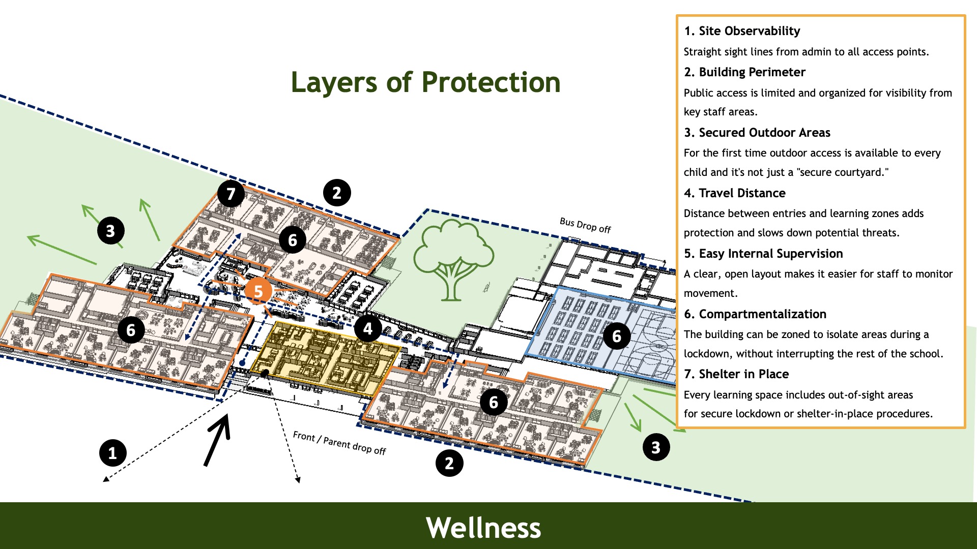 “Nature anchors the design, with windows framing trees, changing seasons, & inviting sunlight into every learning space. Safety is woven into the environment in ways students don’t consciously notice. Students feel secure, yet free to move, explore, and connect. Indoors and out, spaces flow naturally between focused learning, active play, and quiet moments.