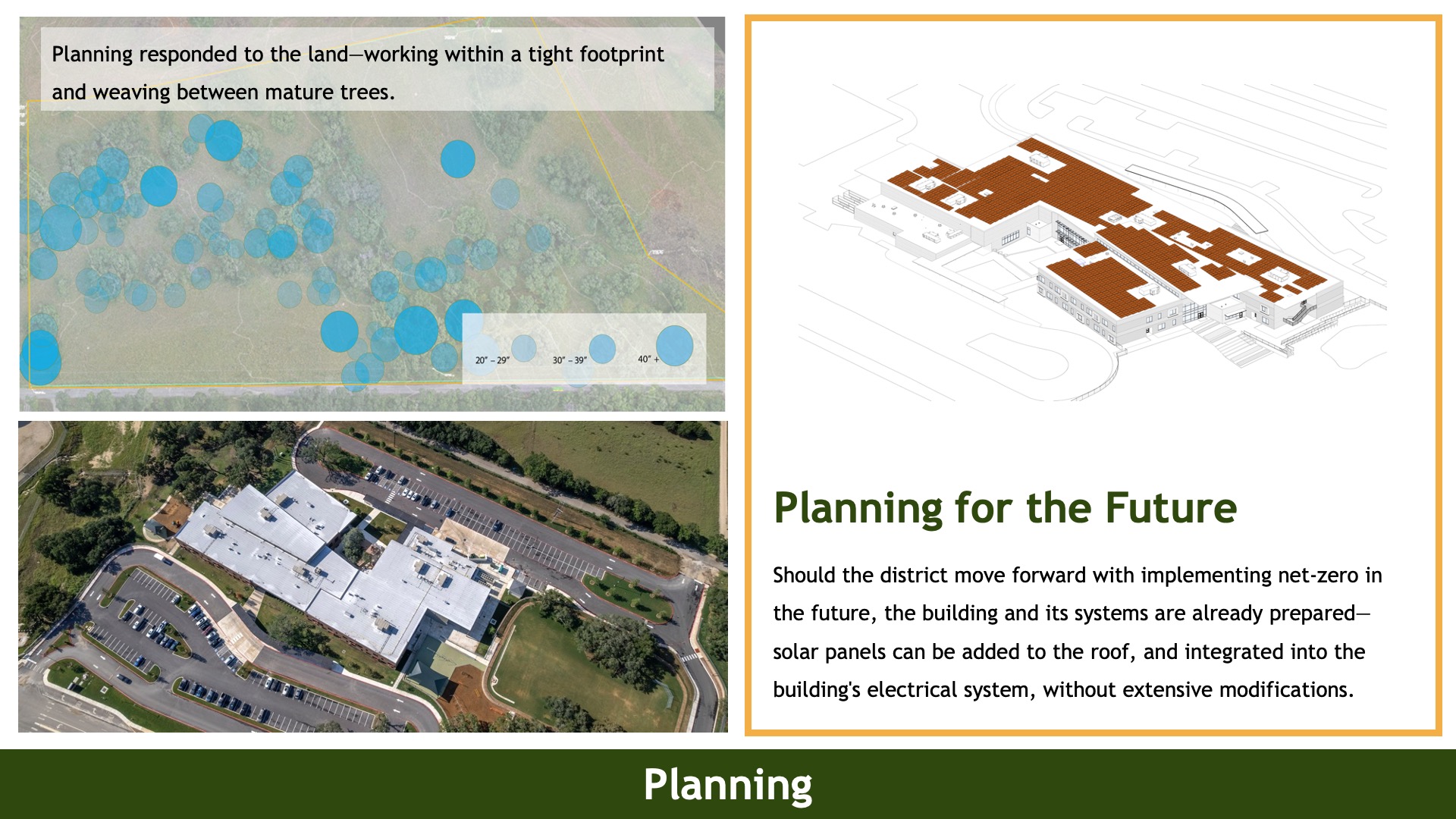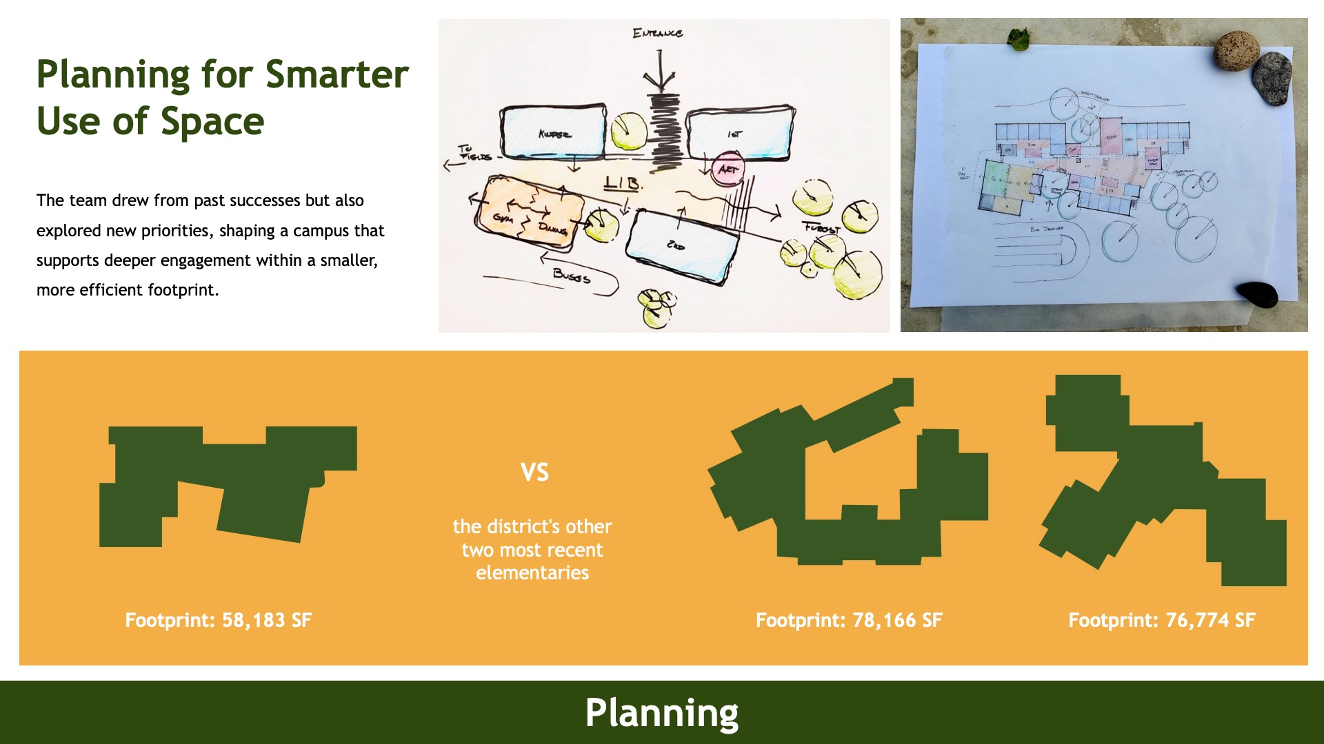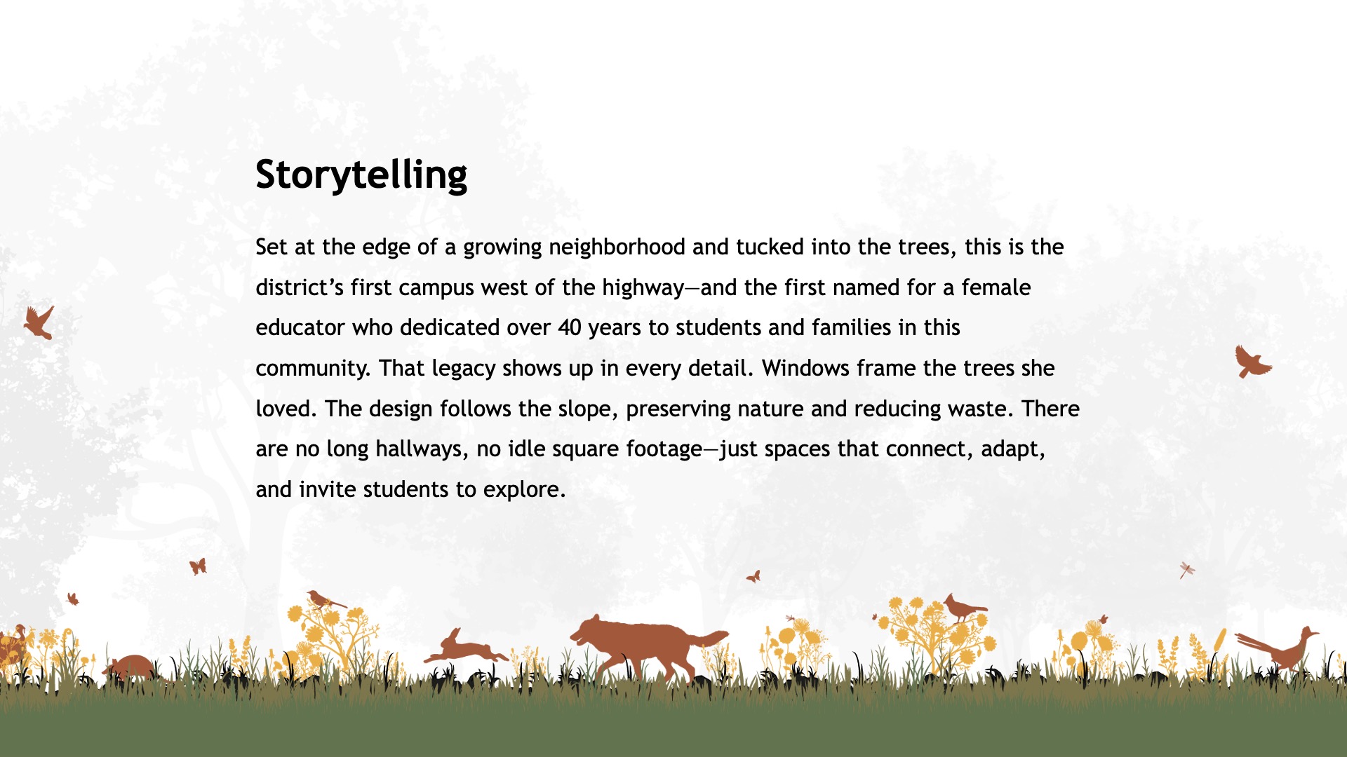 Set at the edge of a growing neighborhood and tucked into the trees, this is the district’s first campus west of the highway—and the first named for a female educator who dedicated over 40 years to students and families in this community. That legacy shows up in every detail. Windows frame the trees she loved. The design follows the slope, preserving nature and reducing waste. There are no long hallways, no idle square footage—just spaces that connect, adapt, and invite students to explore.”
