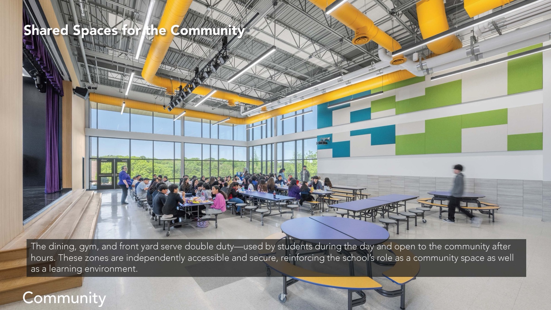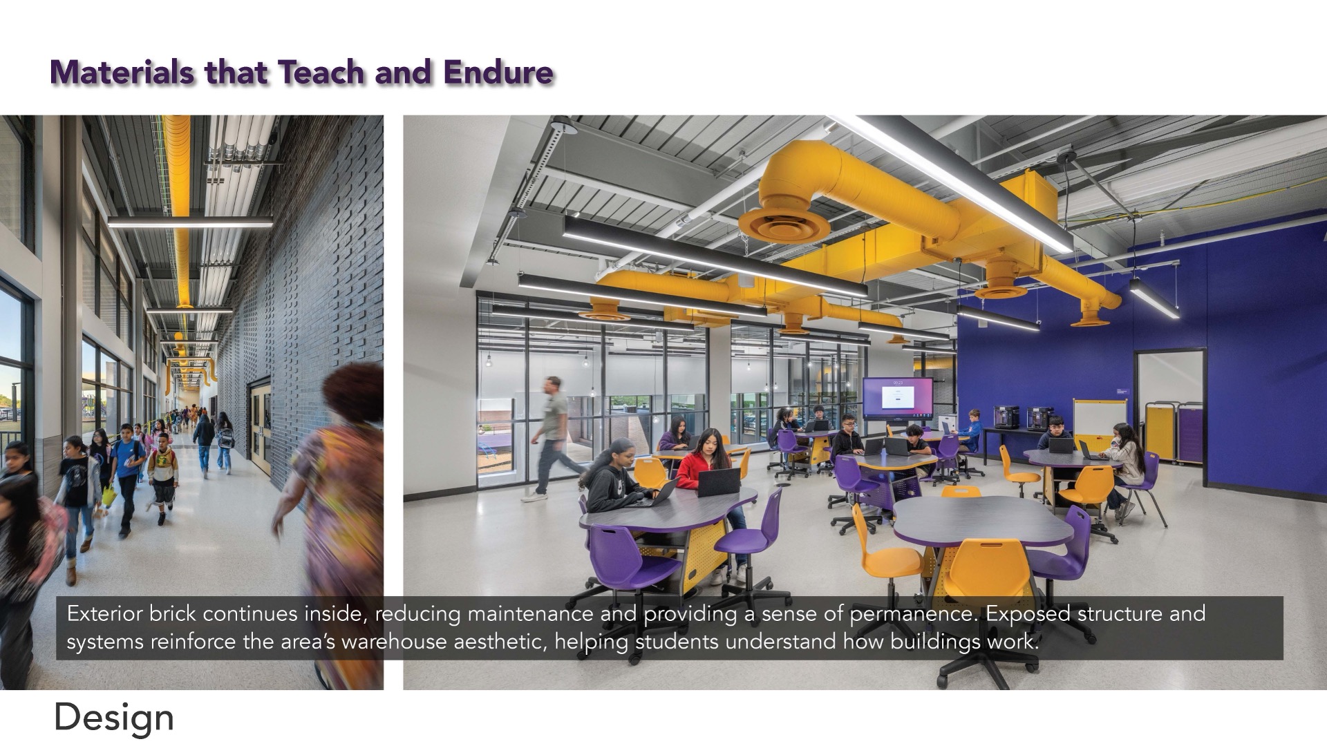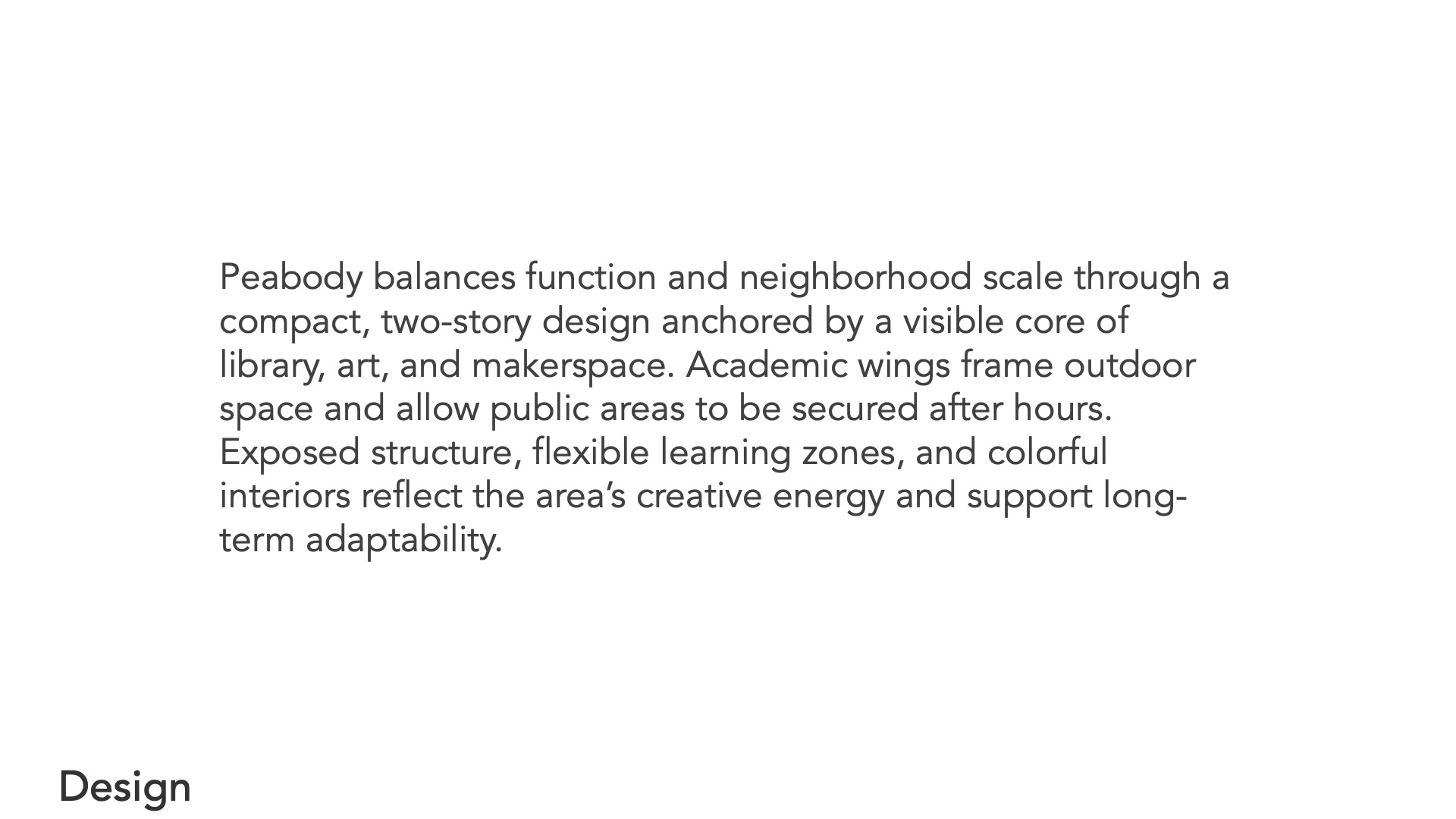 Peabody balances function and neighborhood scale through a compact, two-story design anchored by a visible core of library, art, and makerspace. Academic wings frame outdoor space and allow public areas to be secured after hours. Exposed structure, flexible learning zones, and colorful interiors reflect the area’s creative energy and support long-term adaptability.