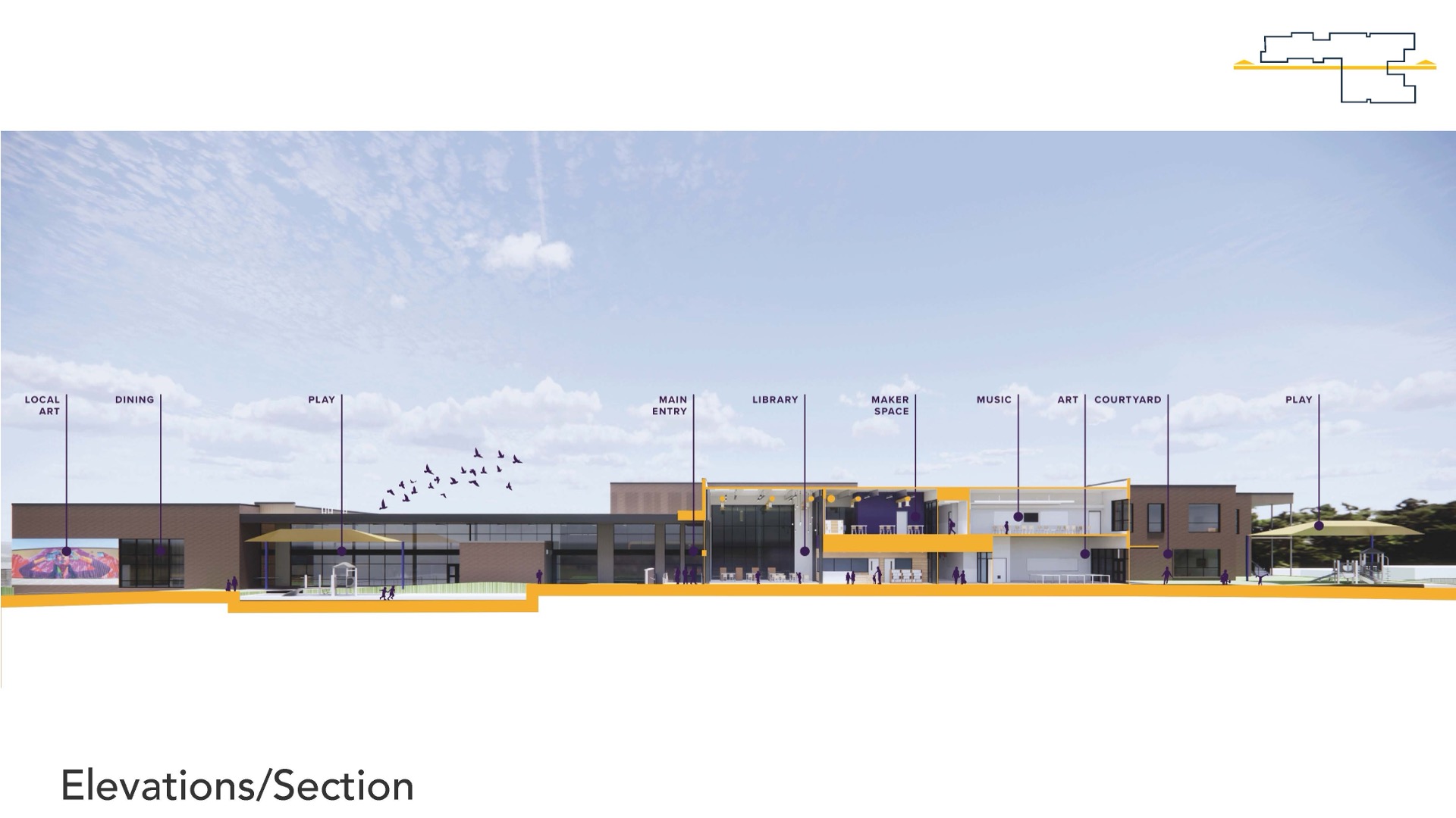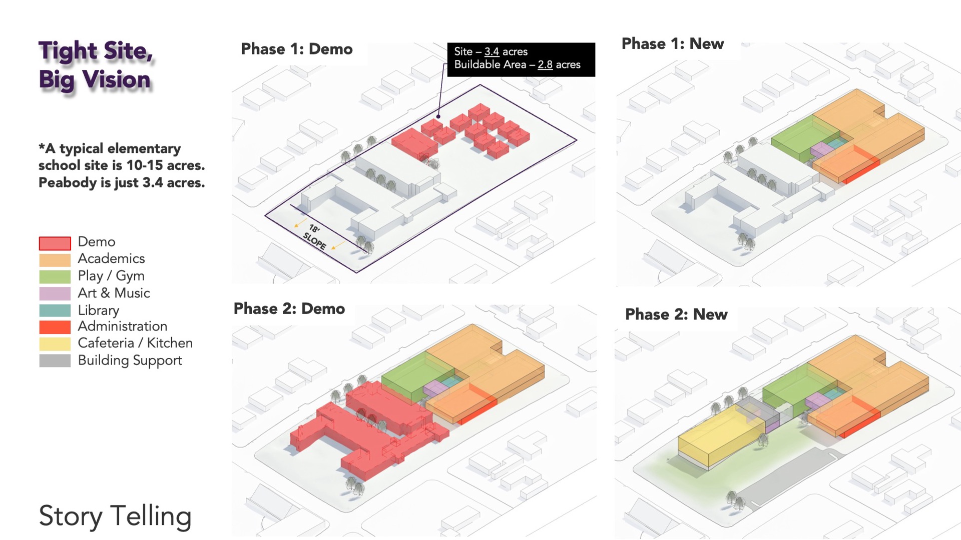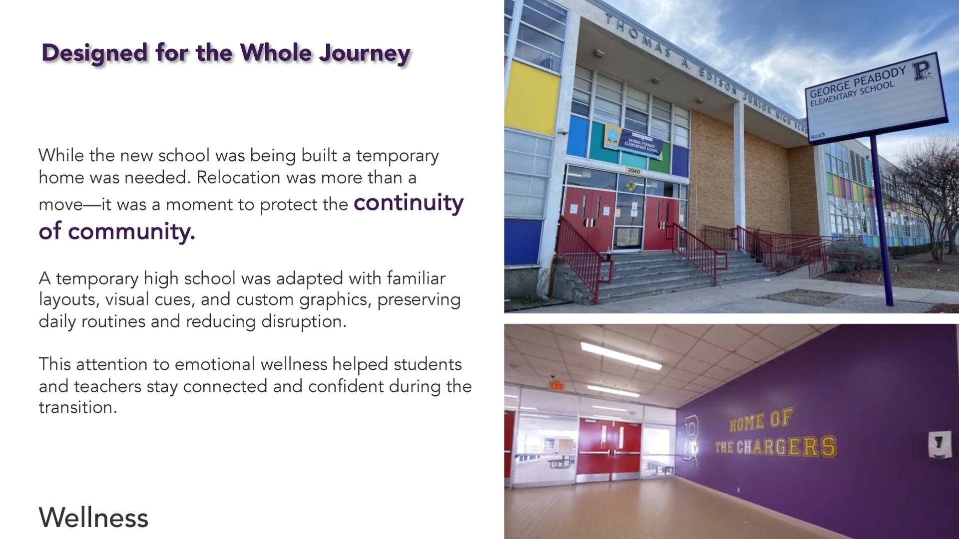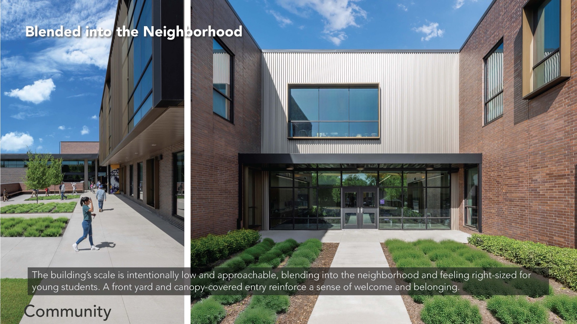 Peabody balances function and neighborhood scale through a compact, two-story design anchored by a visible core of library, art, and makerspace. Academic wings frame outdoor space and allow public areas to be secured after hours. Exposed structure, flexible learning zones, and colorful interiors reflect the area’s creative energy and support long-term adaptability.