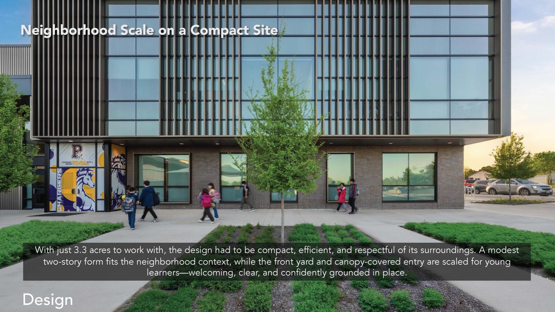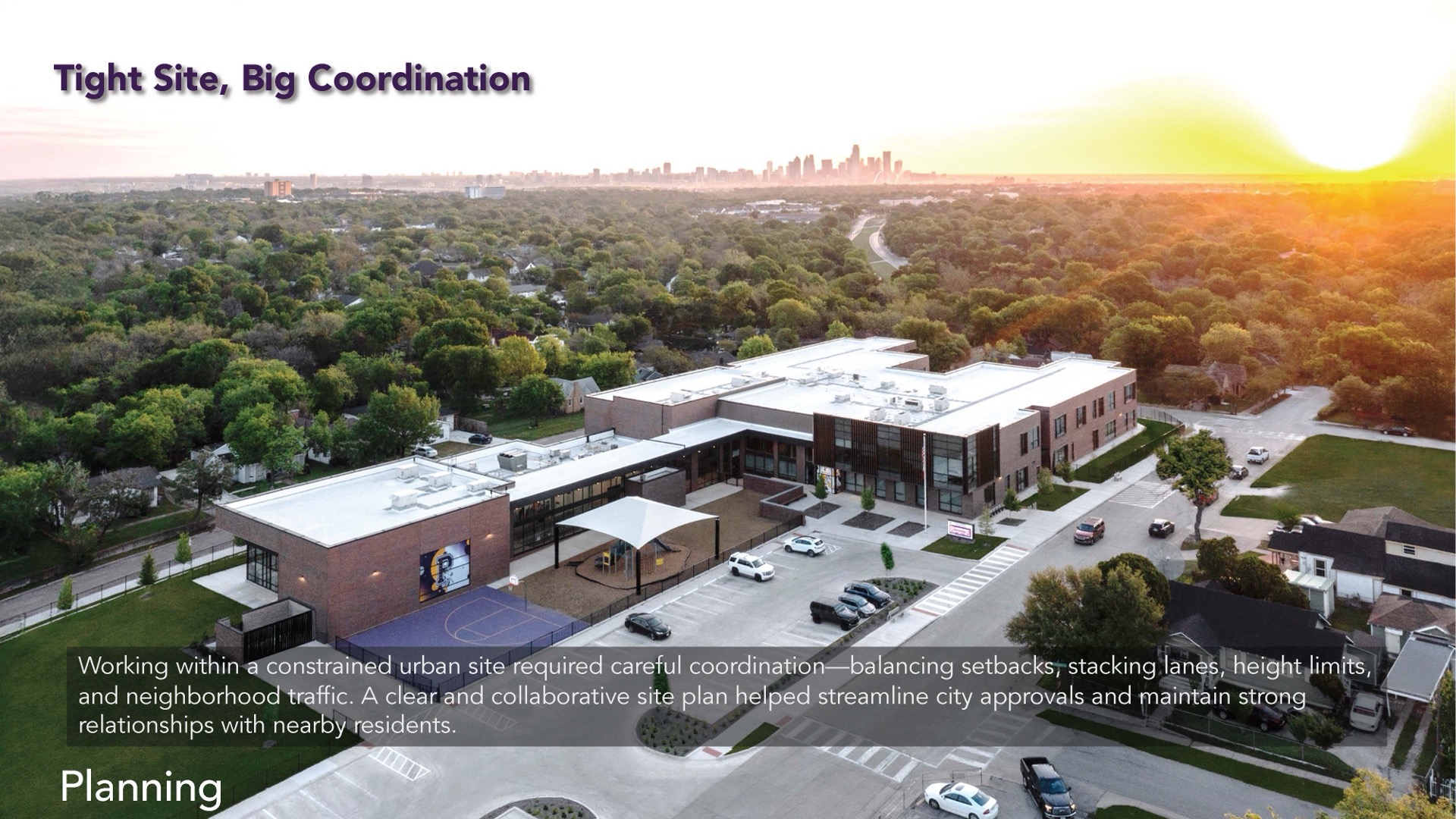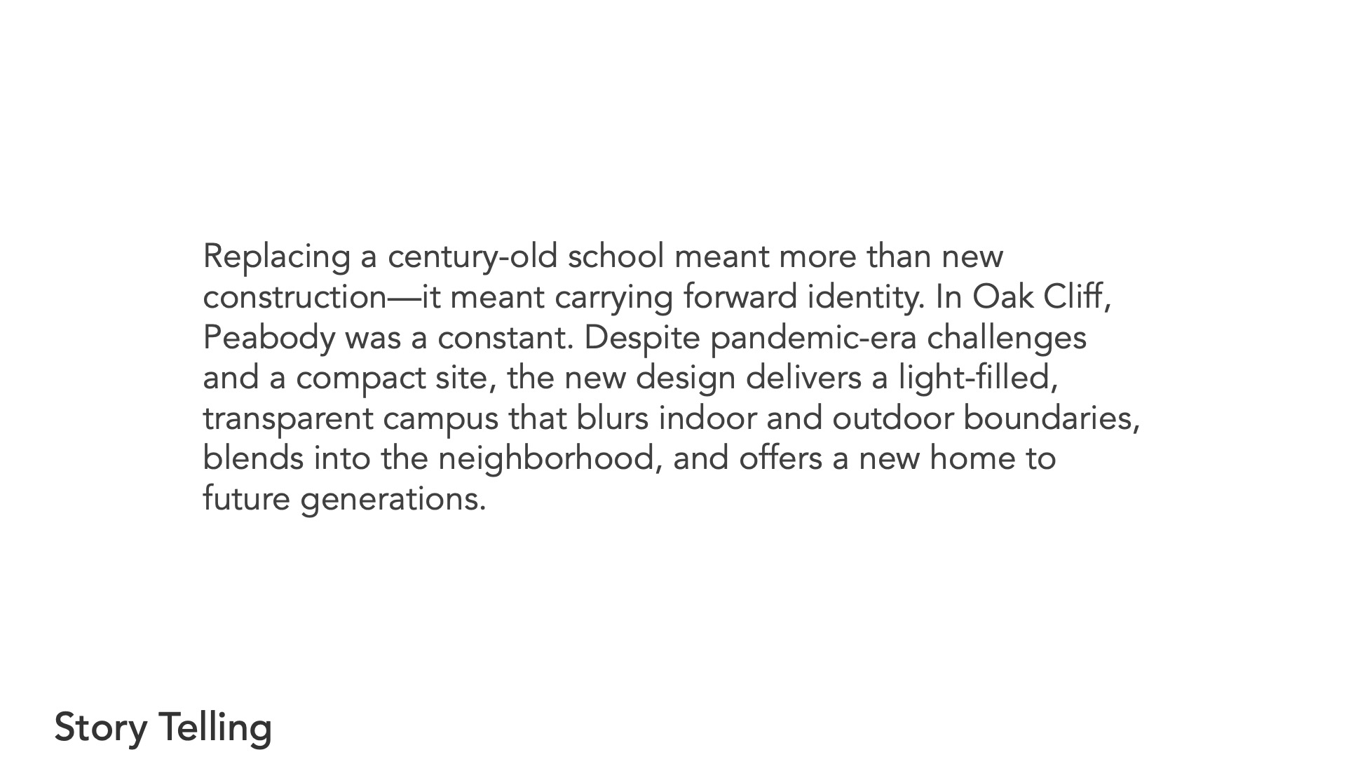 Replacing a century-old school meant more than new construction—it meant carrying forward identity. In Oak Cliff, Peabody was a constant. Despite pandemic-era challenges and a compact site, the new design delivers a light-filled, transparent campus that blurs indoor and outdoor boundaries, blends into the neighborhood, and offers a new home to future generations.”