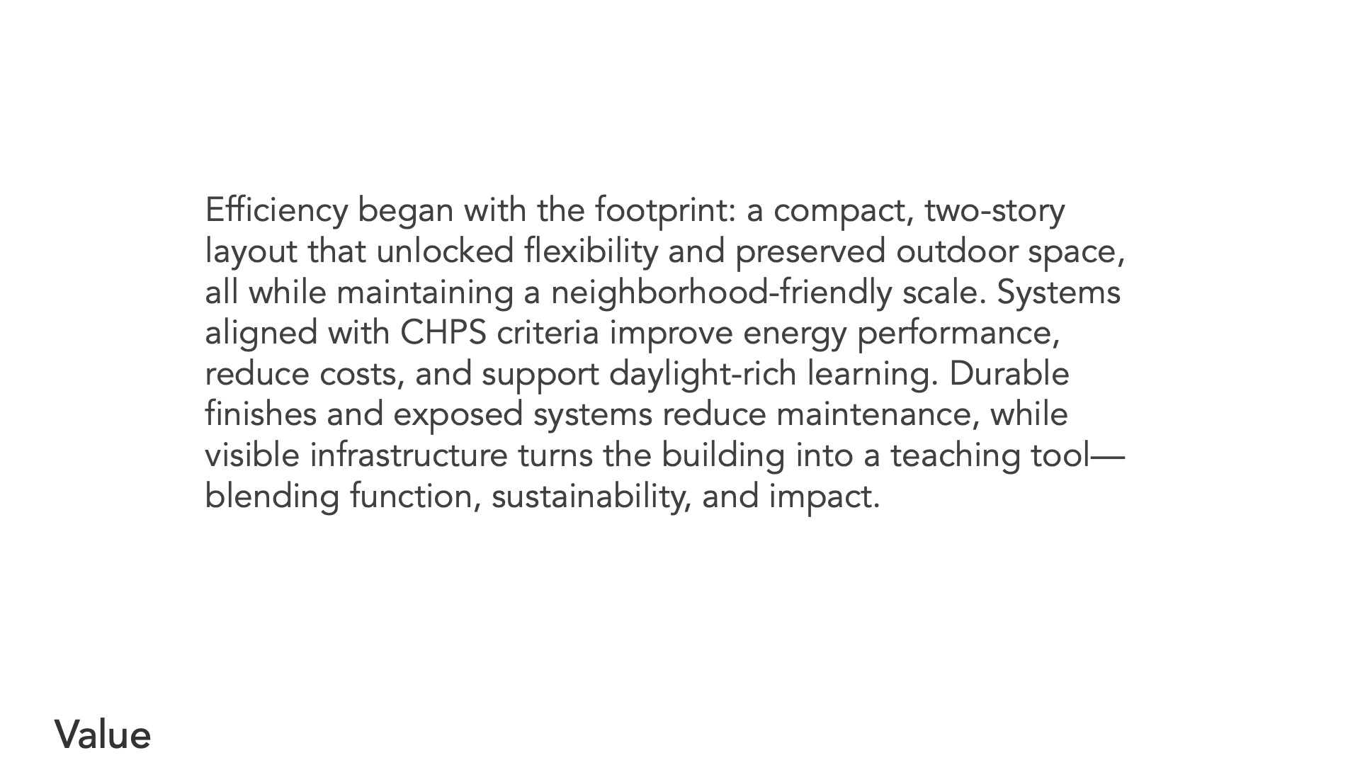 Efficiency began with the footprint: a compact, two-story layout that unlocked flexibility and preserved outdoor space, all while maintaining a neighborhood-friendly scale. Systems aligned with CHPS criteria improve energy performance, reduce costs, and support daylight-rich learning. Durable finishes and exposed systems reduce maintenance, while visible infrastructure turns the building into a teaching tool—blending function, sustainability, and impact.