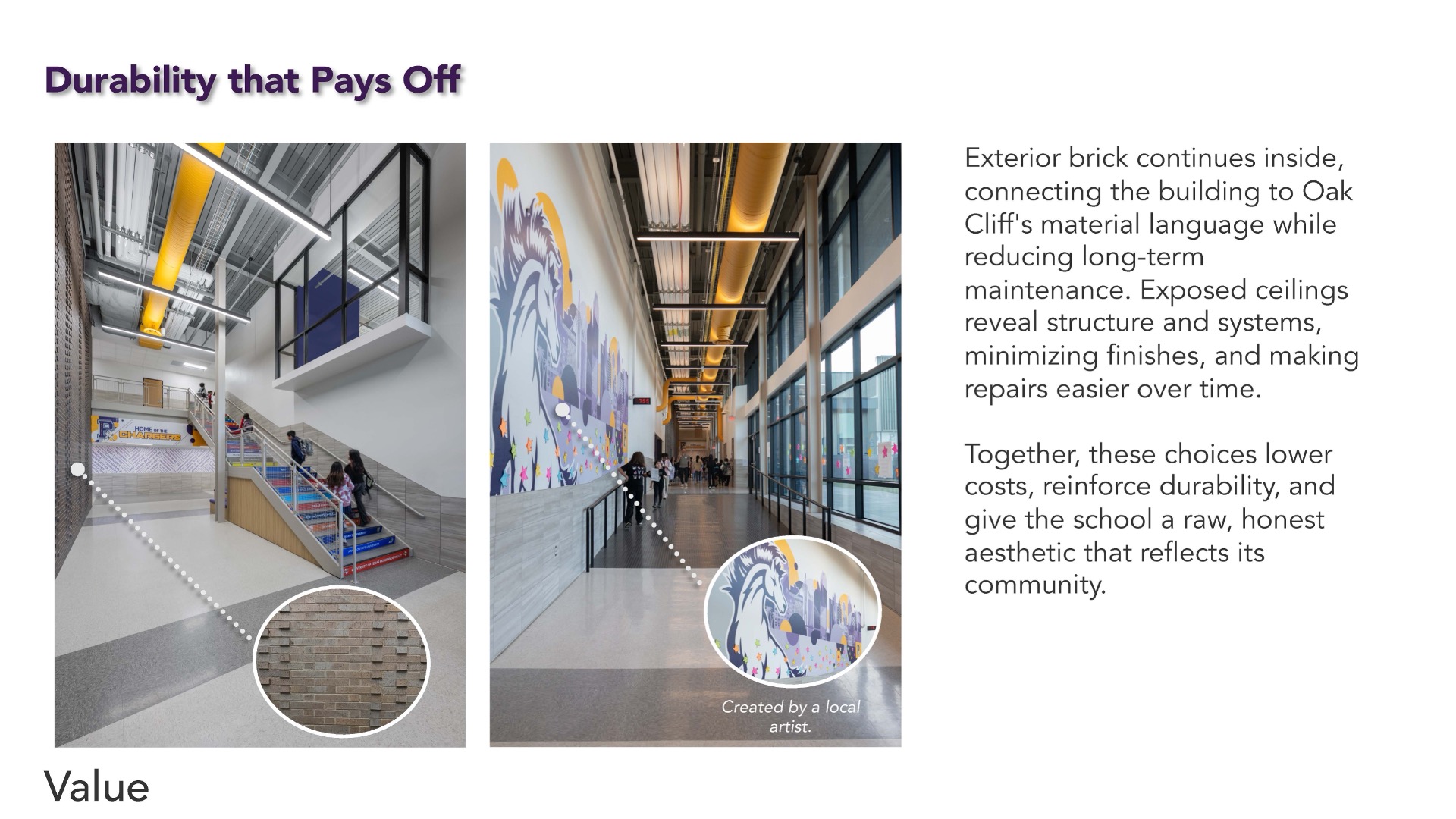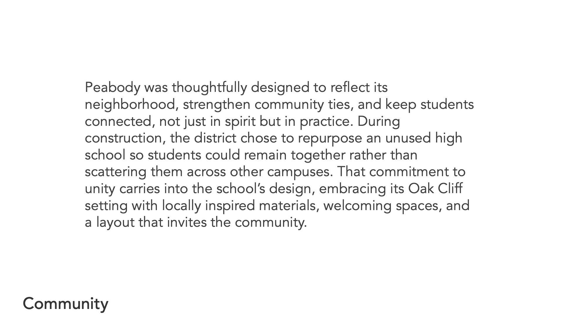 Peabody was thoughtfully designed to reflect its neighborhood, strengthen community ties, and keep students connected, not just in spirit but in practice. During construction, the district chose to repurpose an unused high school so students could remain together rather than scattering them across other campuses. That commitment to unity carries into the school’s design, embracing its Oak Cliff setting with locally inspired materials, welcoming spaces, and a layout that invites the community.