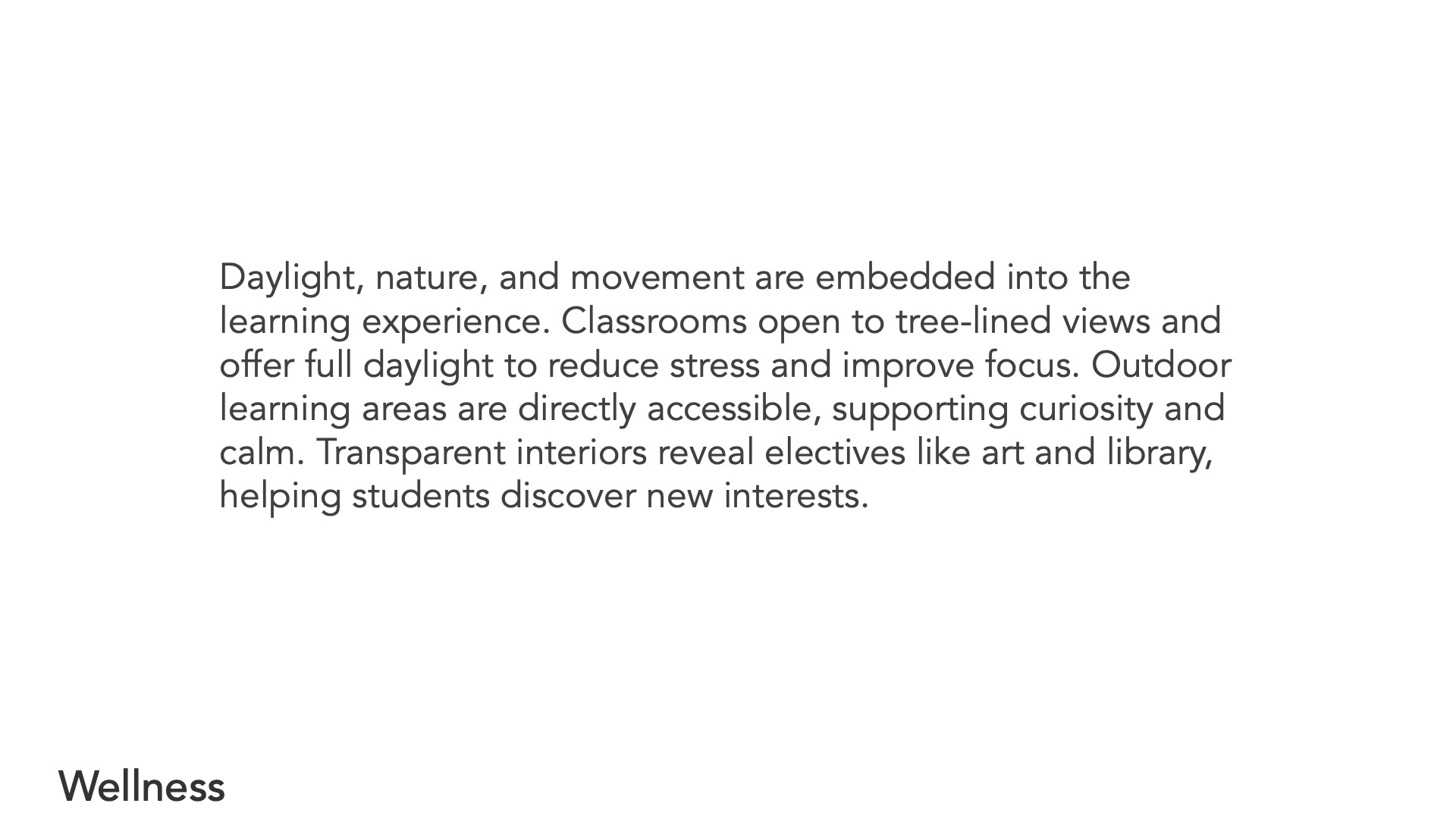 Daylight, nature, and movement are embedded into the learning experience. Classrooms open to tree-lined views and offer full daylight to reduce stress and improve focus. Outdoor learning areas are directly accessible, supporting curiosity and calm. Transparent interiors reveal electives like art and library, helping students discover new interests.