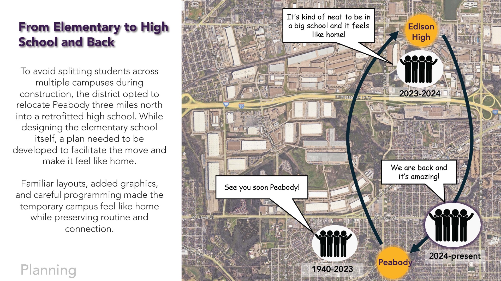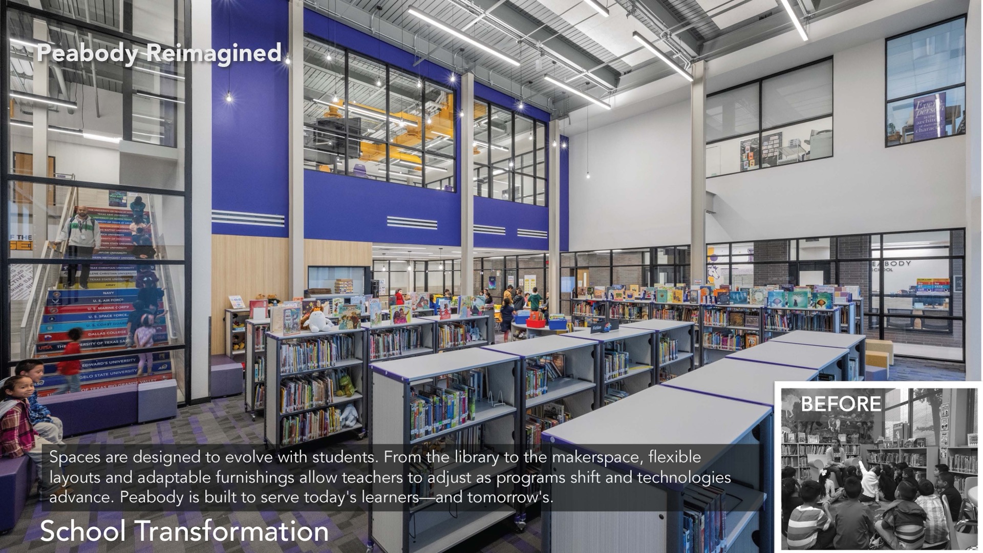 Peabody’s transformation is more than visual—it reshapes how students learn and teachers connect. Once-isolated classrooms are now part of a visible, collaborative learning landscape. Students see art, library, and makerspace from shared spaces. Teachers co-plan and support each other across flexible zones. It’s not just a better building—it’s a different kind of school: open, adaptive, and full of possibility.