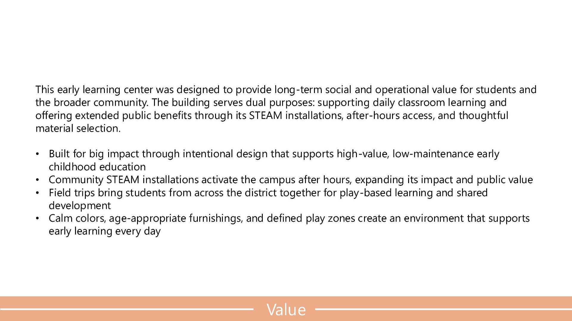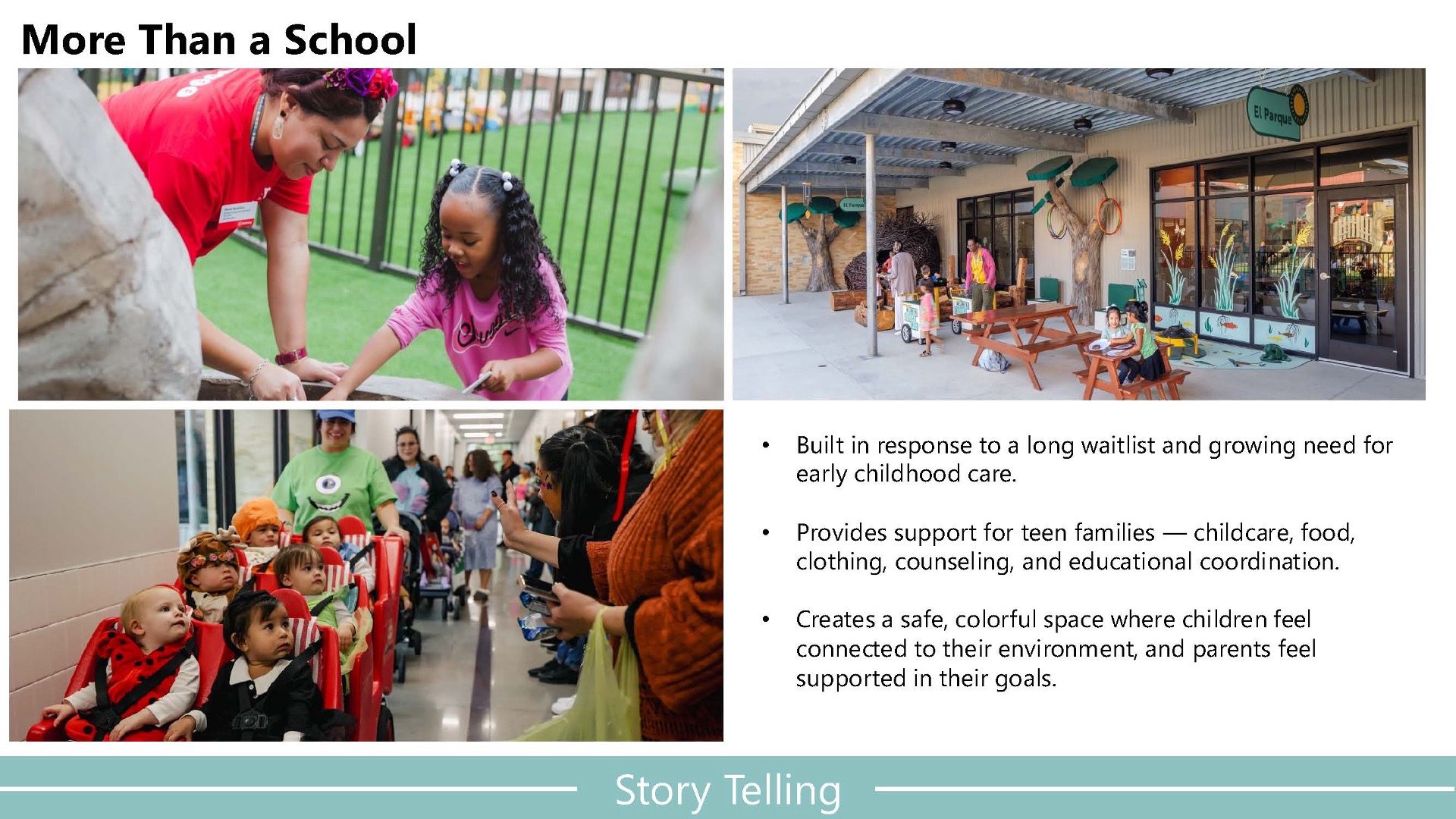 “Purpose-built early childhood center to replace portables; supports infants, toddlers, pre-K, teen moms, and community STEAM partnership;