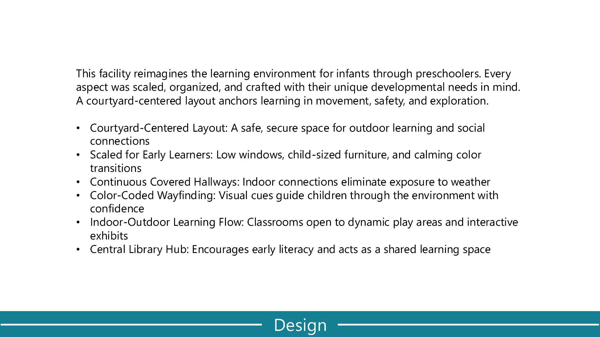 The Central CDC replaces aging portables with a permanent home rooted in care and play. The courtyard remains the center, where infants to preschoolers explore and build independence. Classrooms open to outdoor learning. STEAM partnerships extend learning for children and families beyond the school day.”