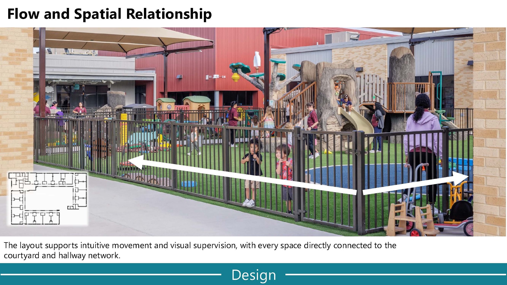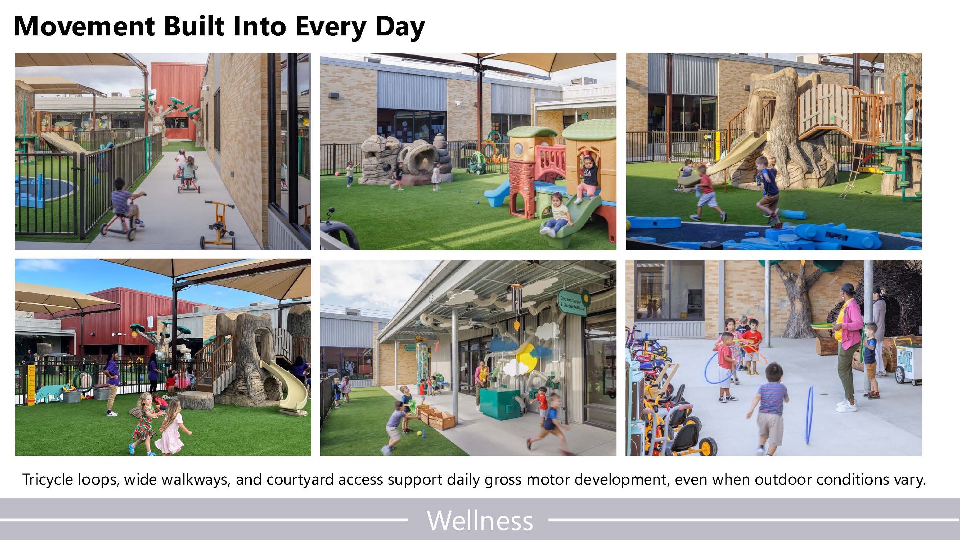 Wellness is embedded in daily experiences. Secure trike loops, STEAM play installations, and sensory-responsive finishes support self-regulation, motor development, and joyful exploration. Zoned spaces, clear sightlines, and indoor-outdoor learning create safe, supportive environments for young children to thrive.