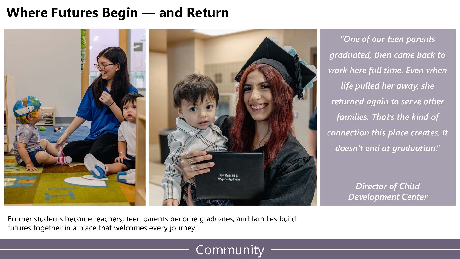 The campus reflects the community’s culture while supporting teen parents and working families. Flexible spaces and extended access strengthen connections between families, schools, and the broader community.
