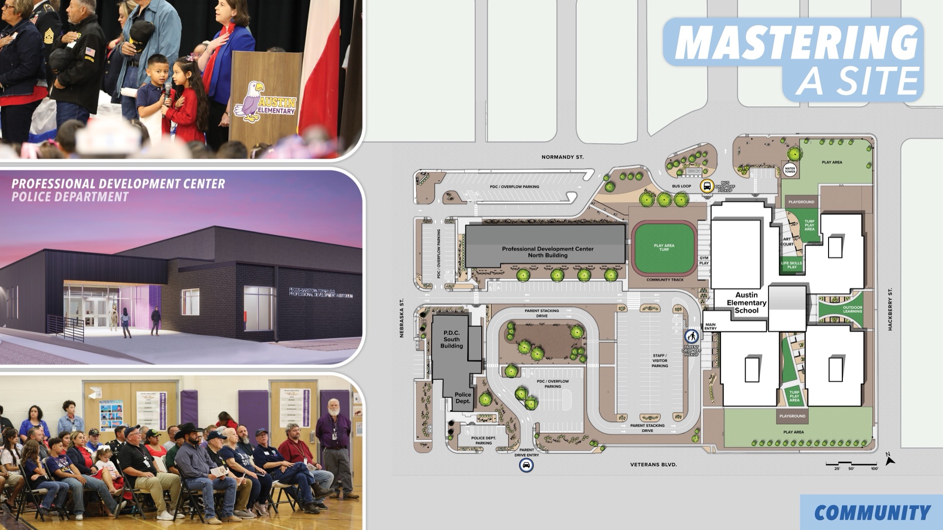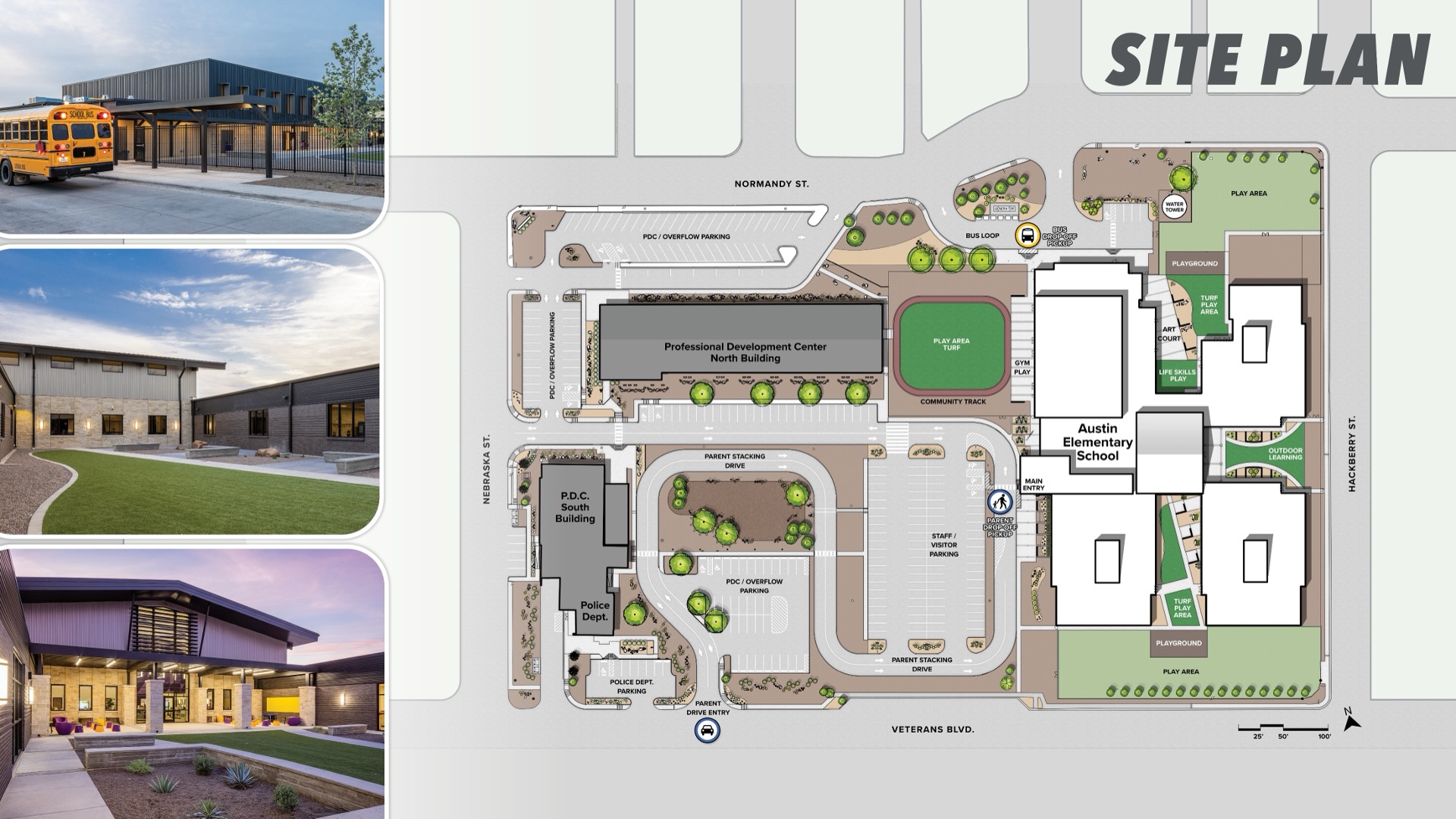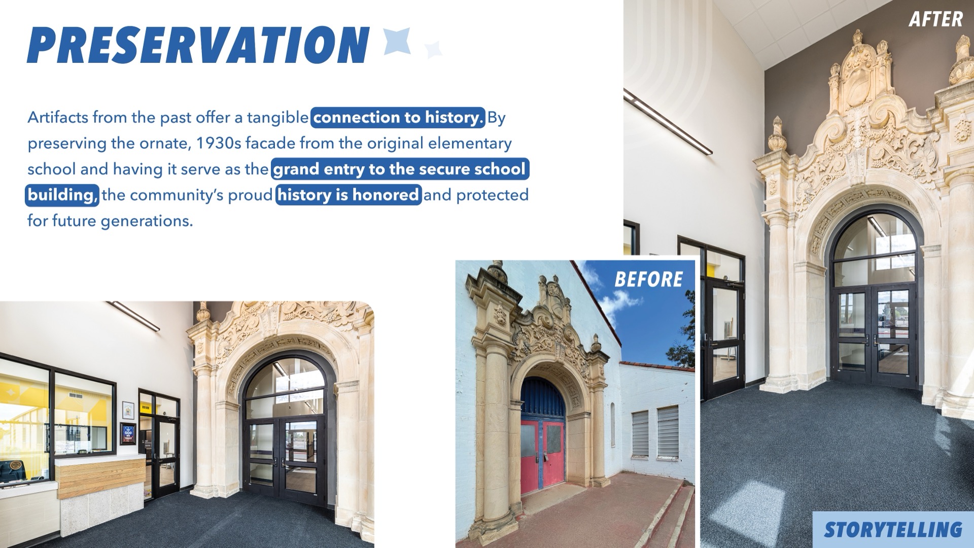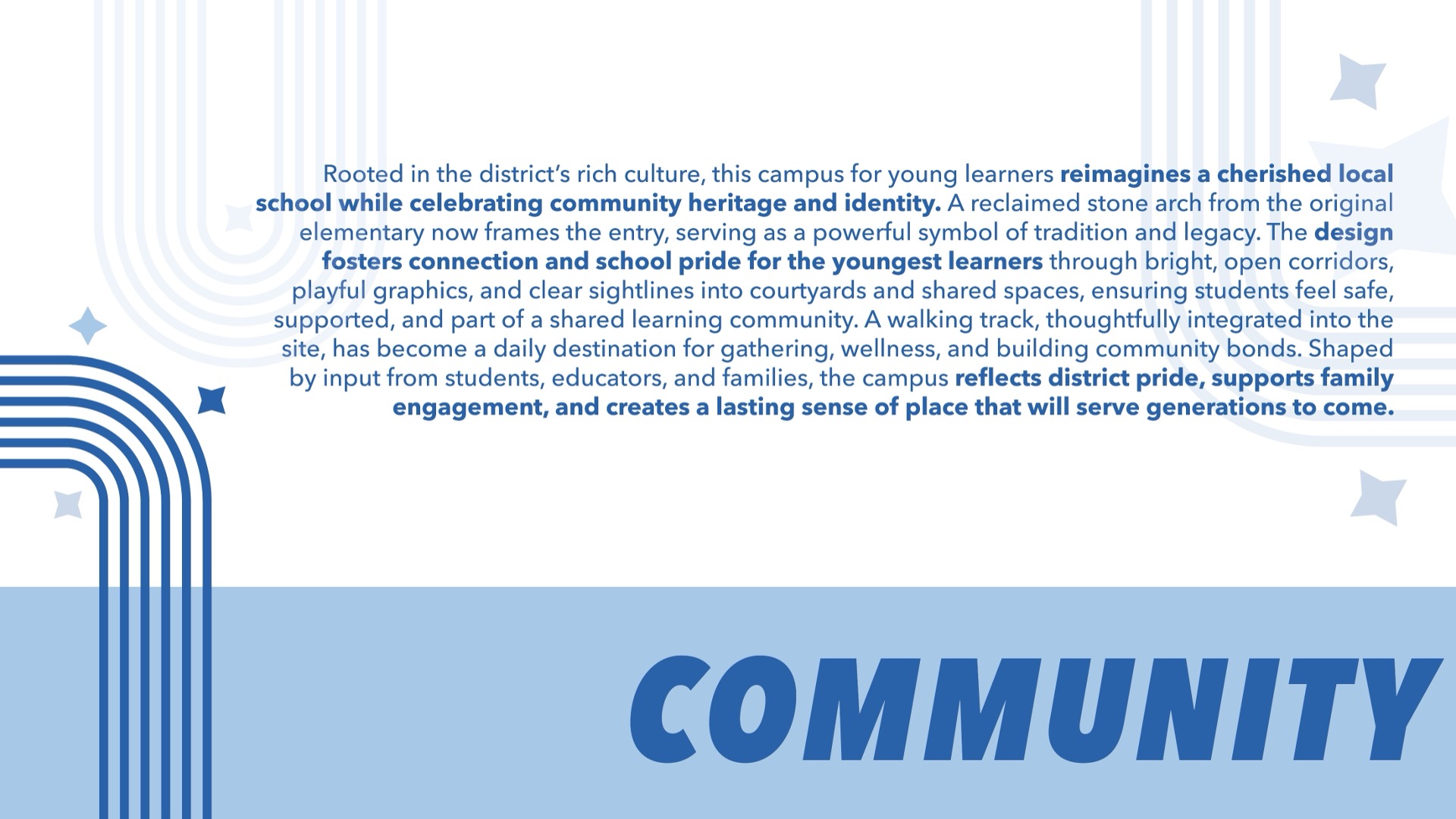 Rooted in the district’s rich culture, this campus for young learners reimagines a cherished local school while celebrating community heritage and identity. A reclaimed stone arch from the original elementary now frames the entry, serving as a powerful symbol of tradition and legacy. The design fosters connection and school pride for the youngest learners through bright, open corridors, playful graphics, and clear sightlines into courtyards and shared spaces, ensuring students feel safe, supported, and part of a shared learning community. A walking track, thoughtfully integrated into the site, has become a daily destination for gathering, wellness, and building community bonds. Shaped by input from students, educators, and families, the campus reflects district pride, supports family engagement, and creates a lasting sense of place that will serve generations to come.