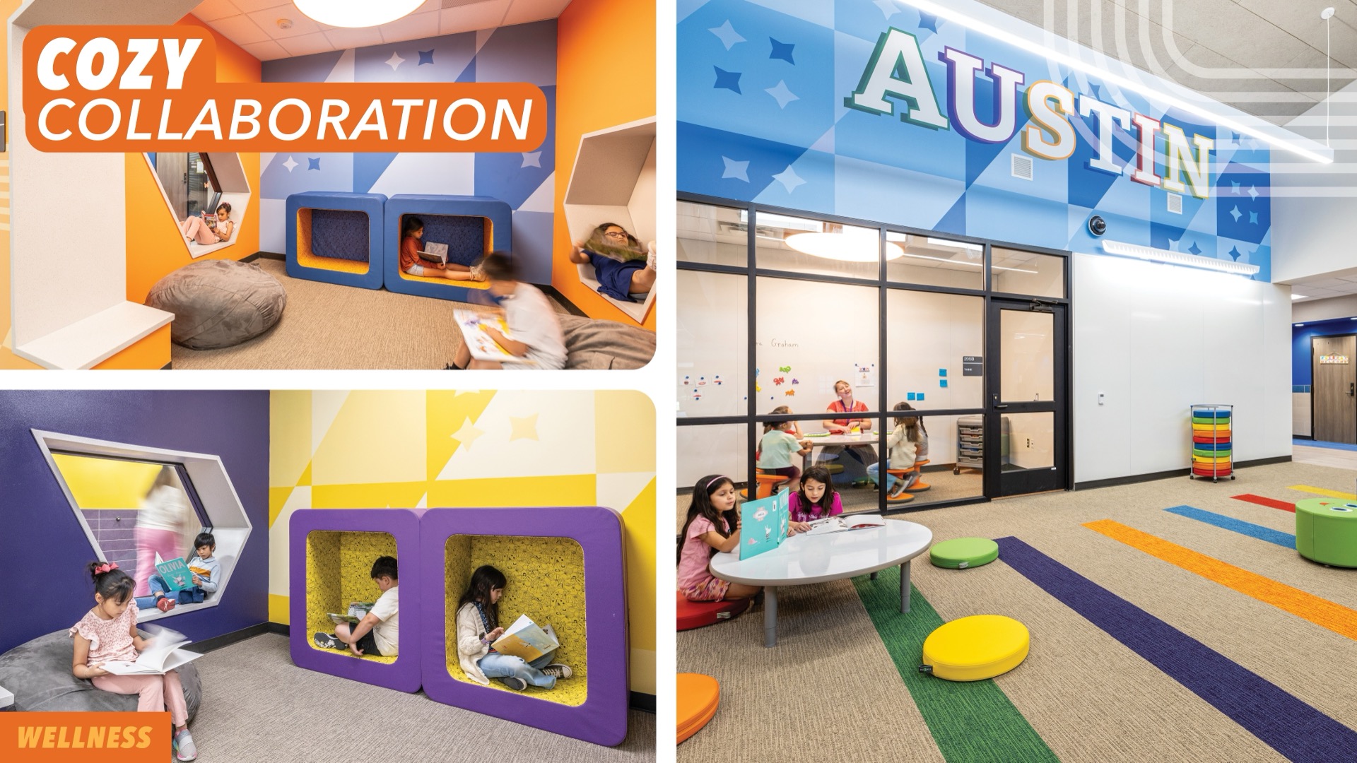 Designed with early learners in mind and guided by intentional planning, the learning environment nurtures the whole child by integrating wellness into every element of the educational experience. High and wide windows fill the building with natural light, creating a bright and uplifting atmosphere. The vibrant, light-filled library features cozy reading nooks and age-appropriate collaboration spaces, empowering students to choose how and where they learn best while fostering comfort, agency, and exploration. Three playful outdoor courtyards promote movement, discovery, and joyful learning with soft turf, a covered play area for all-weather fun, and secure, curiosity-sparking spaces designed for young children. A centrally located counselor’s office ensures emotional support is always within reach. These intentional design choices create a safe, inclusive, and inspiring setting where young learners thrive.
