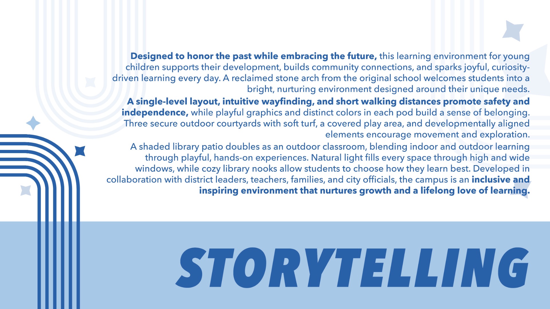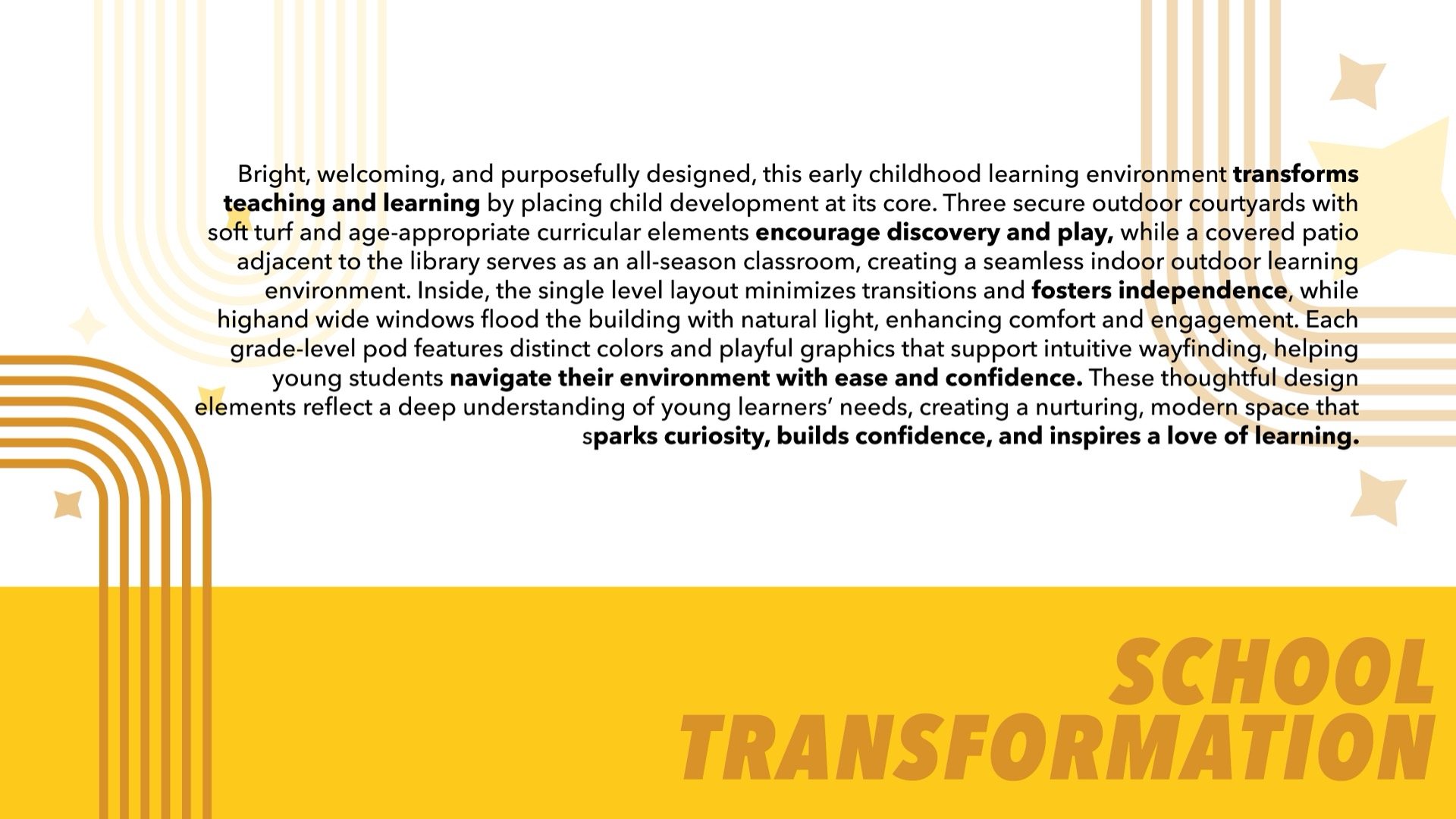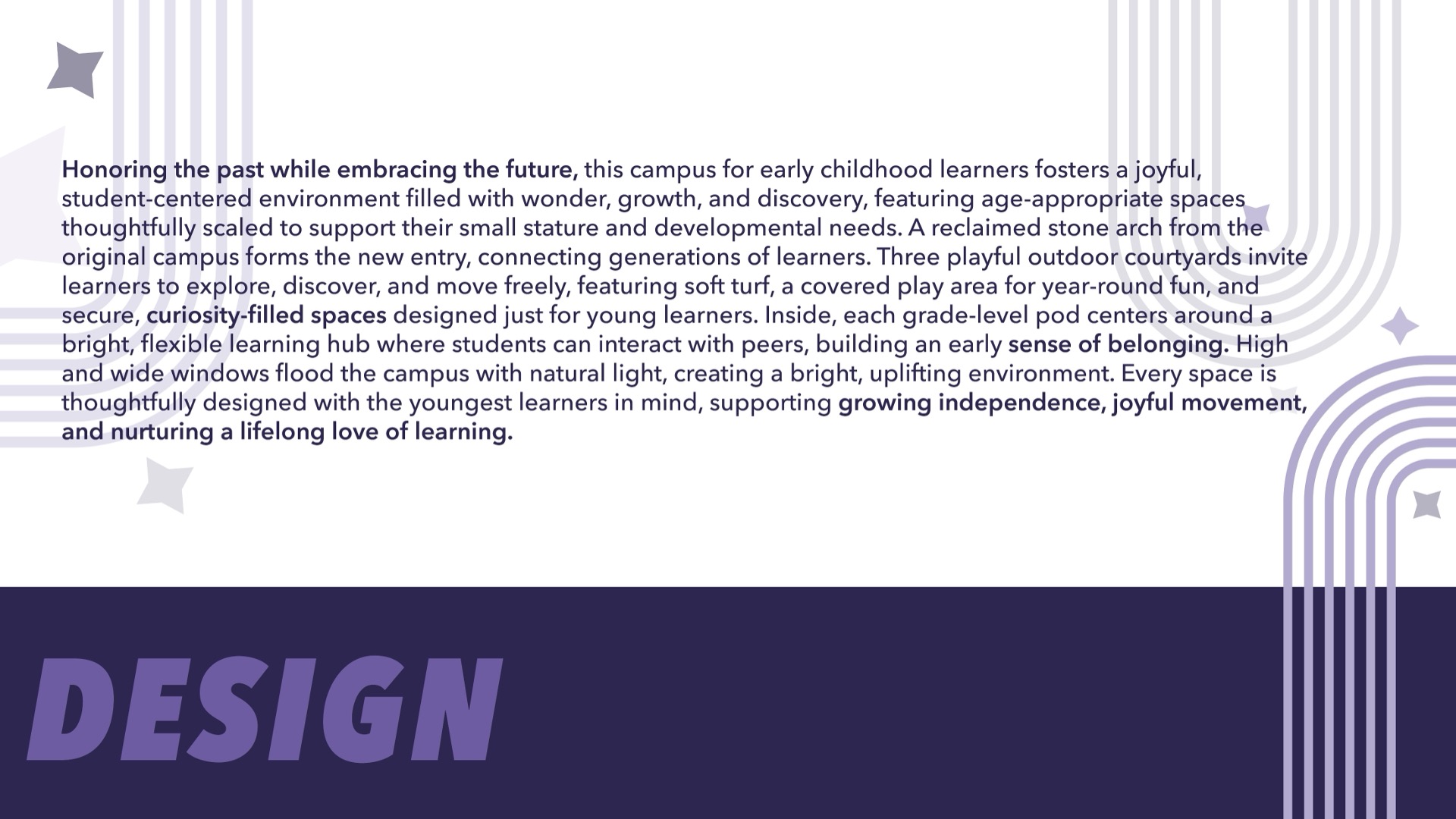 Honoring the past while embracing the future, this campus for early childhood learners fosters a joyful, student-centered environment filled with wonder, growth, and discovery, featuring age-appropriate spaces thoughtfully scaled to support their small stature and developmental needs. A reclaimed stone arch from the original campus forms the new entry, connecting generations of learners. Three playful outdoor courtyards invite learners to explore, discover, and move freely, featuring soft turf, a covered play area for year-round fun, and secure, curiosity-filled spaces designed just for young learners. Inside, each grade-level pod centers around a bright, flexible learning hub where students can interact with peers, building an early sense of belonging. High and wide windows flood the campus with natural light, creating a bright, uplifting environment. Every space is thoughtfully designed with the youngest learners in mind, supporting growing independence, joyful movement, and nurturing a lifelong love of learning.