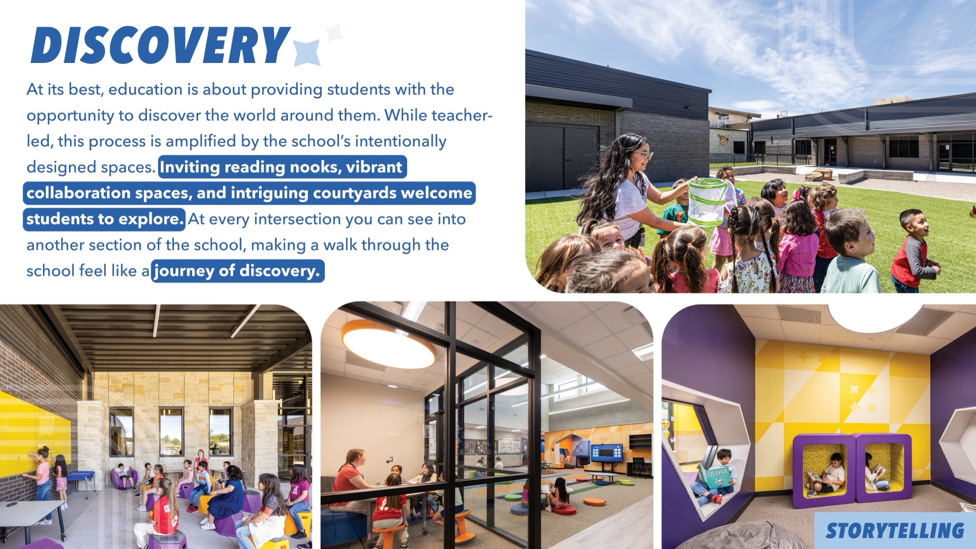 A shaded library patio doubles as an outdoor classroom, blending indoor and outdoor learning through playful, hands-on experiences. Natural light fills every space through high and wide windows, while cozy library nooks allow students to choose how they learn best. Developed in collaboration with district leaders, teachers, families, and city officials, the campus is an inclusive and inspiring environment that nurtures growth and a lifelong love of learning.”